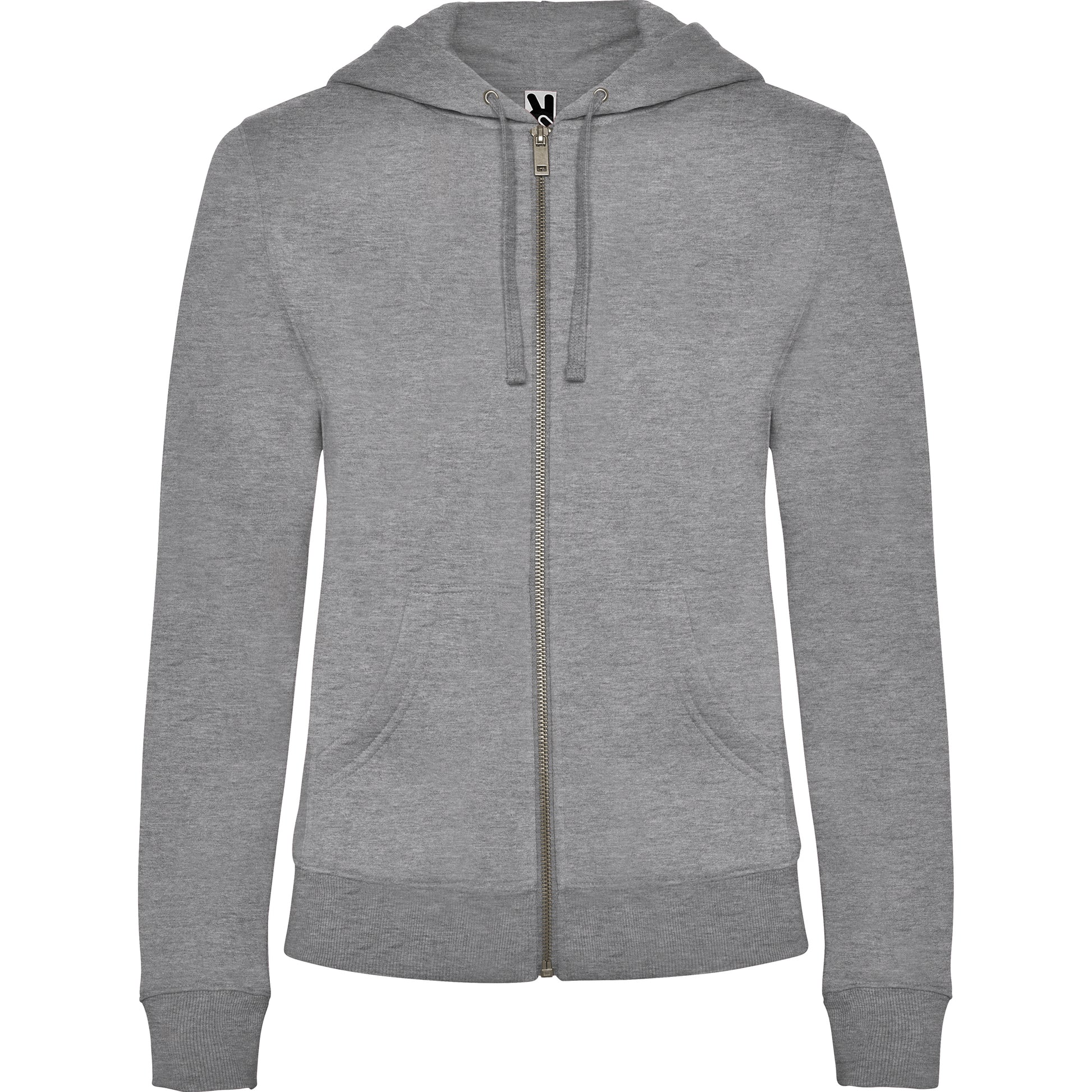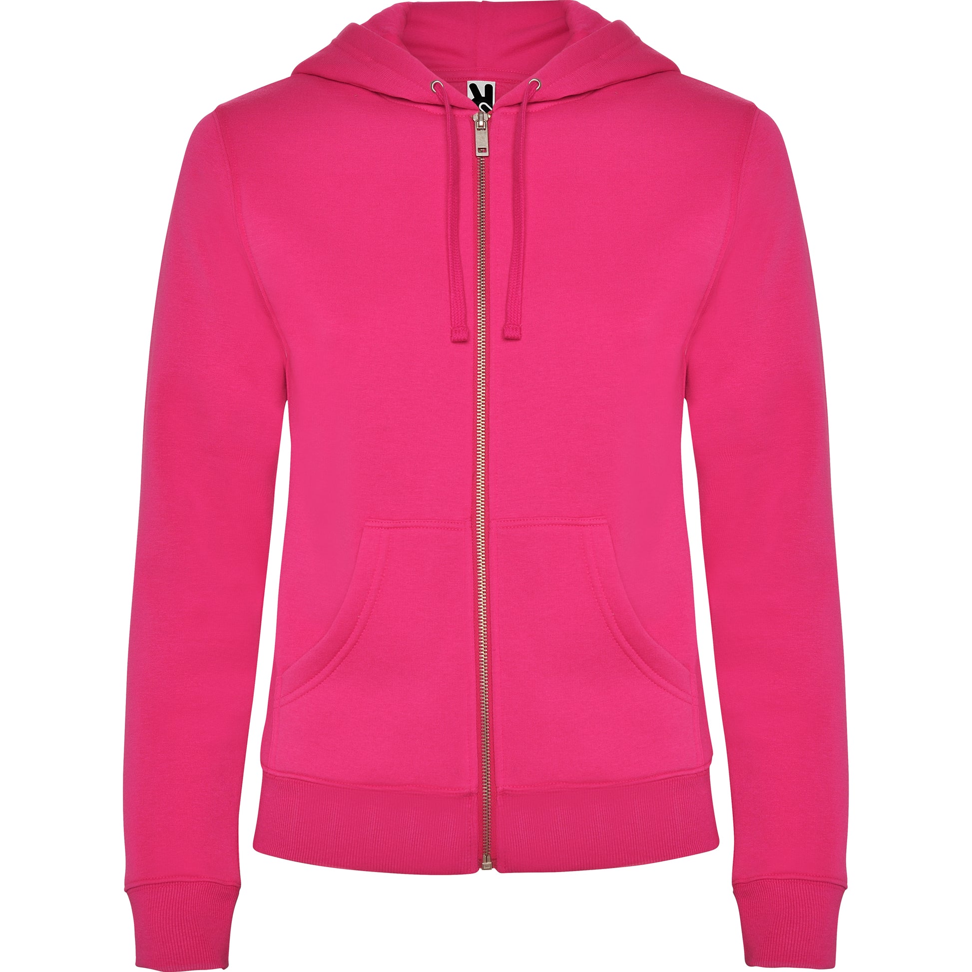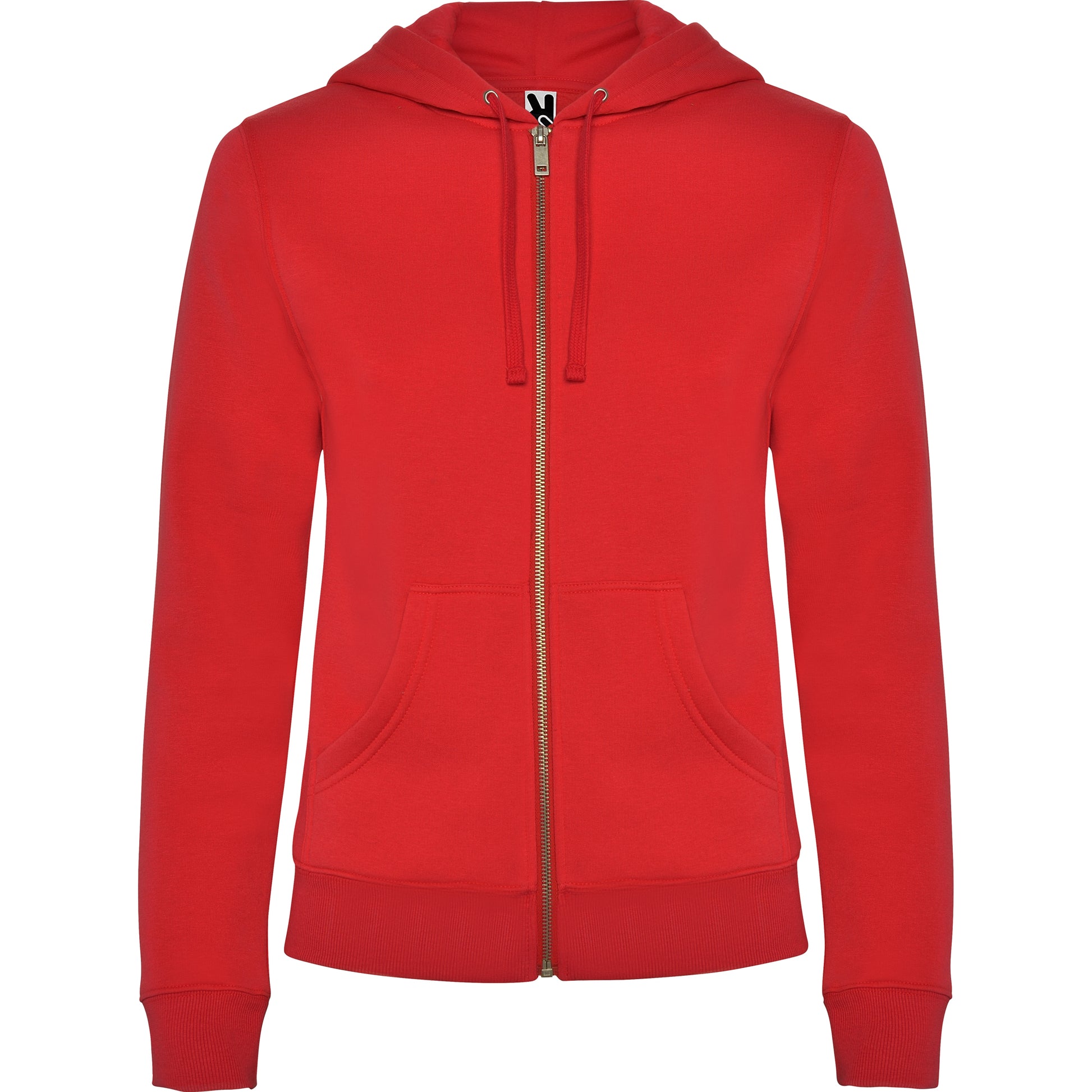 Sudadera de mujer con capucha forrada a tono. Cremallera metálica frontal y bolsillo estilo canguro. Cubrecosturas reforzado en el cuello interior, corte entallado, y punto canalé 2x2 en puños y cintura.