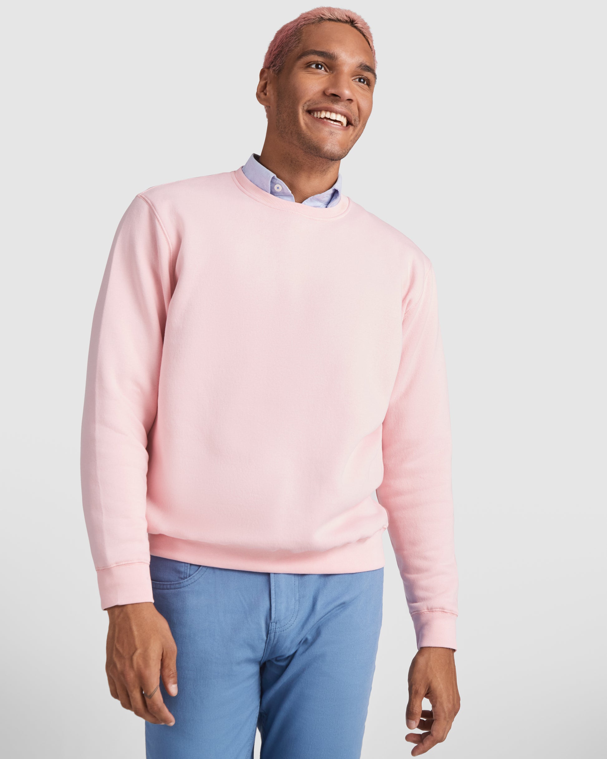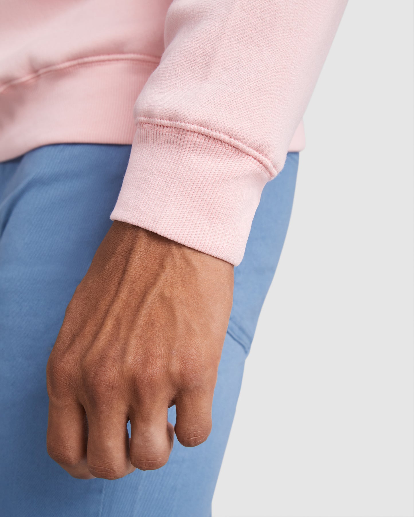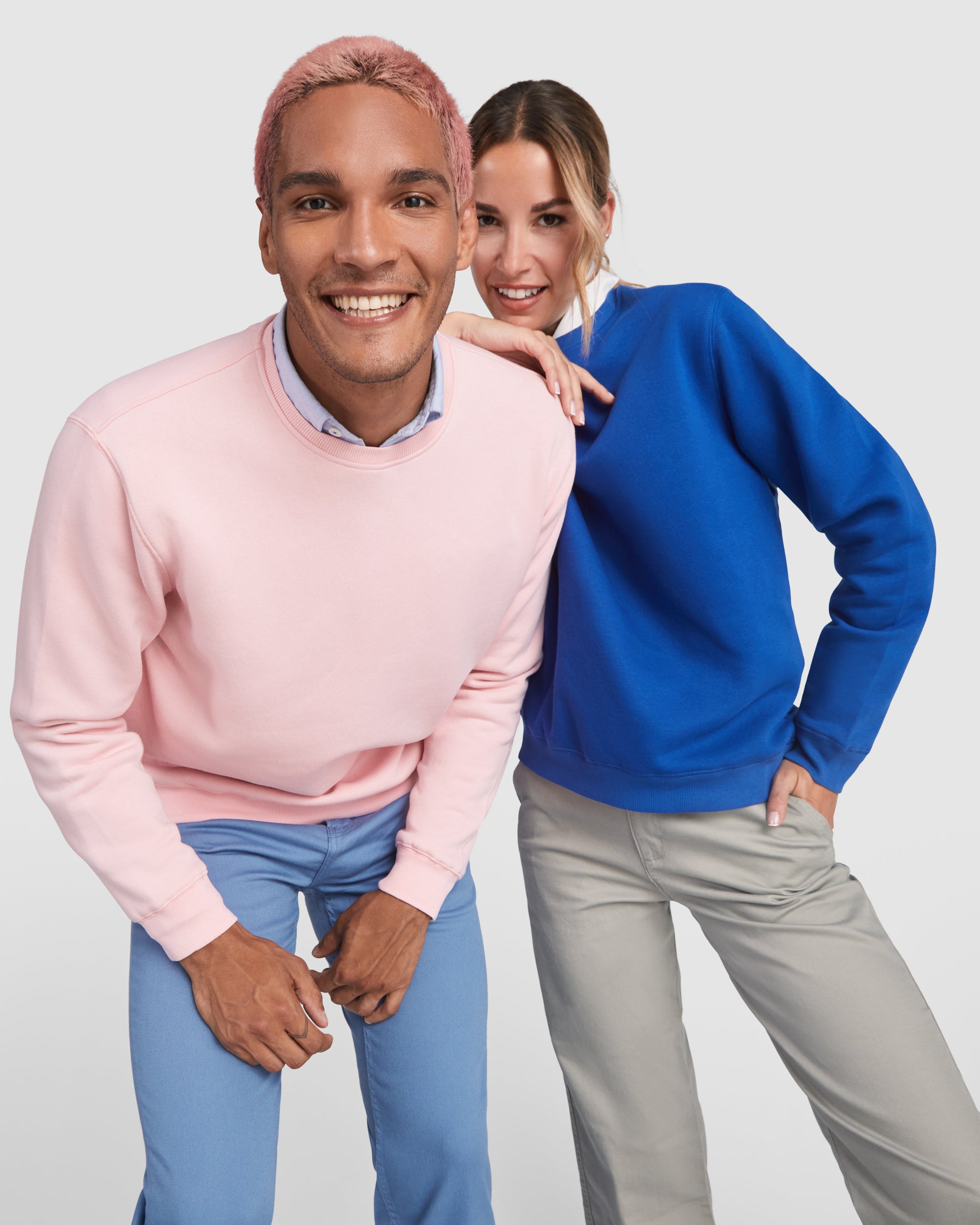 Sudadera Unisex en Algodón Orgánico Peinado y Poliéster Reciclado. Cuello, puños y cinturilla de punto canalé 2x1. Adorno de costuras remalladas en hombro, sisa, cuello, puños y cintura. Media luna en el interior del cuello trasero.