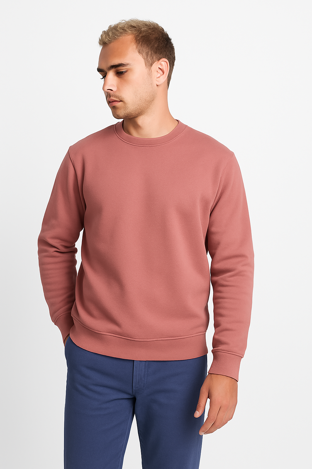 Sudadera en diseño clásico, con cuello, puños y cinturilla de punto canalé 1x1 con elastano. Cubrecosturas reforzado en cuello.