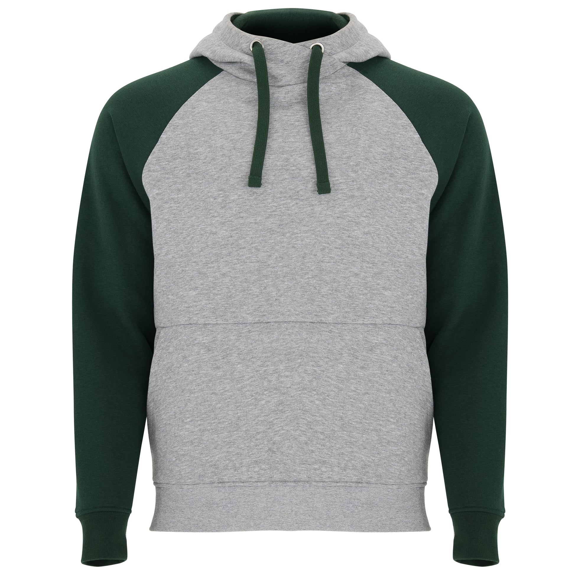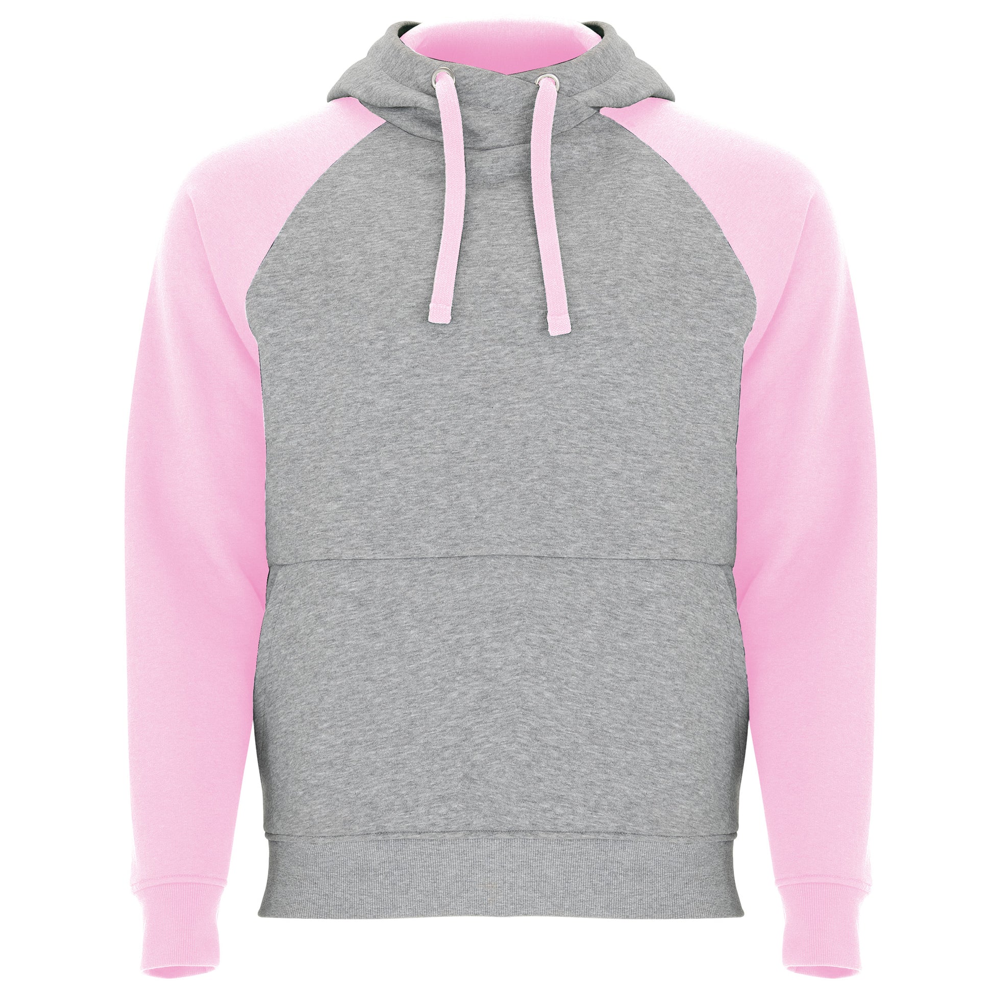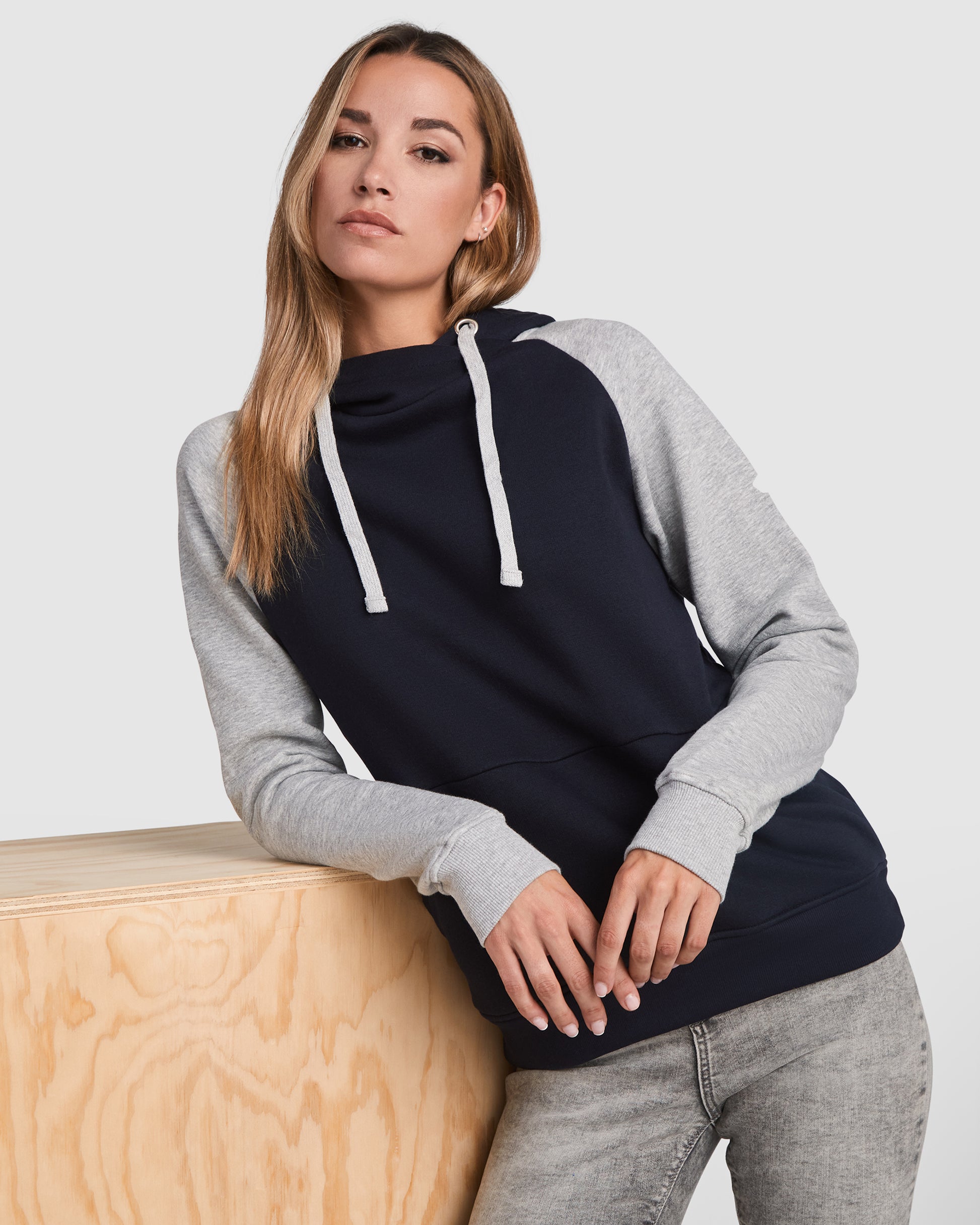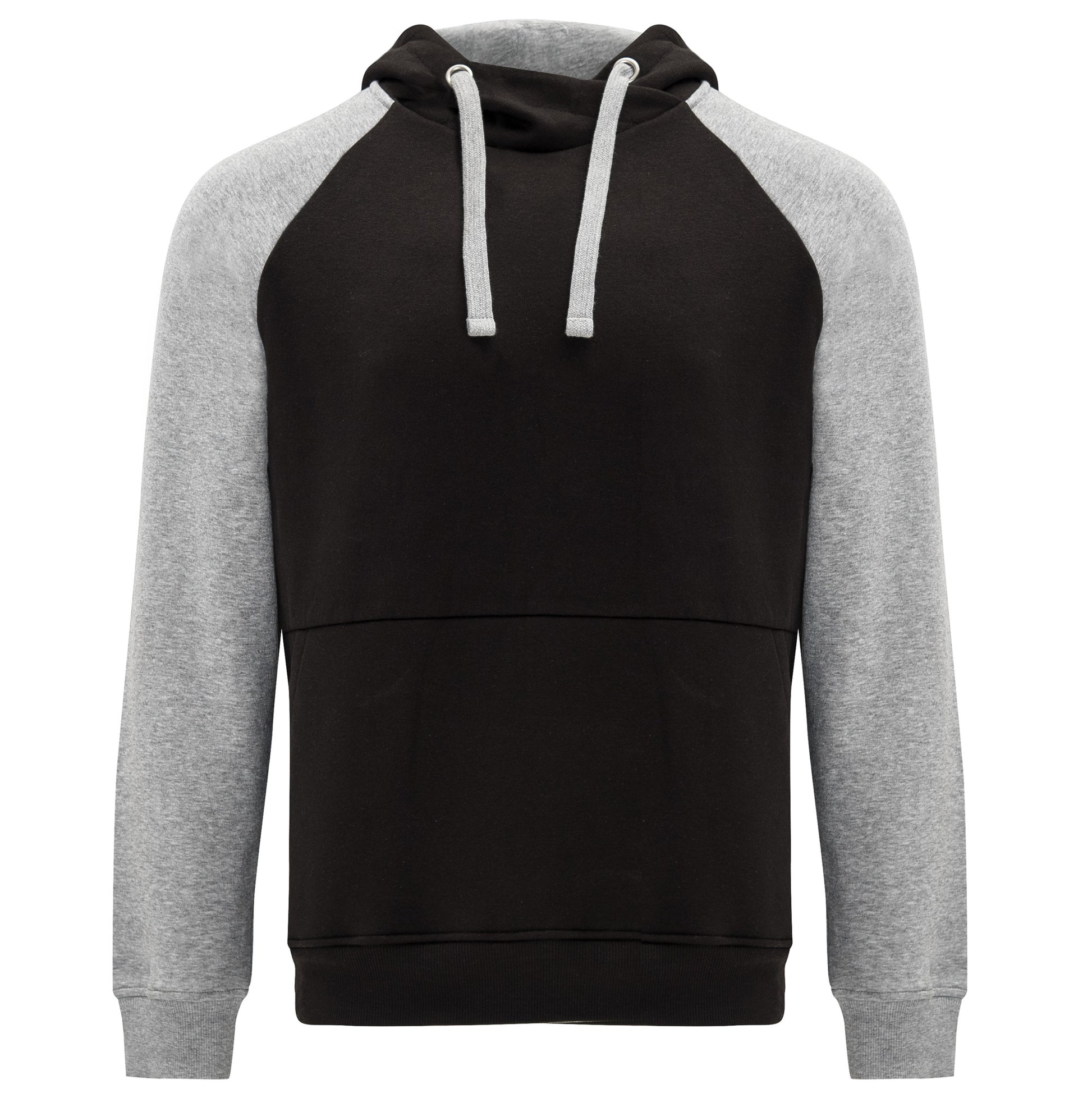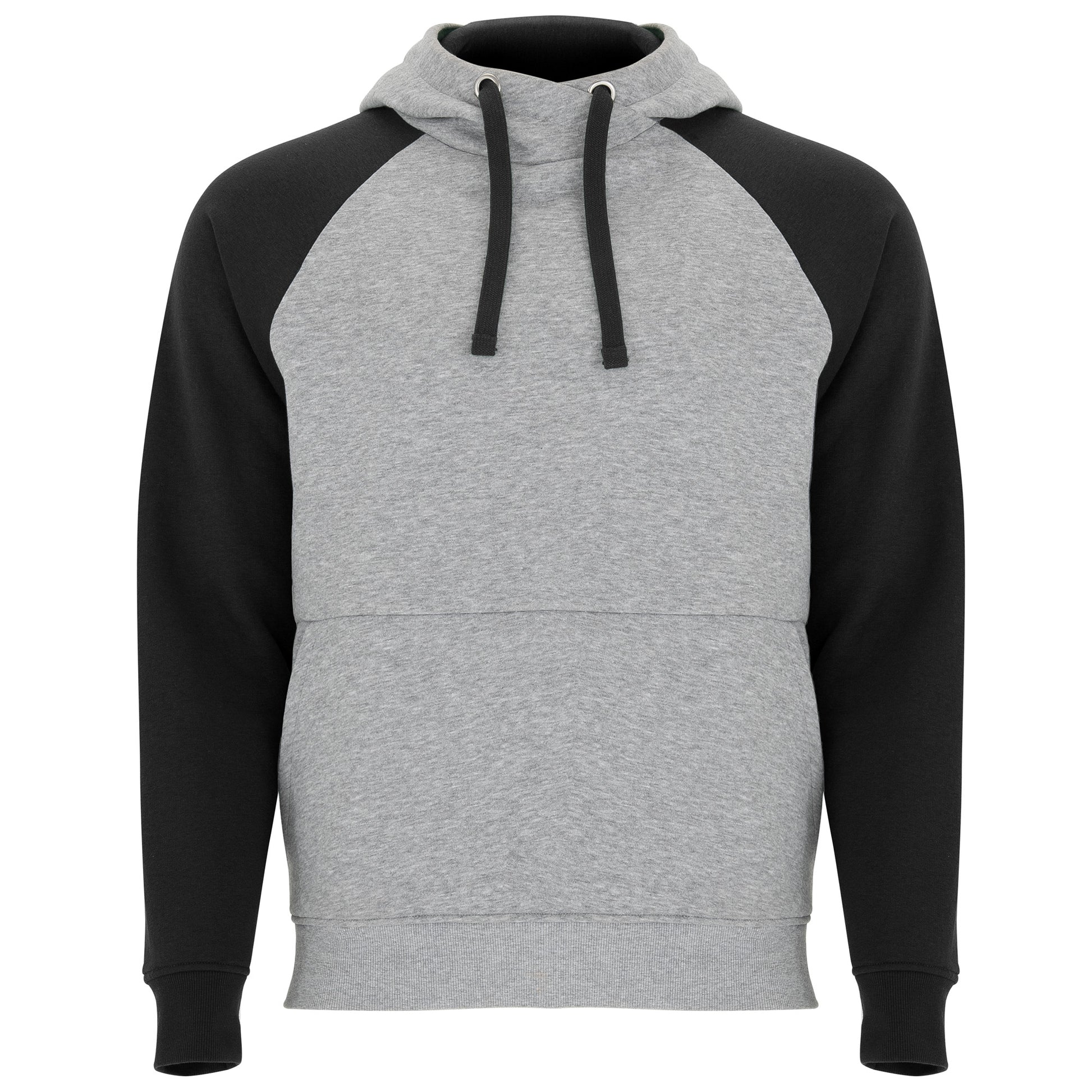 Sudadera bicolor unisex. Capucha con cuello cruzado y ojales metálicos, interior y cordones a contraste. Manga estilo ranglán a contraste. Bolsillo canguro. Puños y bajo con punto canalé con elastano 1x1.