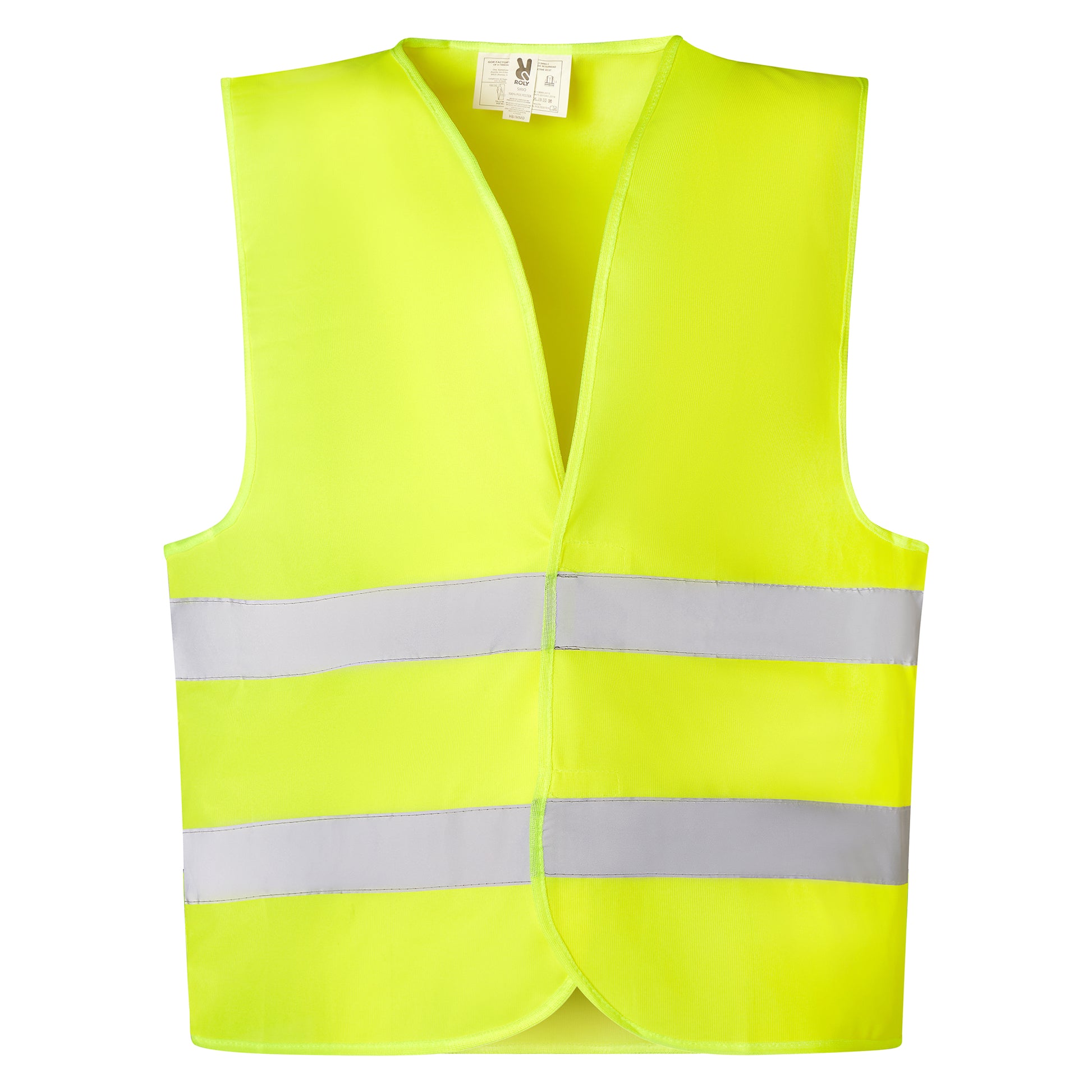 Chaleco alta visibilidad de cuello pico. · Con dos cintas reflectantes en pecho y espalda. · Cierre de velcro ajustable.