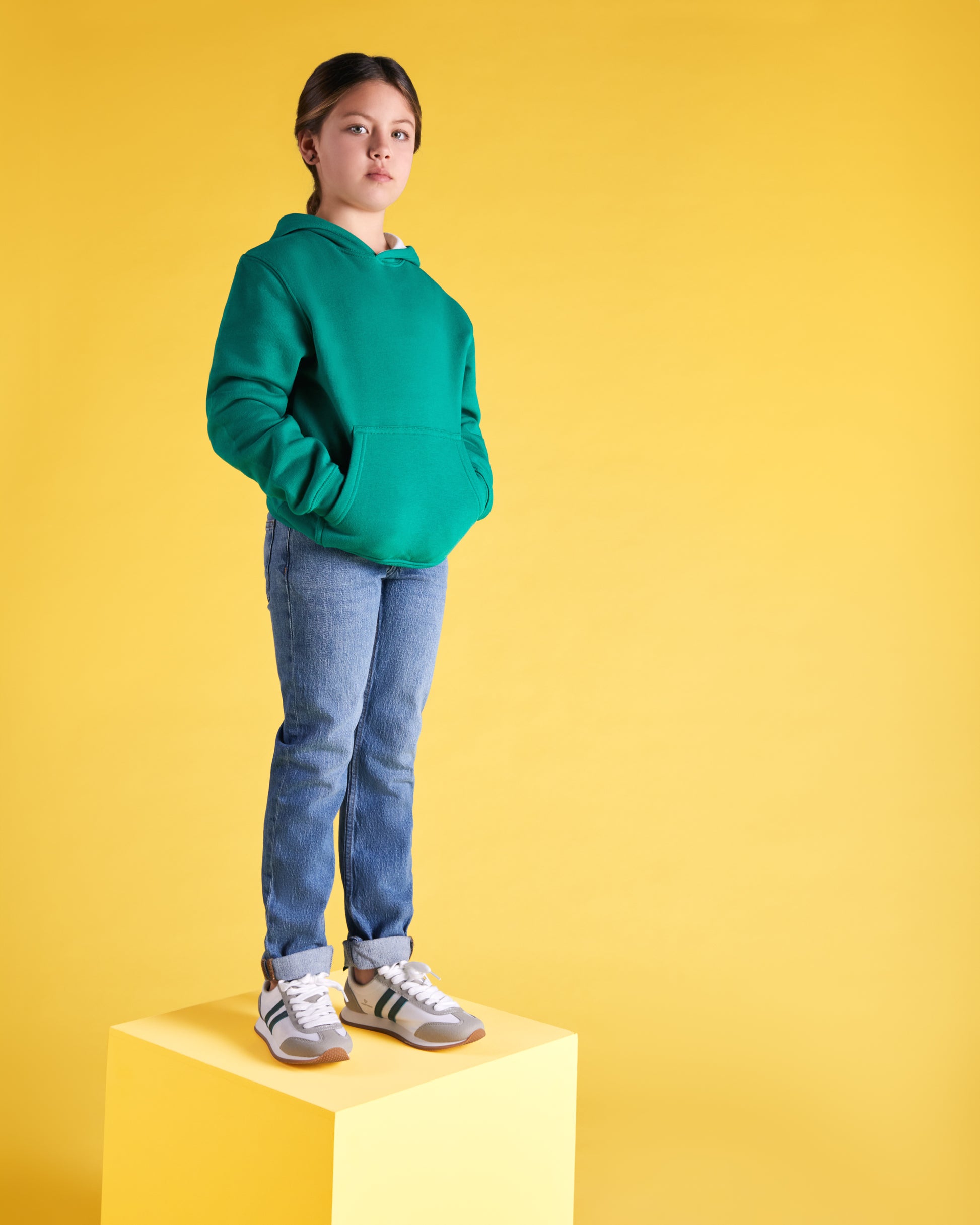 Sudadera con capucha de doble tejido, con cordón ajustable, en acabados sólidos y bicolor. Cubrecosturas en el cuello y bolsillo canguro. Punto canalé con elastano 1x1 en puños y cintura. Modelo de niño sin cordón.