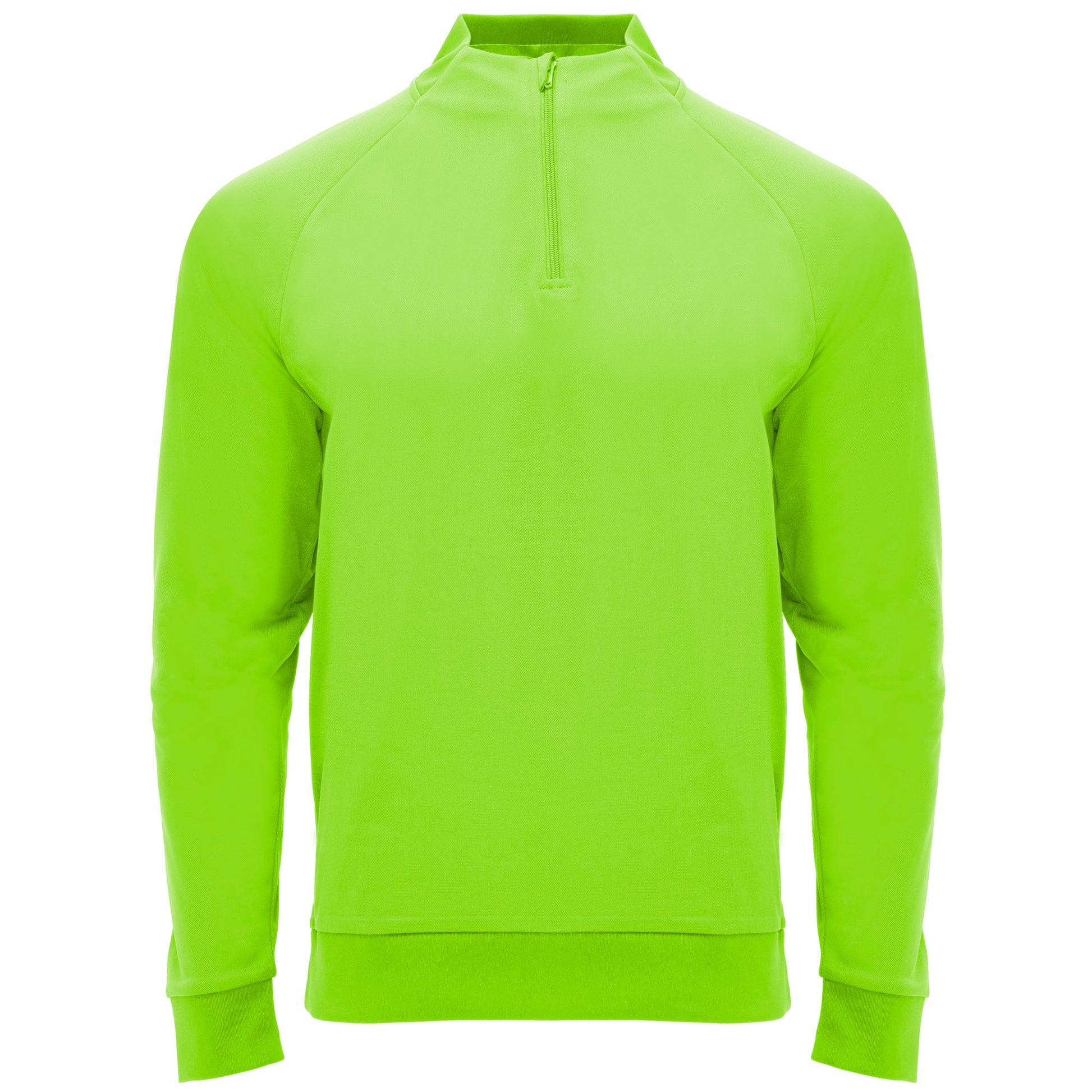 Sudadera de manga ranglán, con Interior perchado, cuello con media cremallera y cubrecosturas de refuerzo en su interior a tono. Parte posterior del cuello, puños y bajo en canalé 1x1.