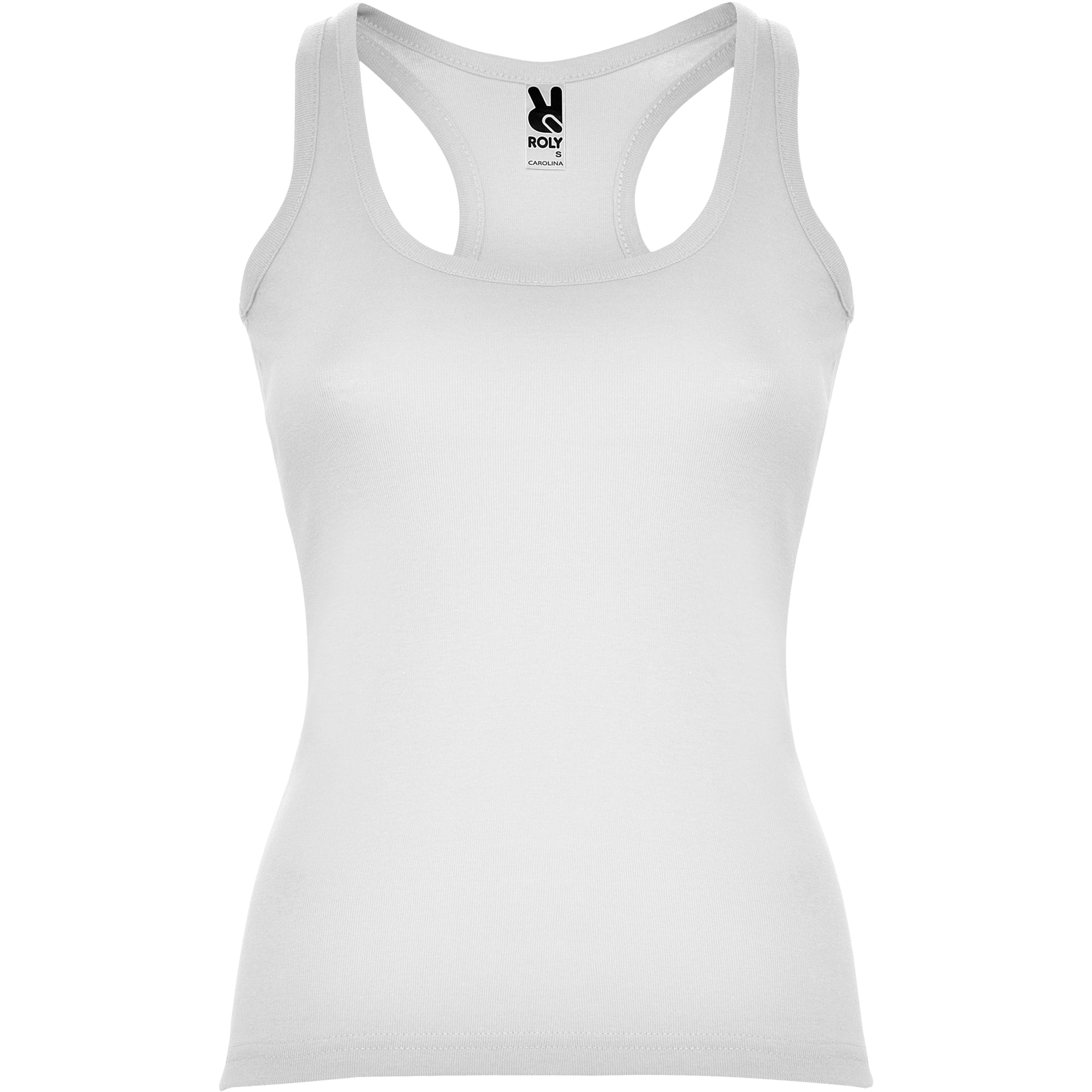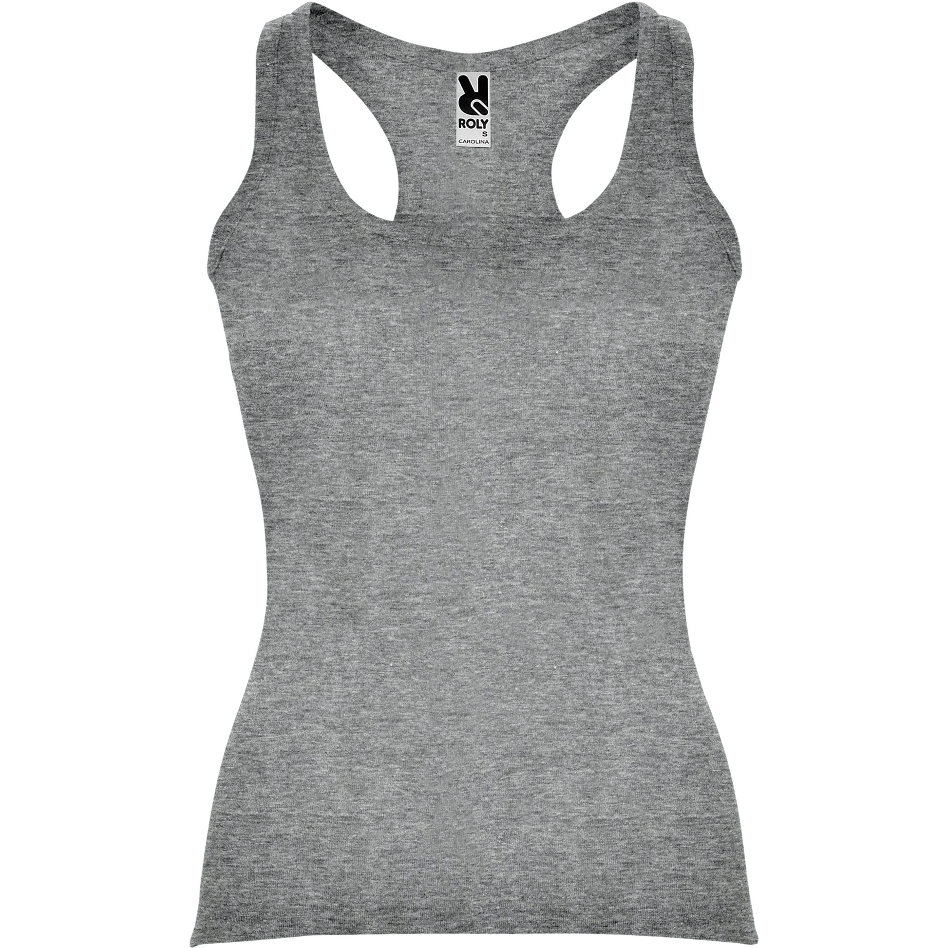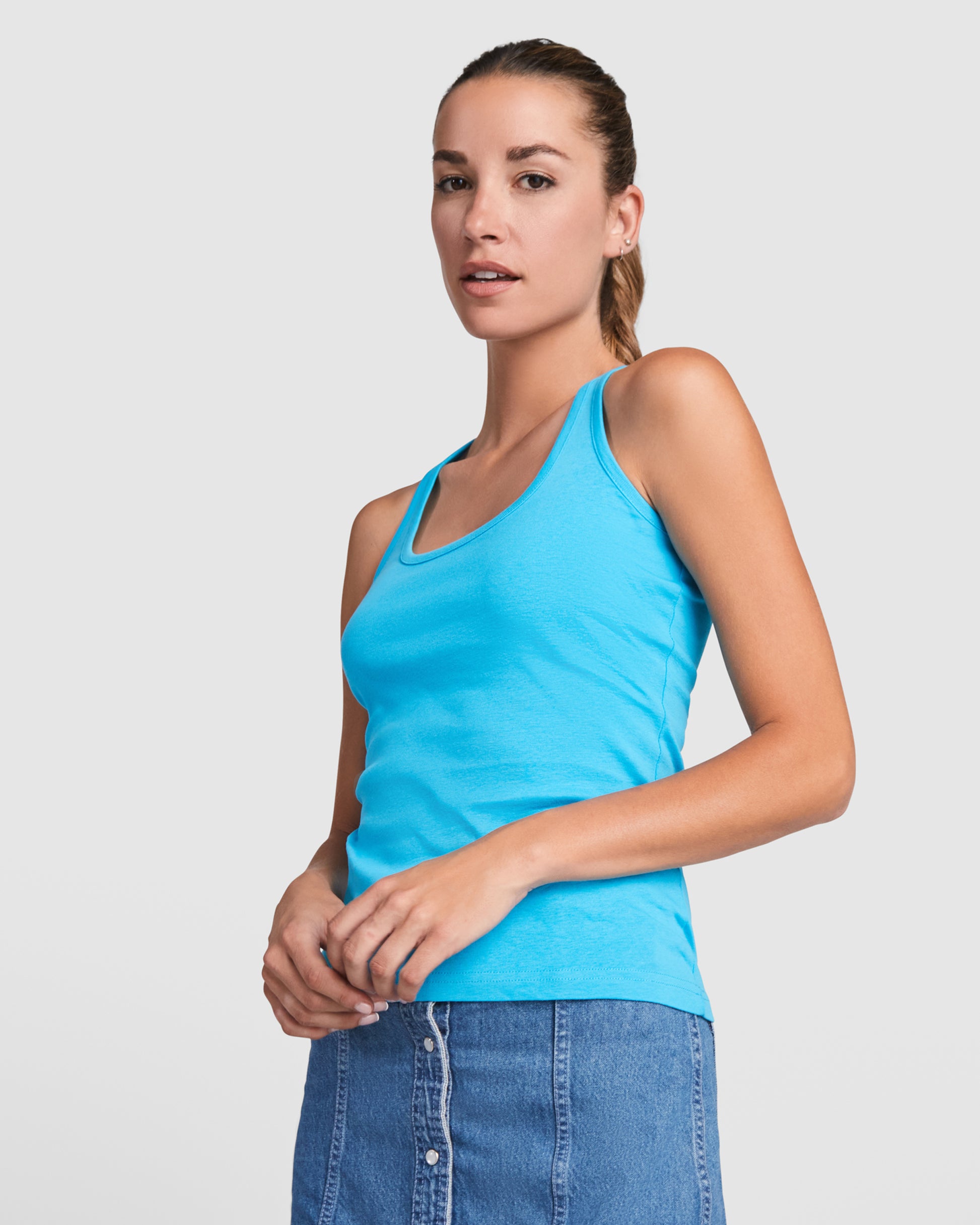 Camiseta entallada, con sisas y escote ribeteado, ancho y enrollado. Espalda estilo nadadora y costuras laterales.
