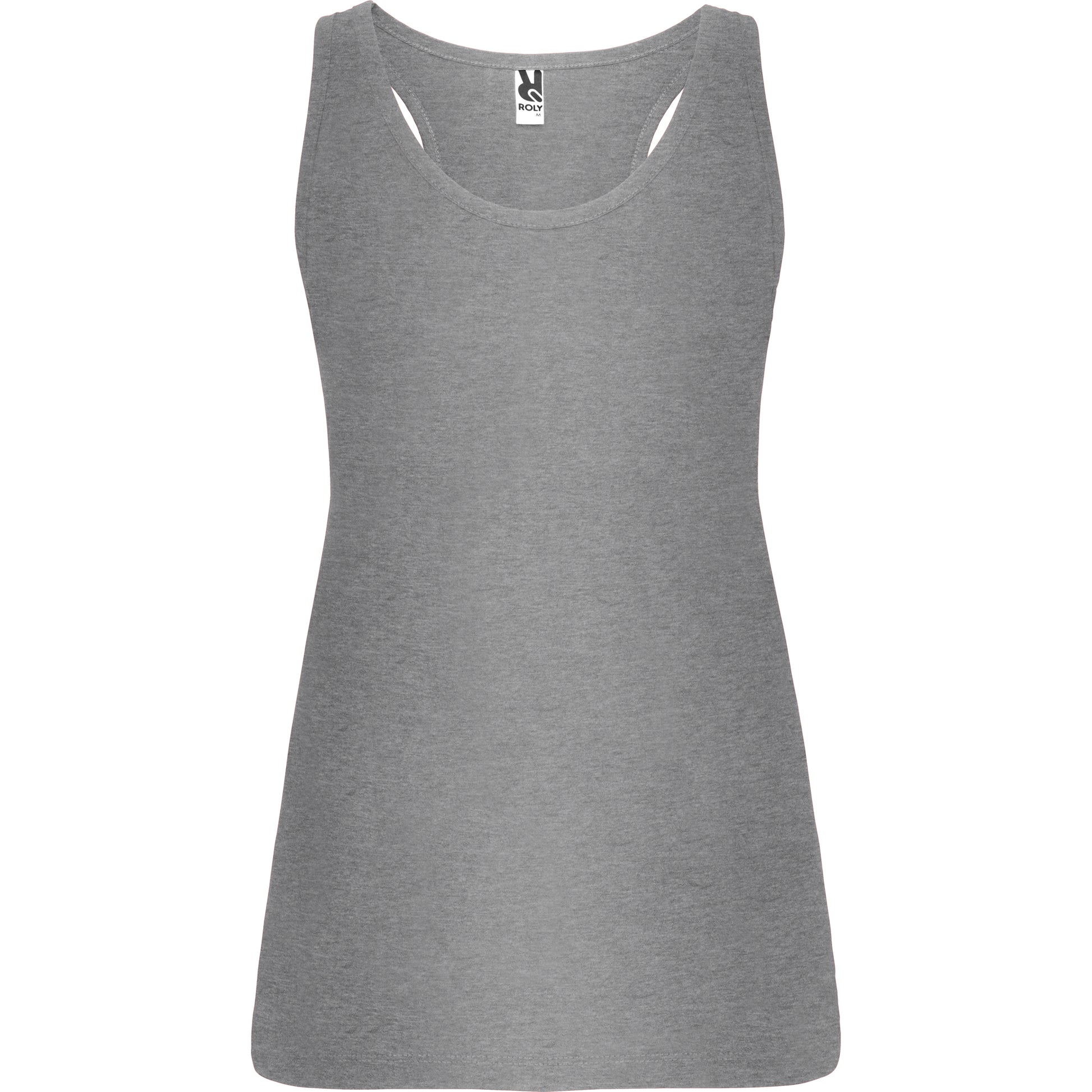 Camiseta entallada, con sisas y escote ribeteado, ancho y enrollado. Espalda estilo nadadora y costuras laterales.