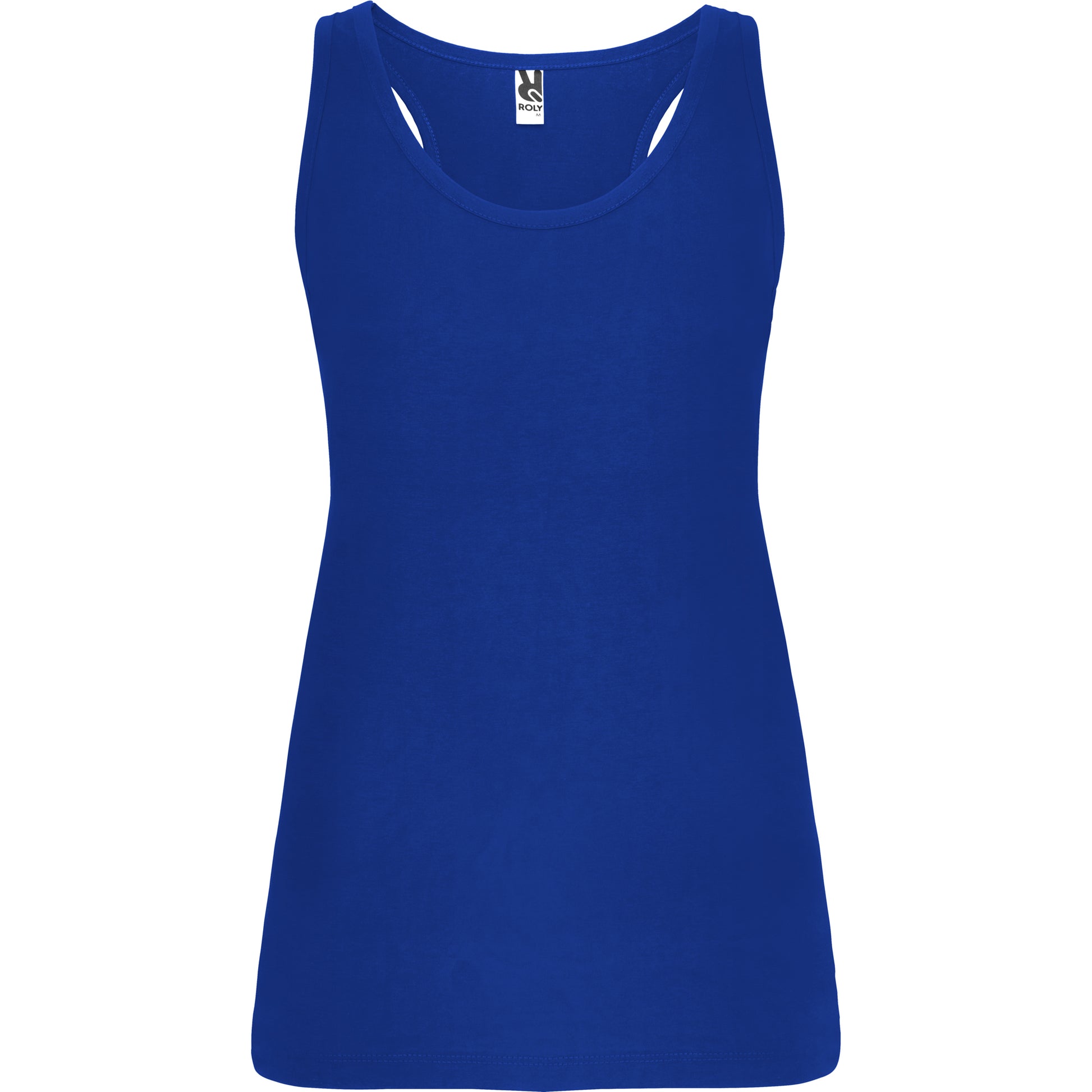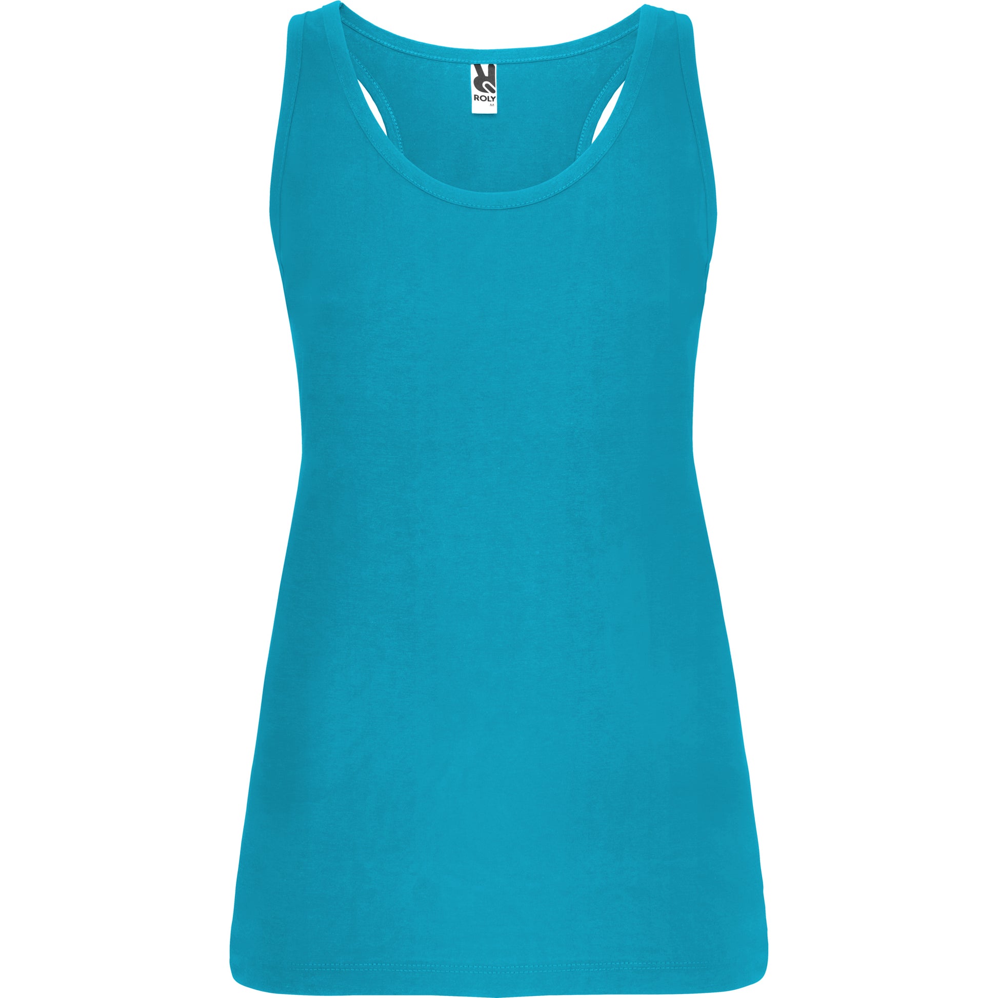 Camiseta entallada, con sisas y escote ribeteado, ancho y enrollado. Espalda estilo nadadora y costuras laterales.