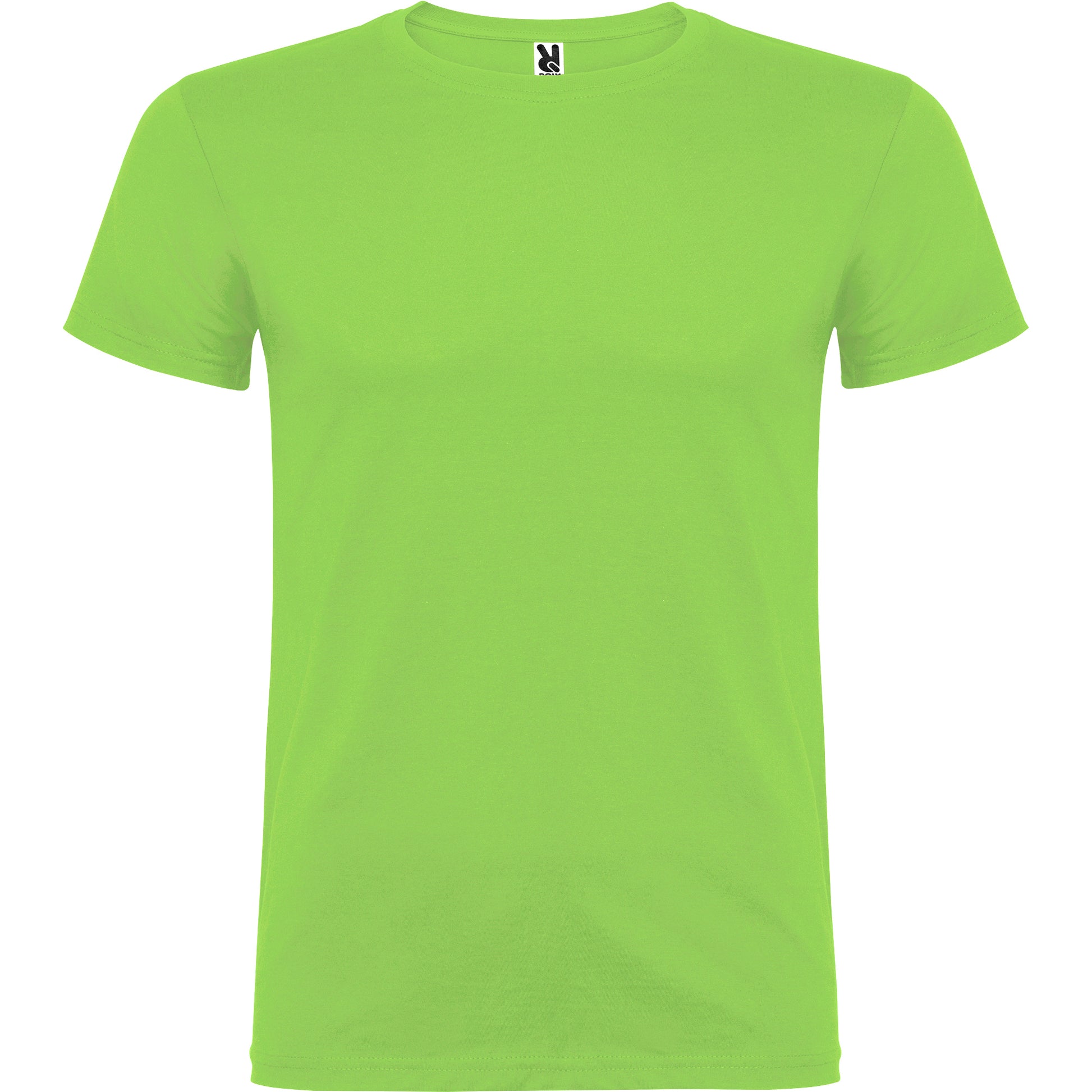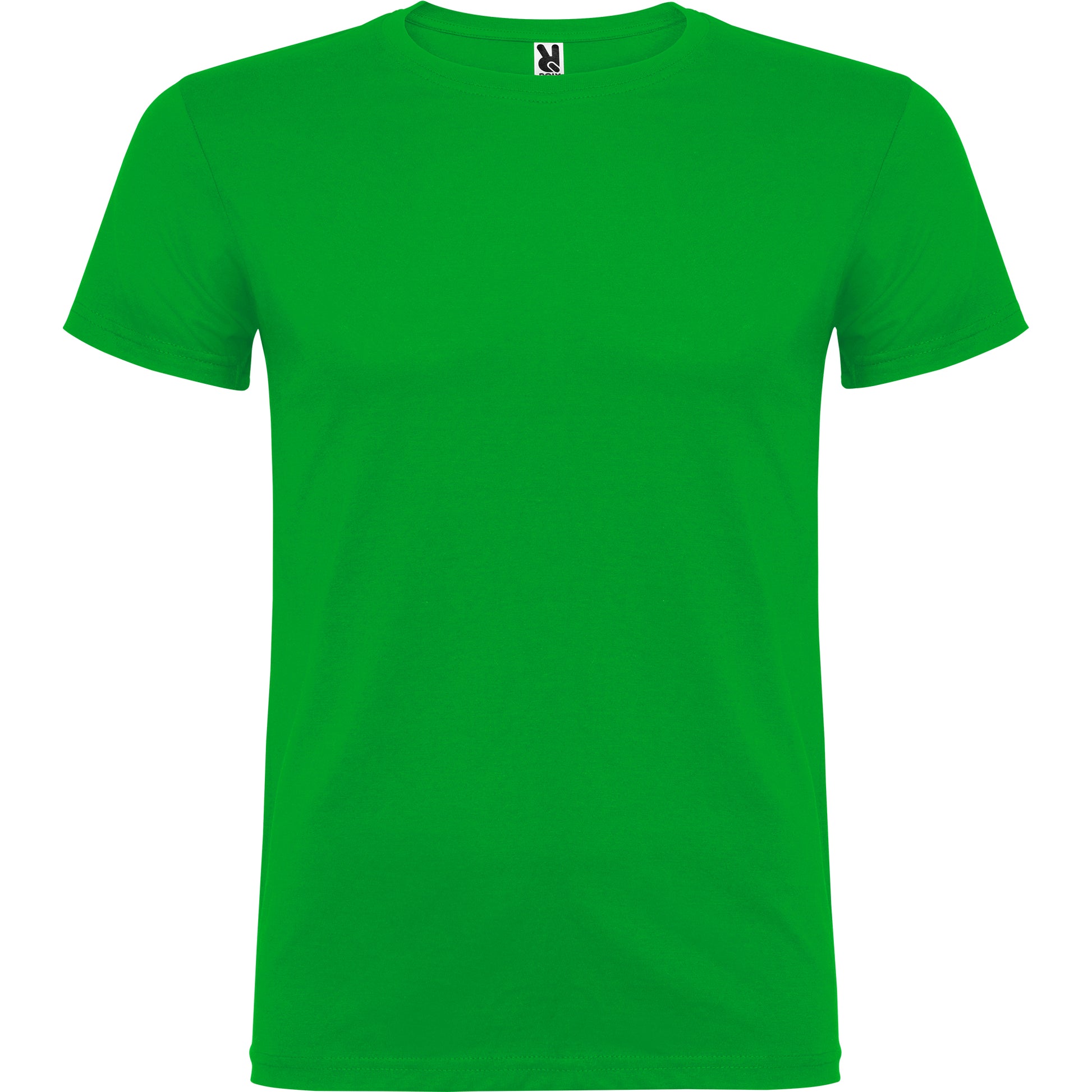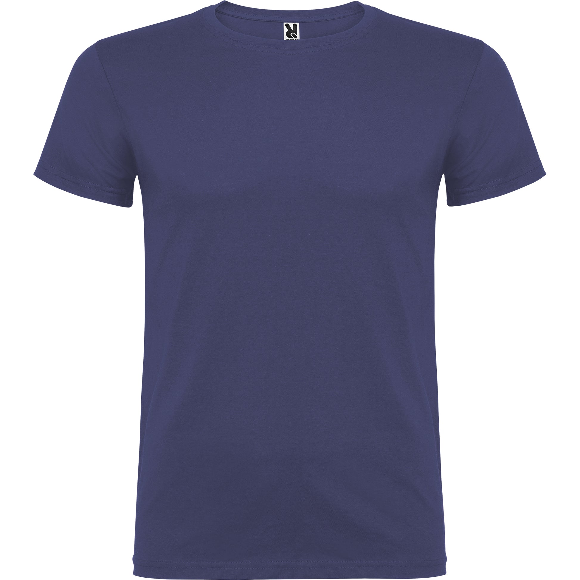 Camiseta de manga corta de cuello redondo doble con elastano , confeccionada en tejido tubular en tallas de adulto, y con costuras laterales en tallas de niño, con cubrecosturas reforzadas en cuello.