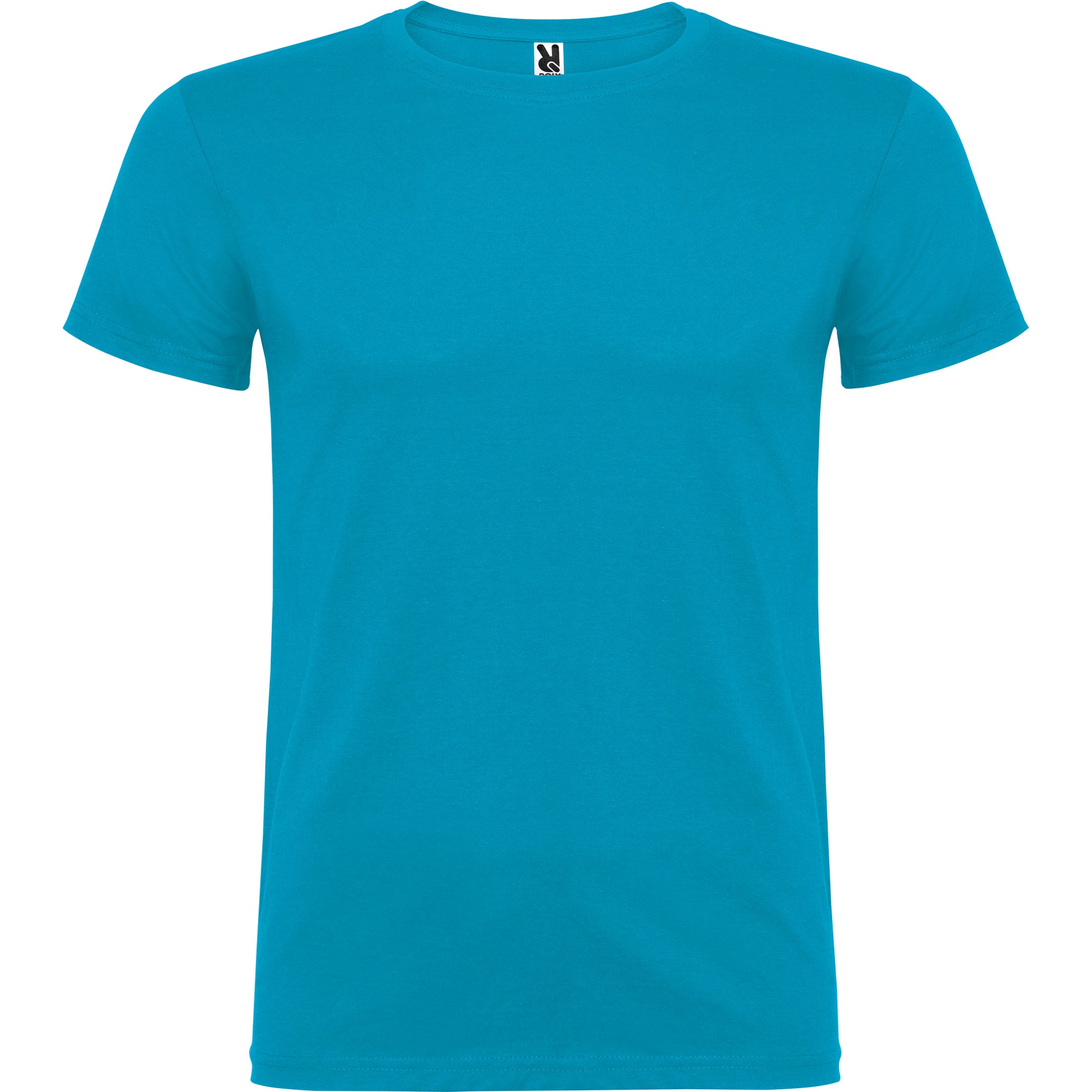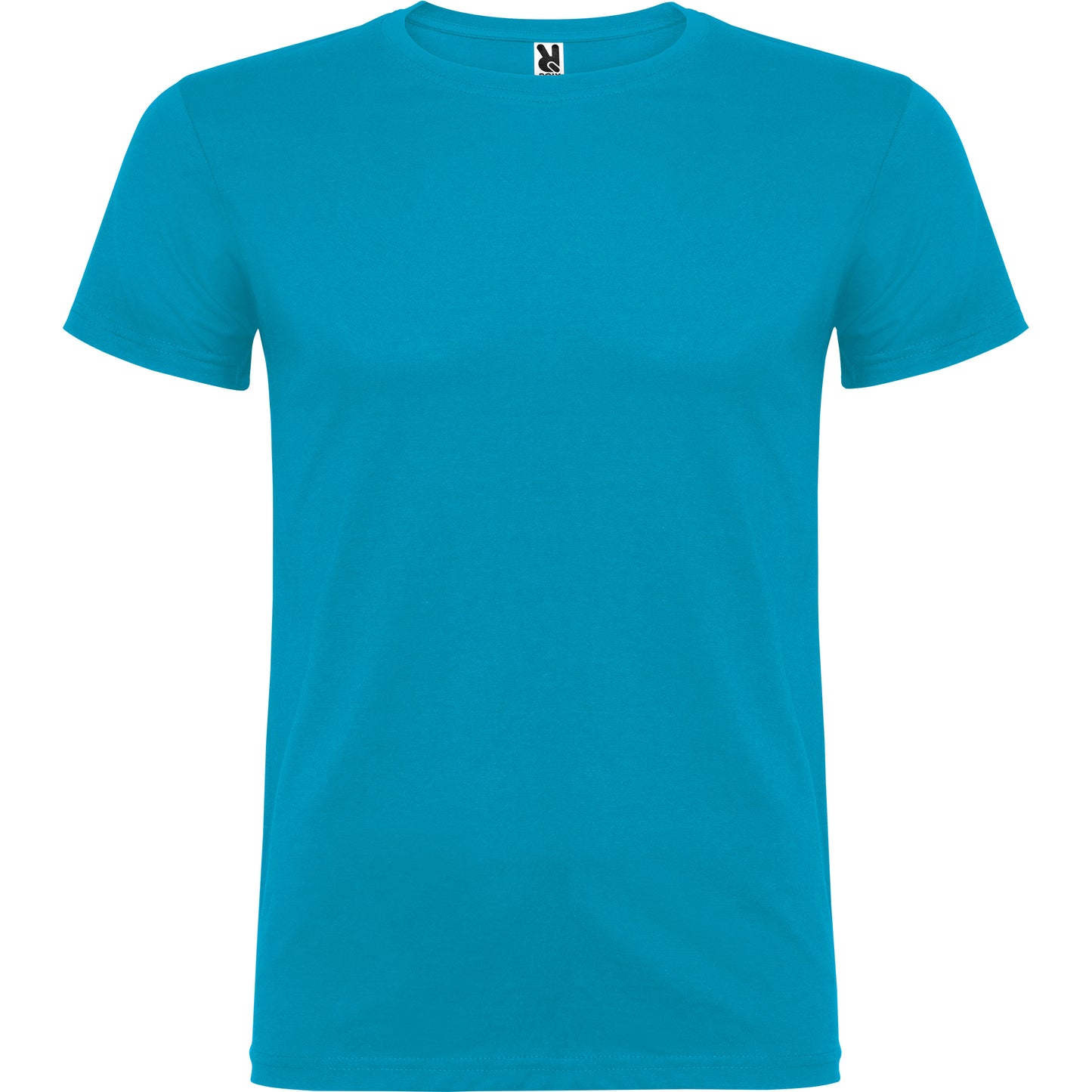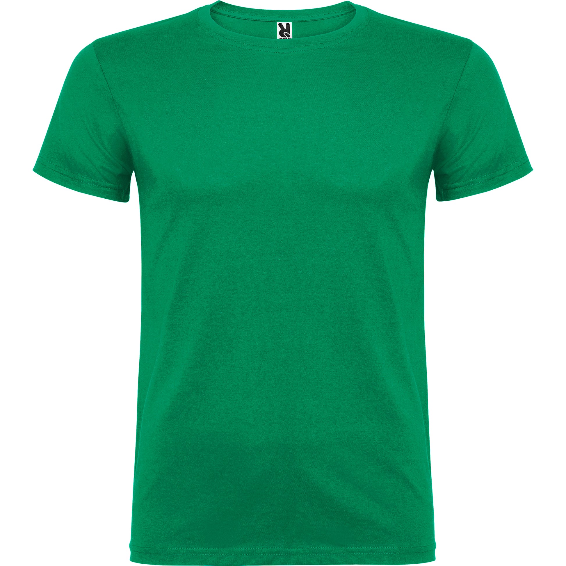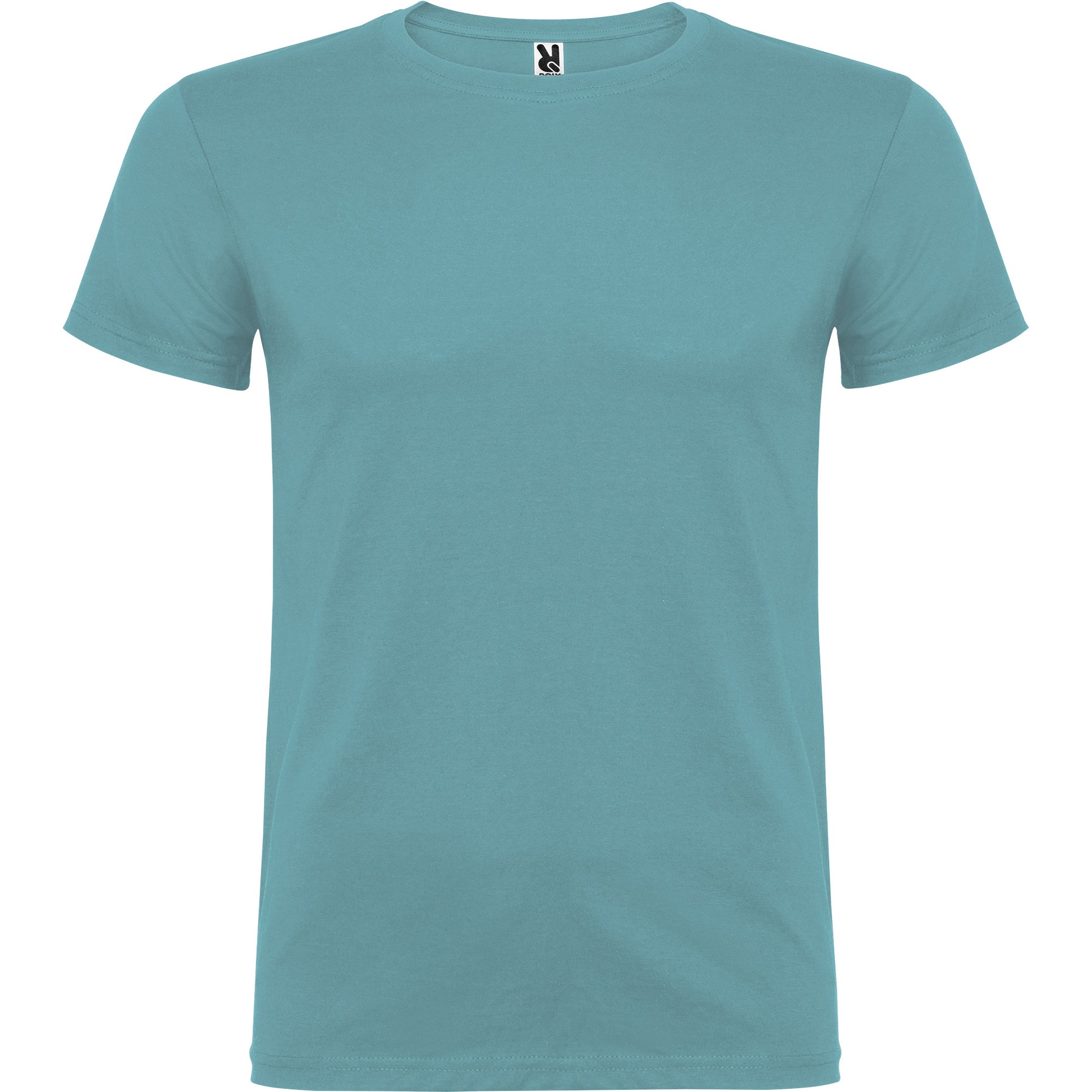 Camiseta de manga corta de cuello redondo doble con elastano , confeccionada en tejido tubular en tallas de adulto, y con costuras laterales en tallas de niño, con cubrecosturas reforzadas en cuello.