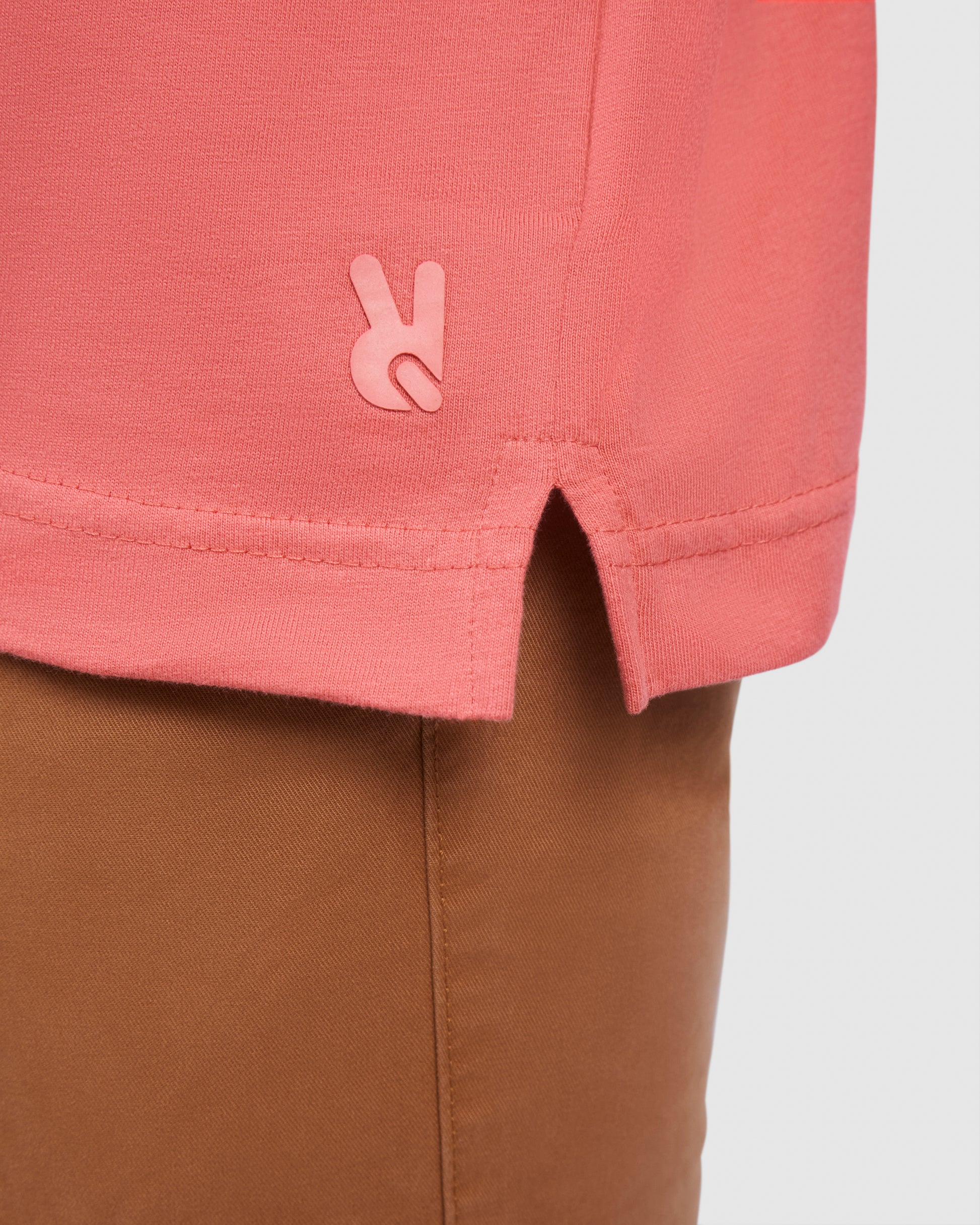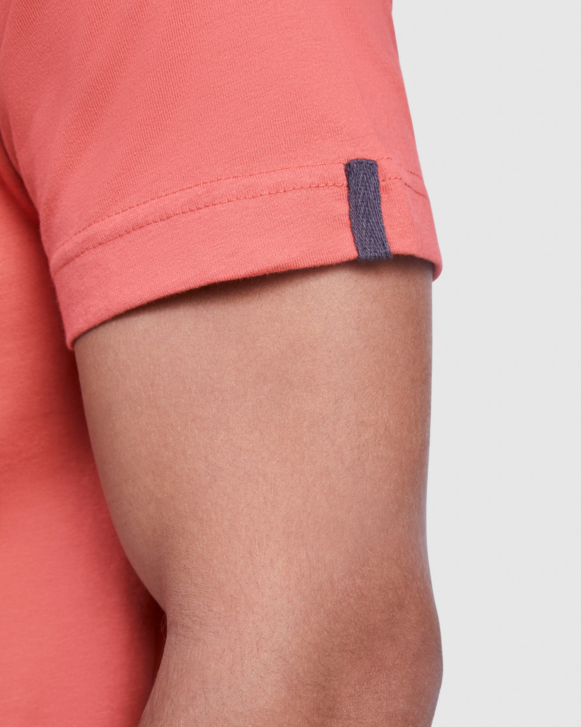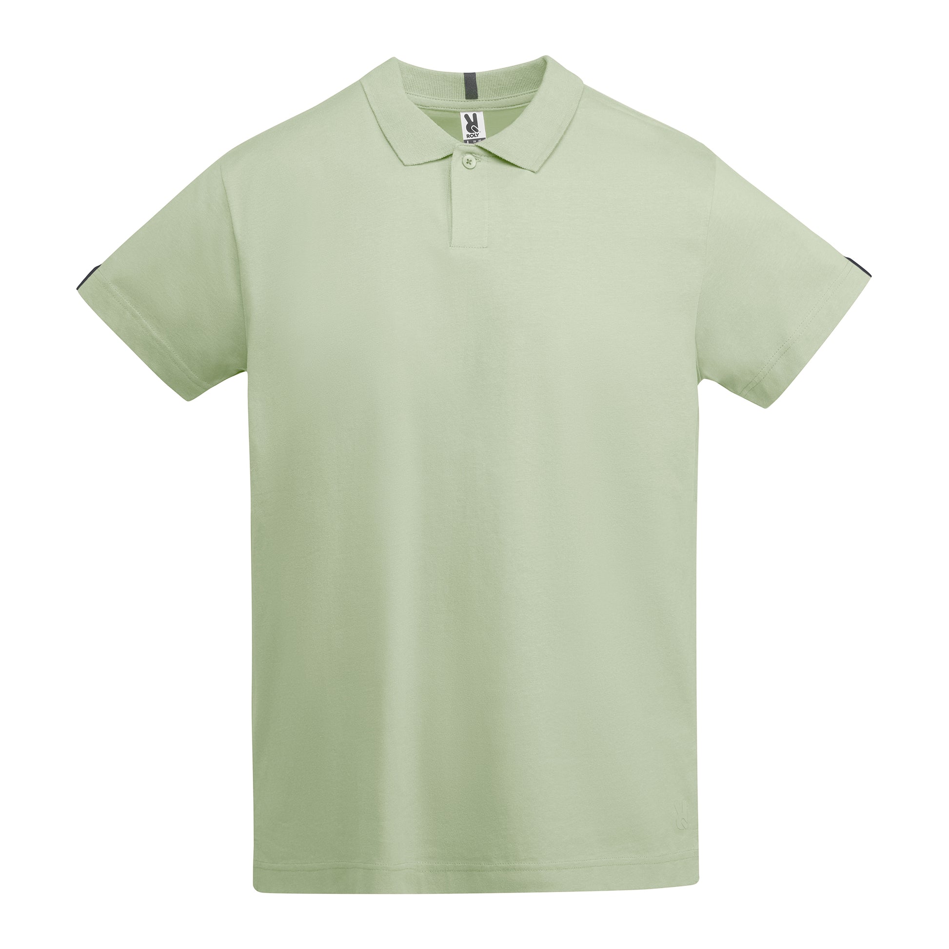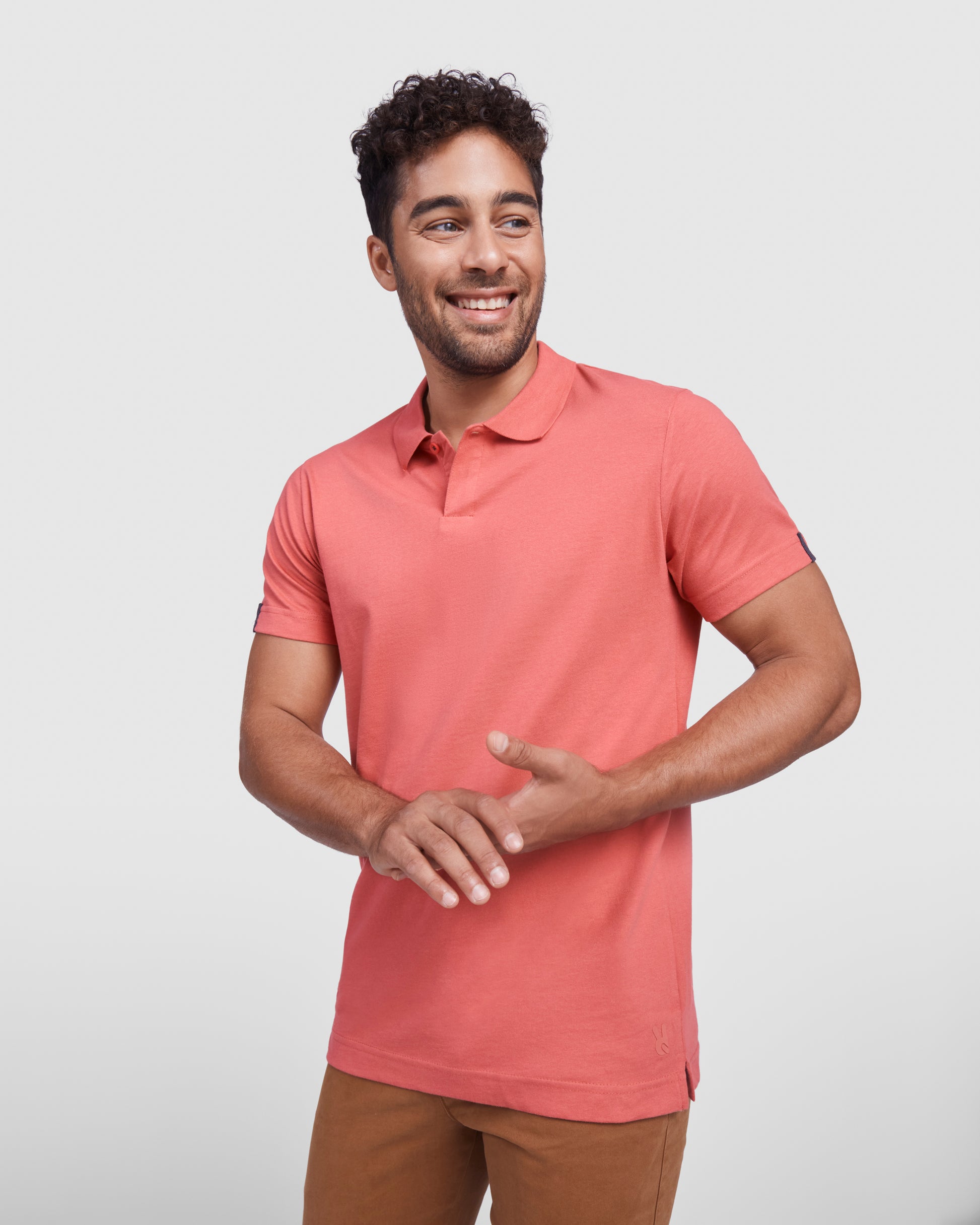 Polo de manga corta en tejido punto liso. Cuello y ribete de mangas en canalé 1x1. Tapeta con 1 botón. Cubrecosturas reforzado en cuello. Aperturas laterales en el bajo. Detalle de cinta en forma de espiga a contraste de color en puños y cuello. Logo Relieve Roly a tono de la base del tejido.