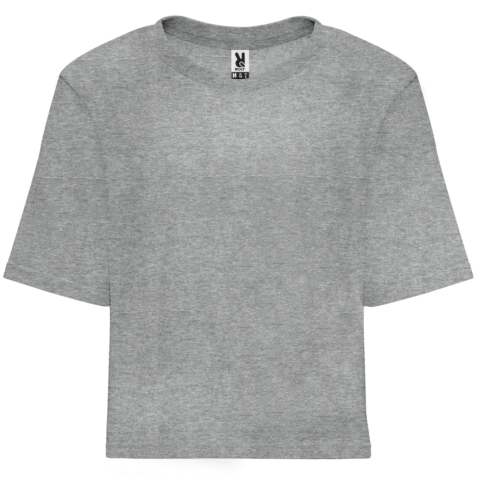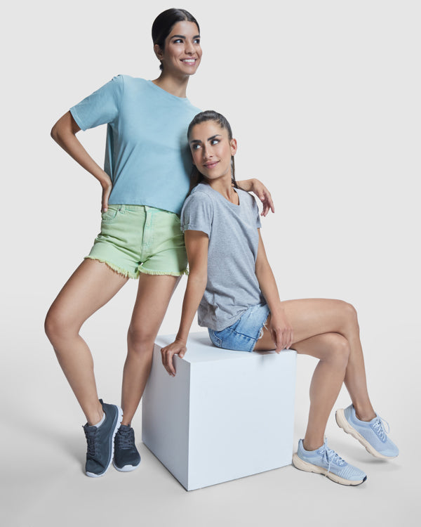 Camiseta de talle corto y holgado para mujer con manga corta. Cuello redondo con ribete ancho en canalé 1x1. Cubrecosturas reforzado a tono.