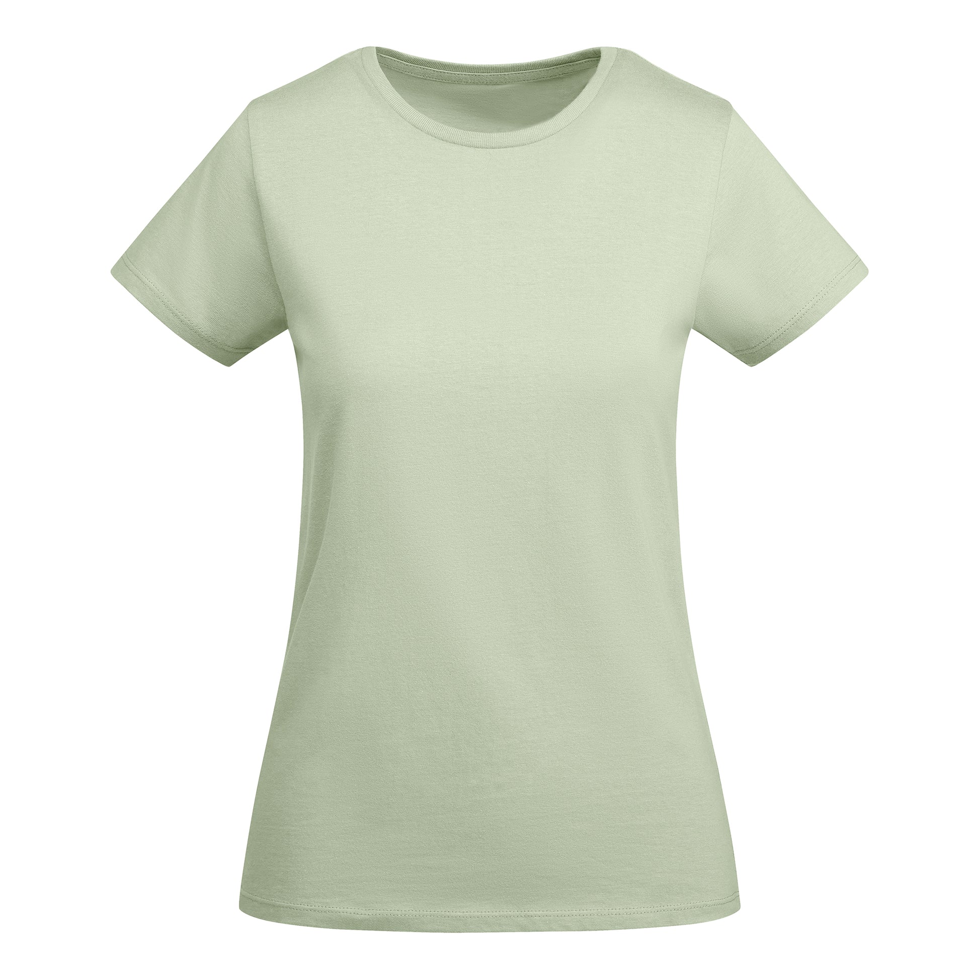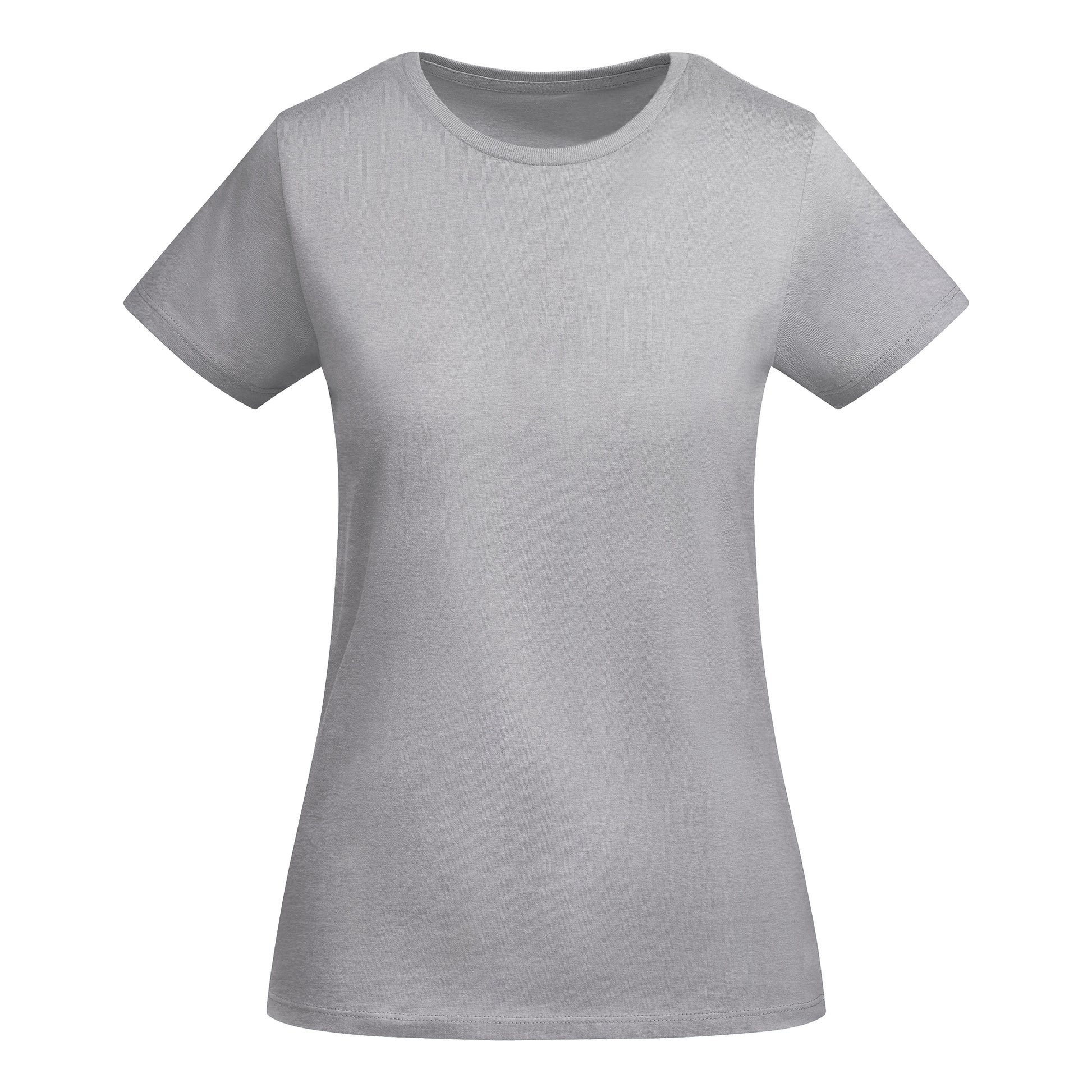 Camiseta de mujer entallada de manga corta en algodón orgánico certificado OCS. Cuello redondo en canalé 1x1. Cubrecosturas reforzado en cuello. Costuras laterales.