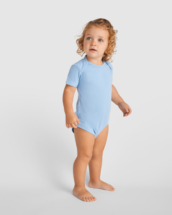 Body de bebé con manga corta de punto liso. Cuello redondo y bajo ribeteado en canalé 1x1. Cierre con botones a presión en la entrepierna. Hombro de apertura cruzada.