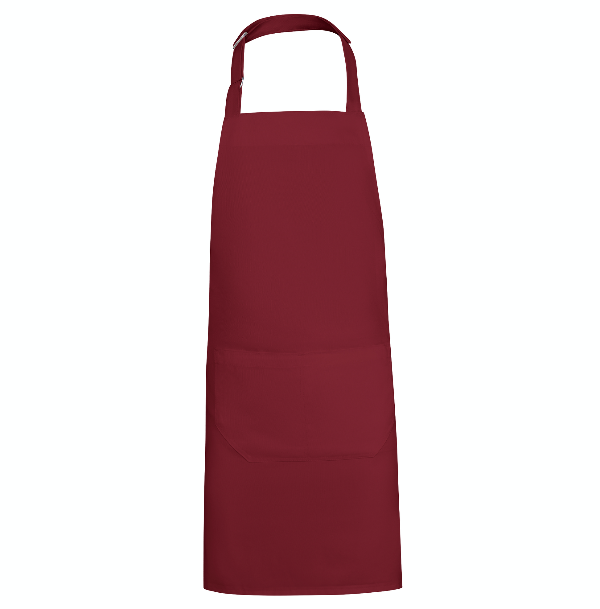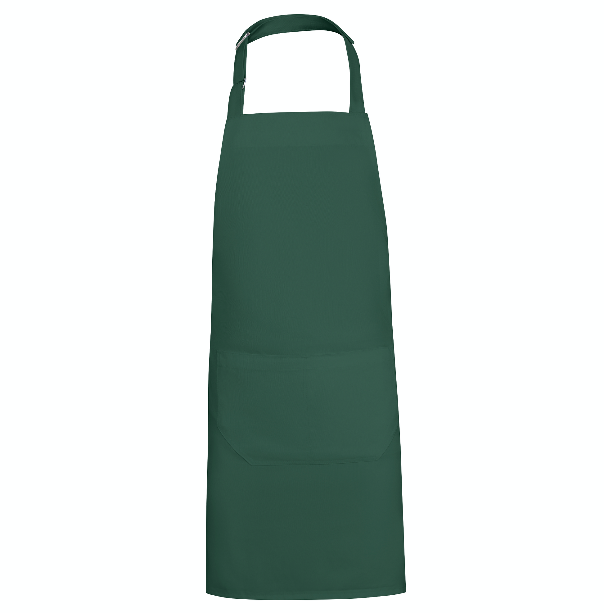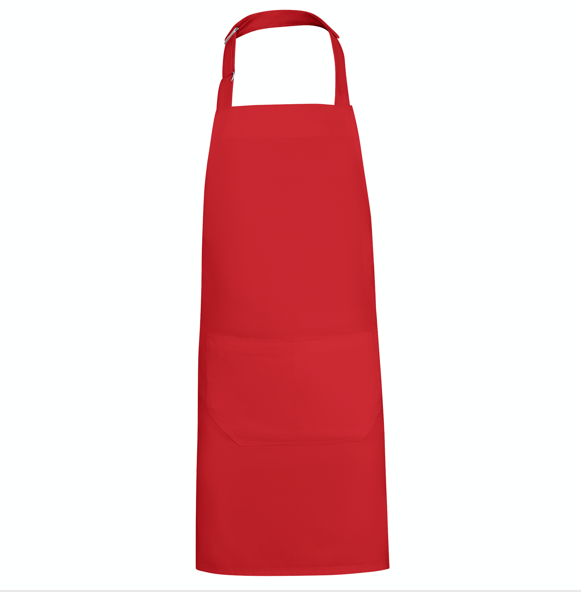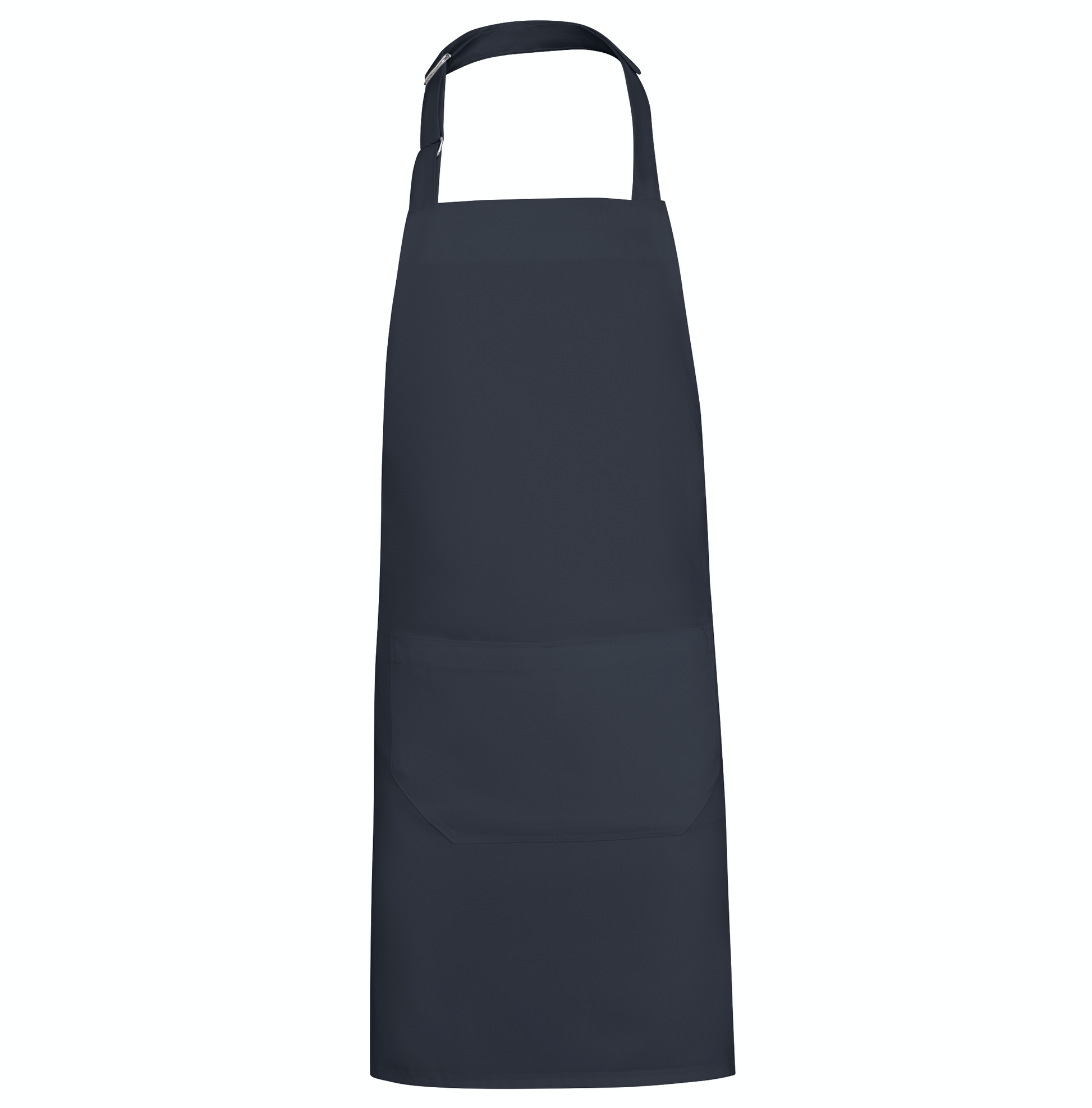 Delantal largo de sarga, en poliéster reciclado y algodón reciclado. Tirante con cierre ajustador. Cintas laterales para lazada. Dos bolsillos frontales.