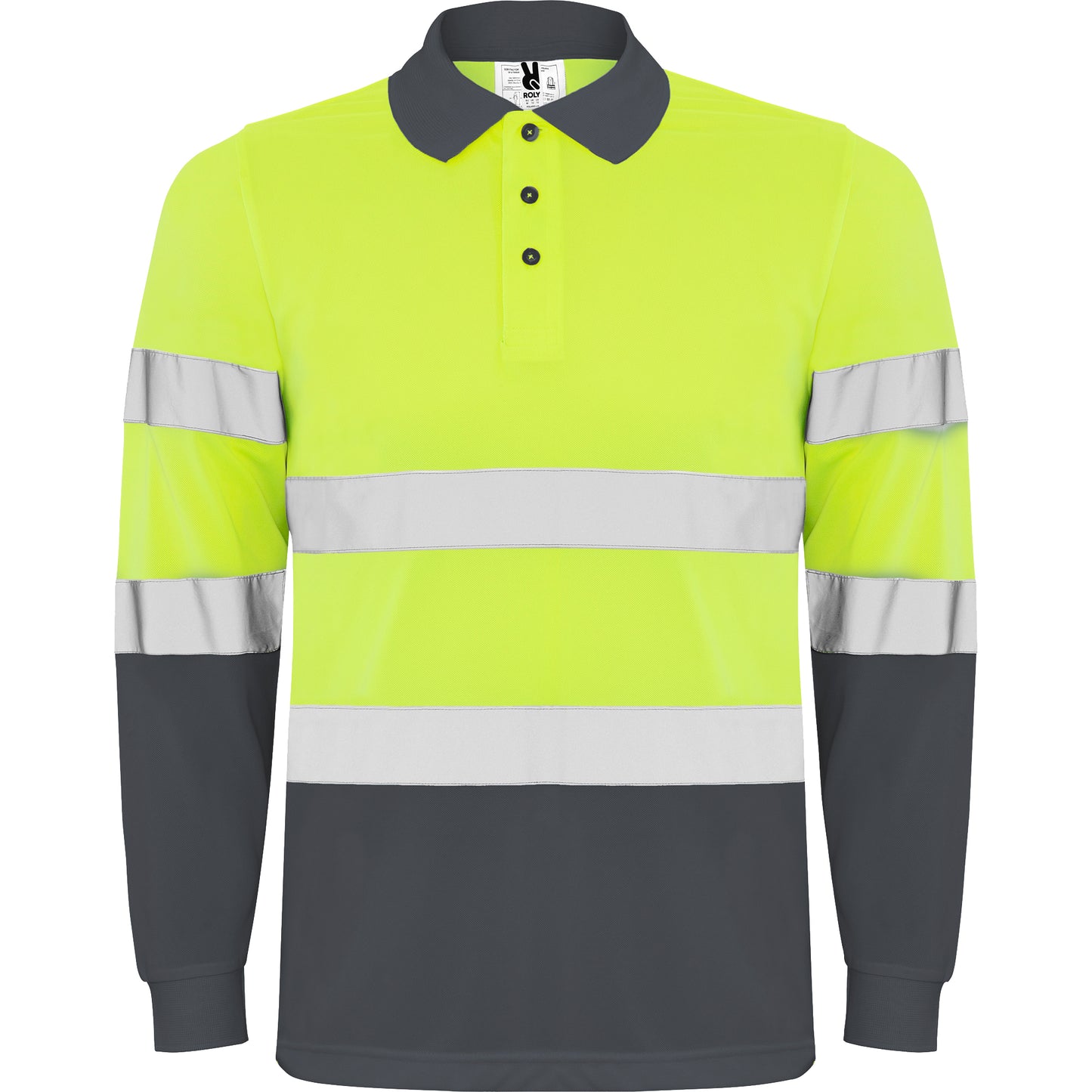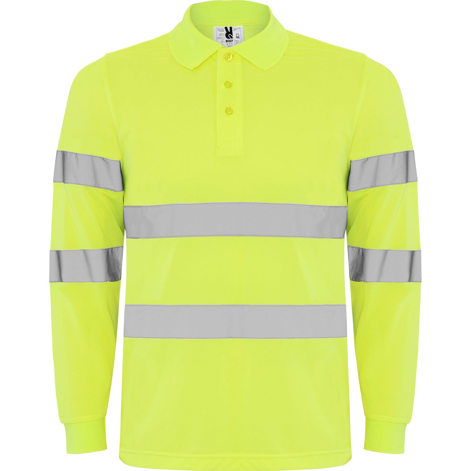 Polo técnico manga larga de alta visibilidad. · Cuello y puño en punto canalé 1x1. · Tapeta con 3 botones. · Dos cintas reflectantes en mangas, pecho y espalda. · Tejido anti enganches y fácil secado.