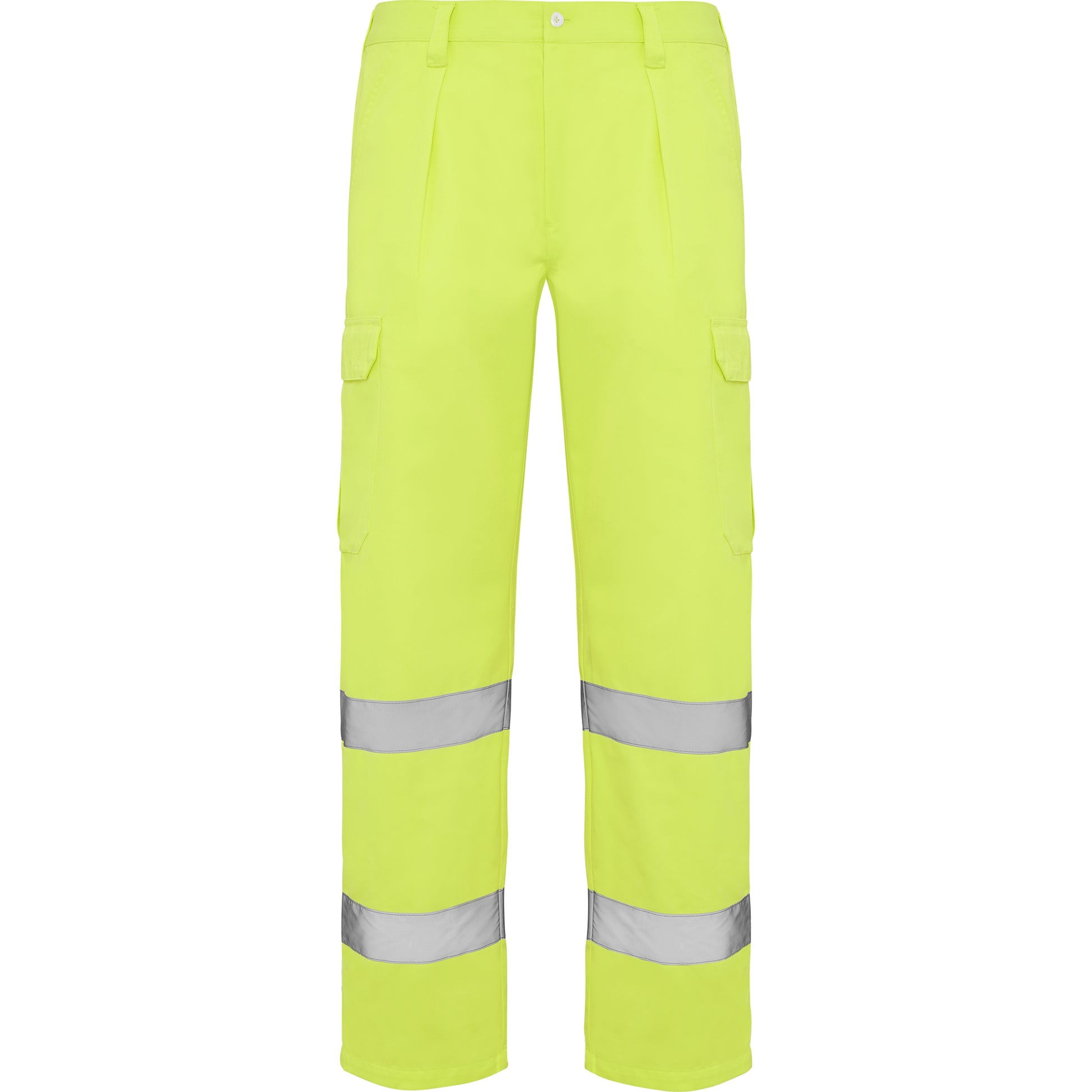 Pantalón largo de alta visibilidad con tejido resistente. · Cinturilla ajustable elástica en la parte trasera. · Dos bolsillos frontales. · Dos bolsillos traseros con tapeta y cierre de velcro. · Dos bolsillos laterales con fuelle y tapeta con cierre de velcro. · Dos cintas reflectantes horizontales.