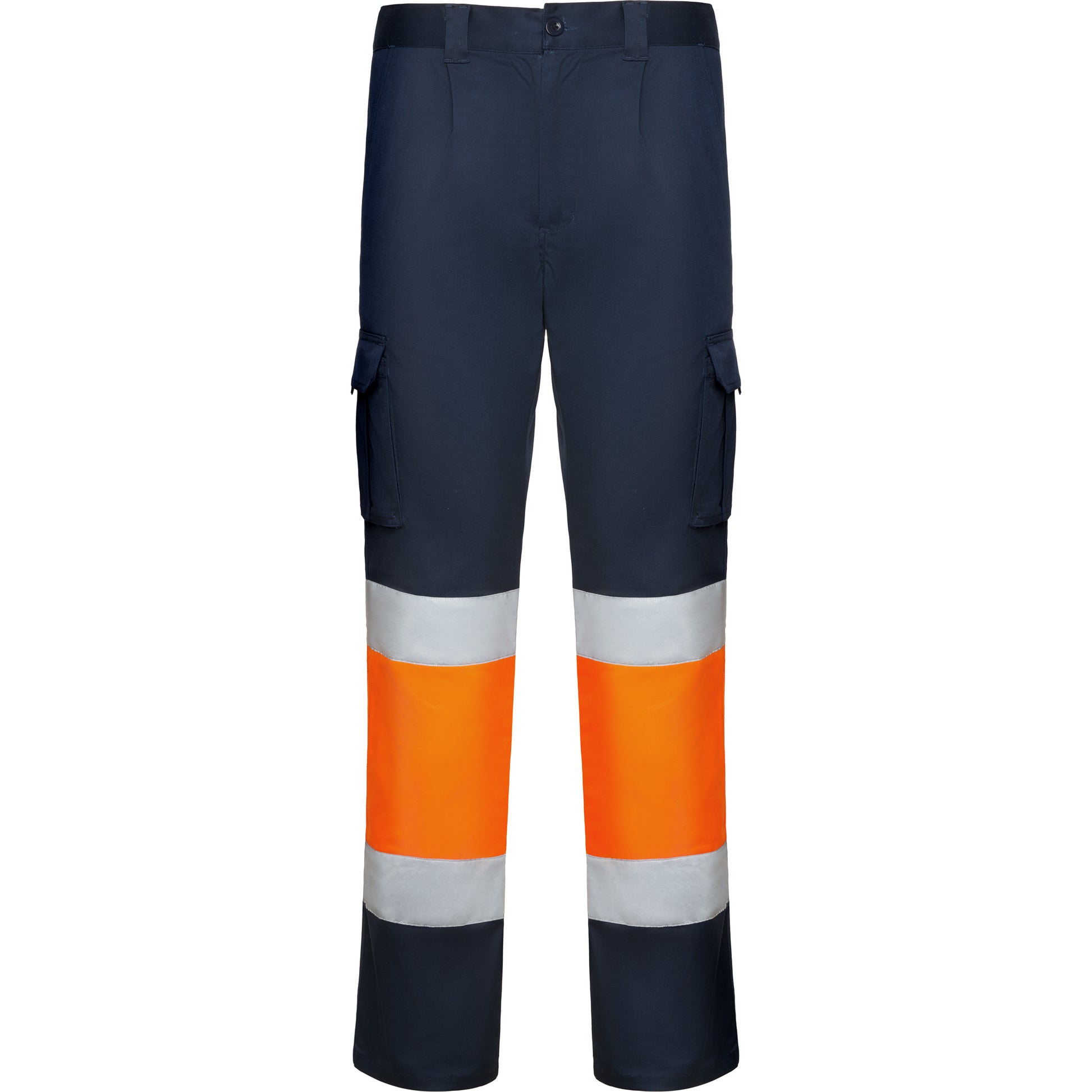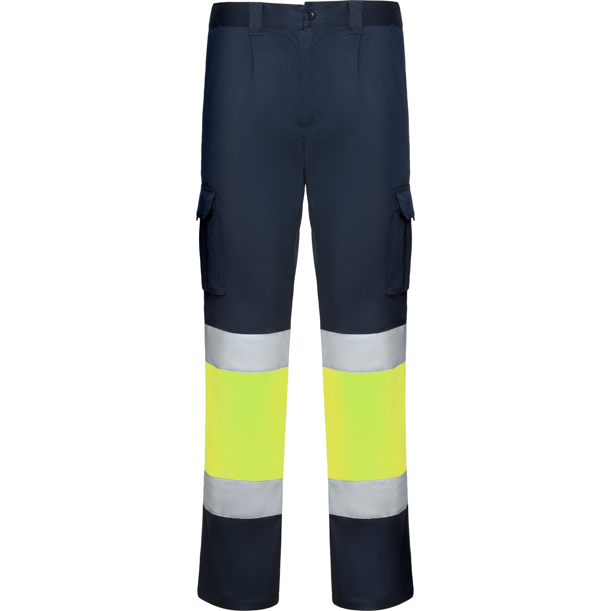 Pantalón largo multibolsillos de alta visibilidad. · Tejido cómodo y flexible. · Cintura ajustable elástica en la parte trasera. · Dos bolsillos frontales. · Dos bolsillos traseros con tapeta y cierre de velcro. · Dos bolsillos laterales de fuelle con tapeta y cierre de velcro. · Combinado en dos colores y cintas reflectantes horizontales.