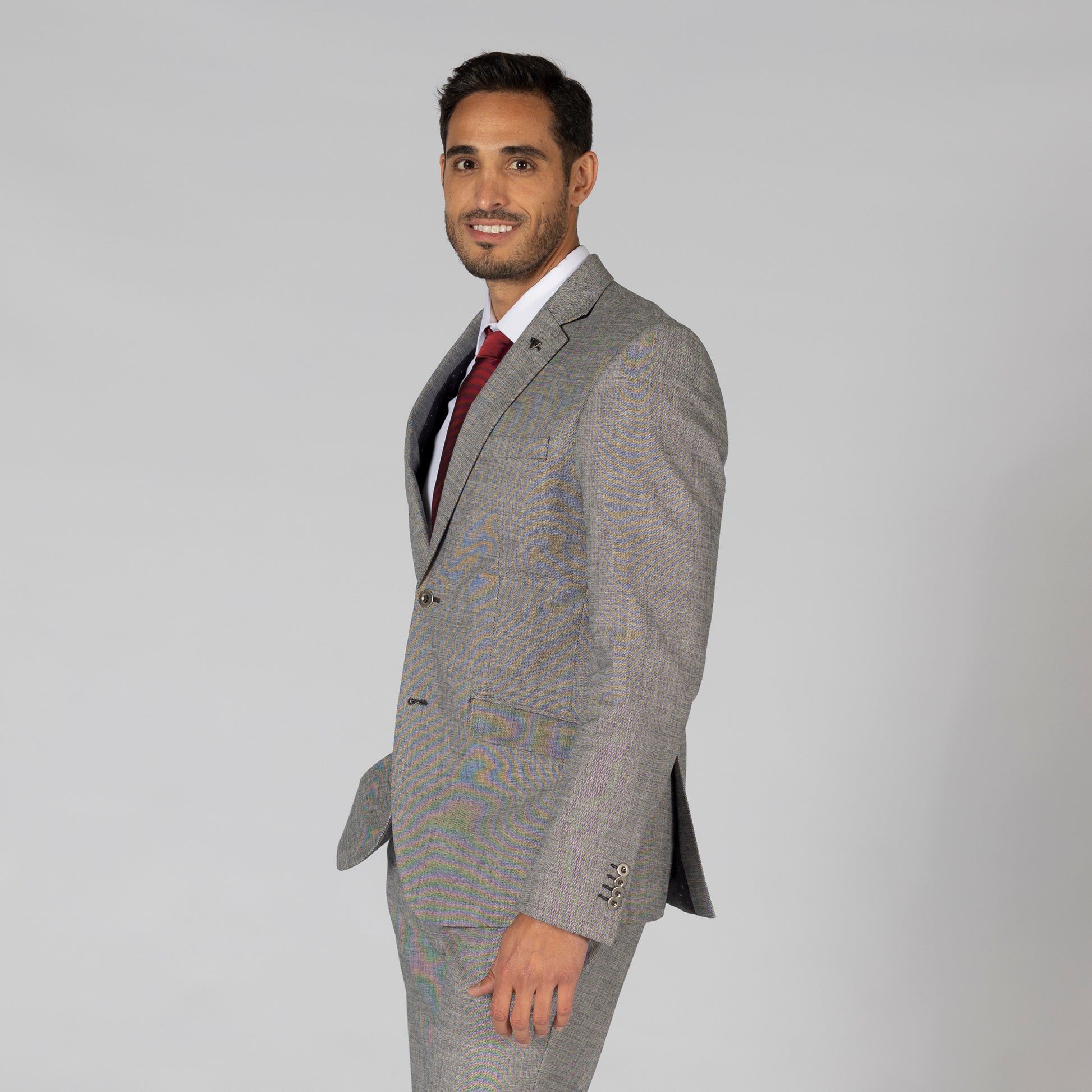 La prenda cuenta con un ojal en la solapa, un detalle que agrega un toque de sofisticación. Los ojales en color gris marengo contrastan elegantemente con el tejido Cheviot.