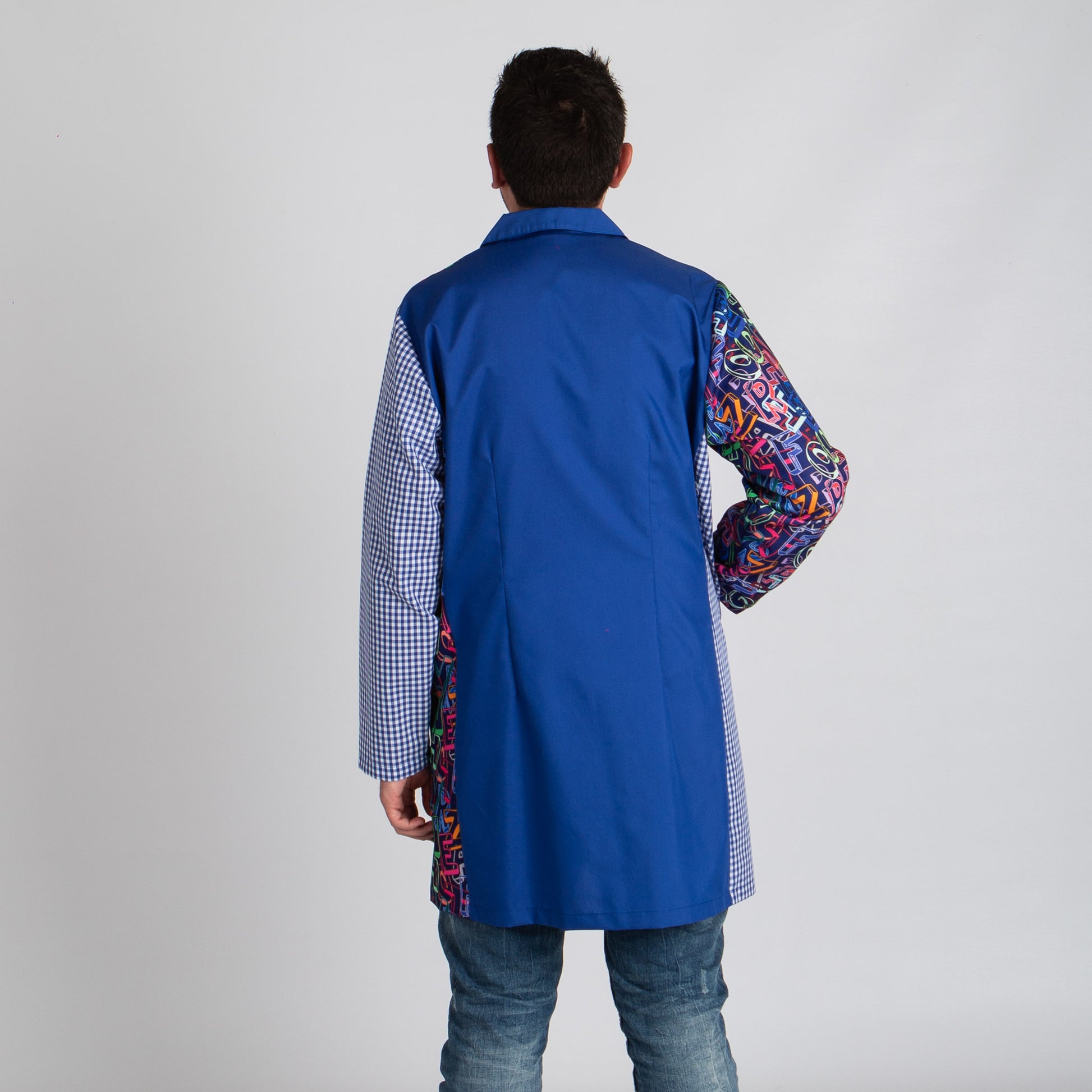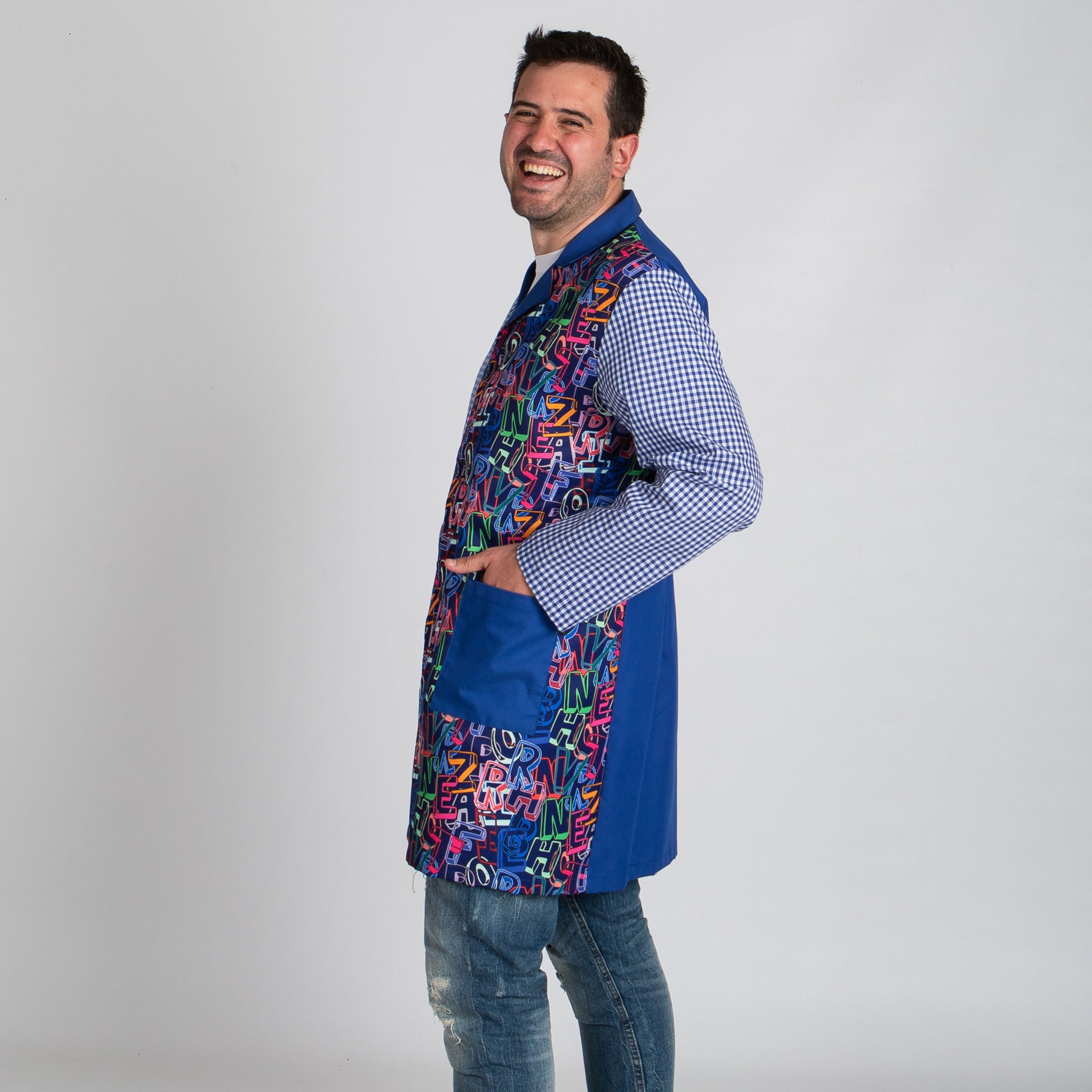 Prenda confeccionada en vichy de cuadros azulina, con divertido estampado en lateral y manga. Espalda, cuello y bolsillos en azulina.