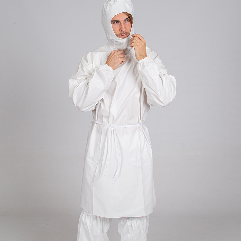 Bata unisex impermeable, con cierre mediante cintas para anudar, cuello redondo y manga larga con elástico para una mejor protección y adaptabilidad. REUTILIZABLE hasta 40 ciclos de lavado a 90º.