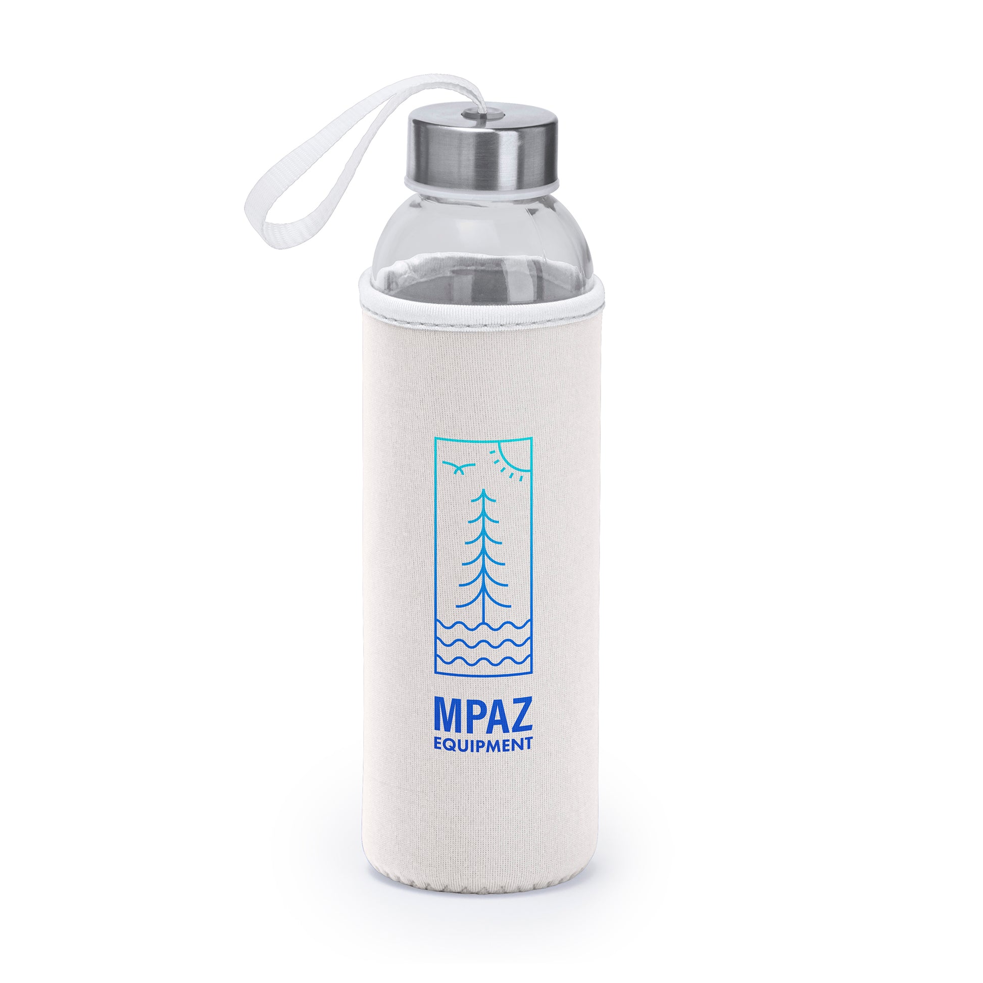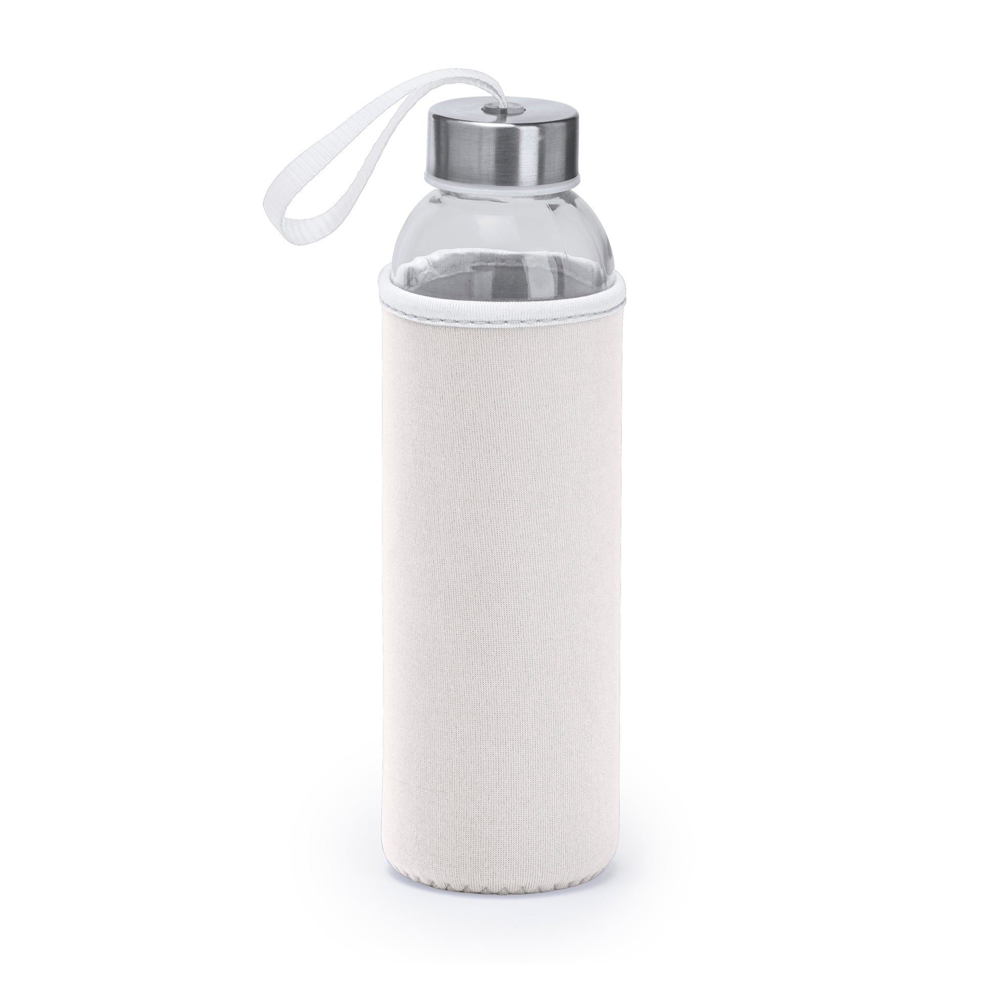 Bidón de cristal con 500 ml de capacidad, y funda realizada con neopreno, combinada con una cinta de transporte a color. 4040R
