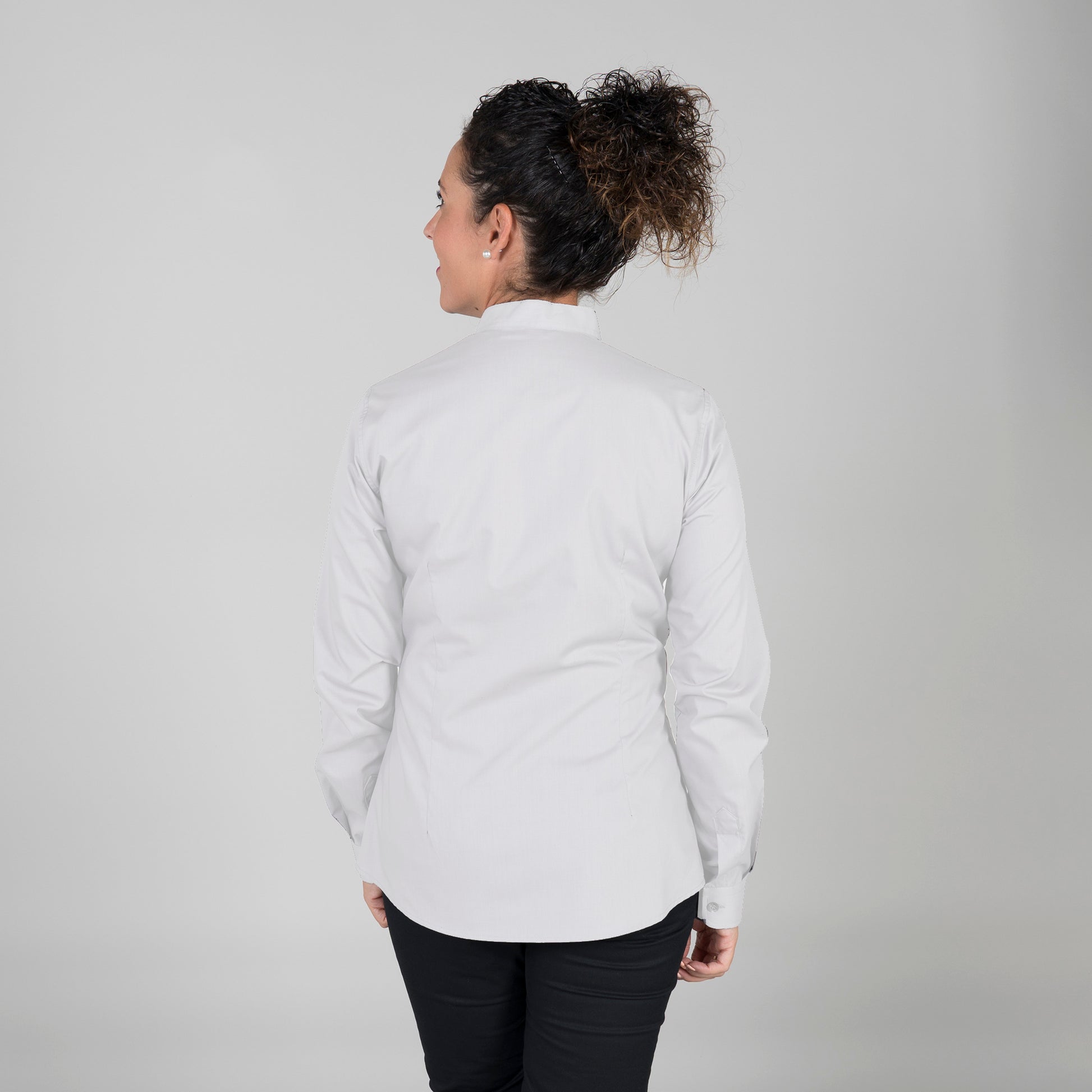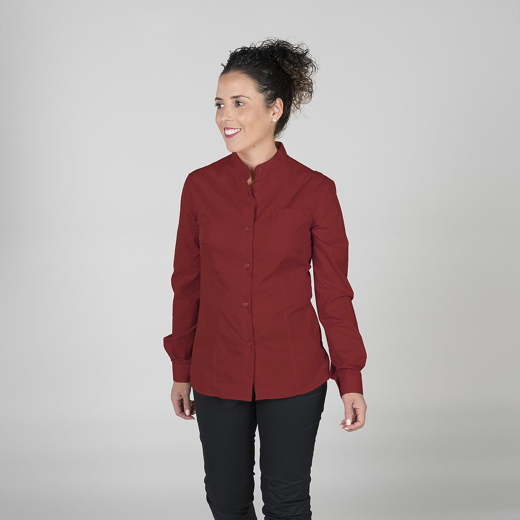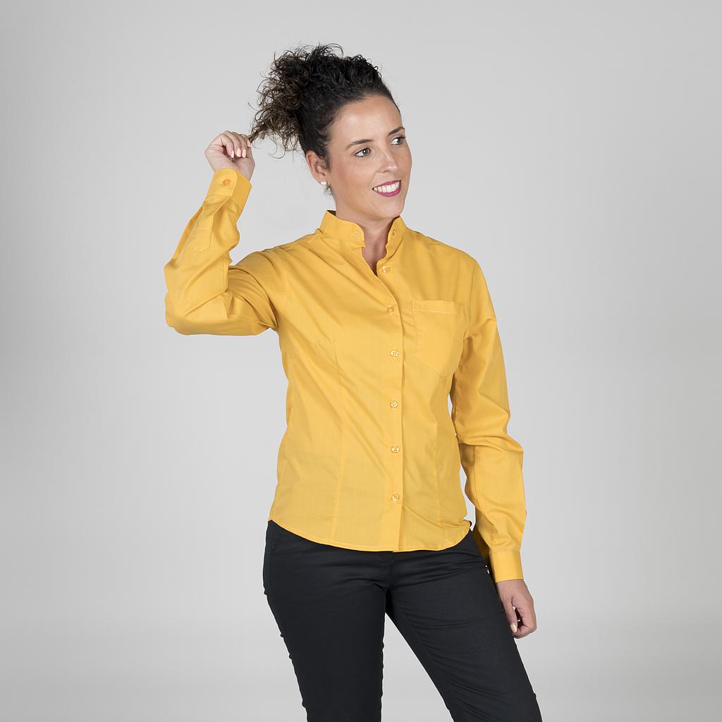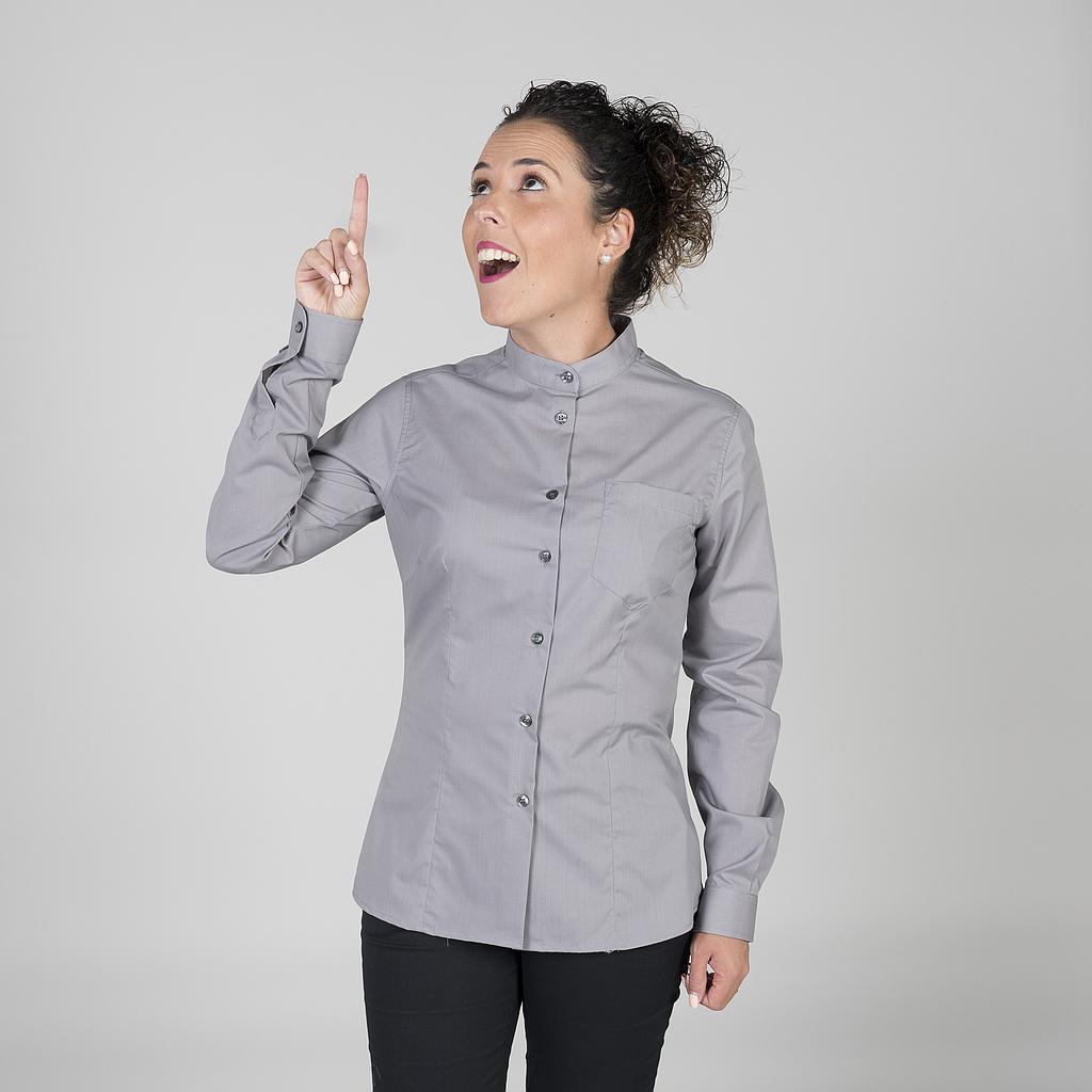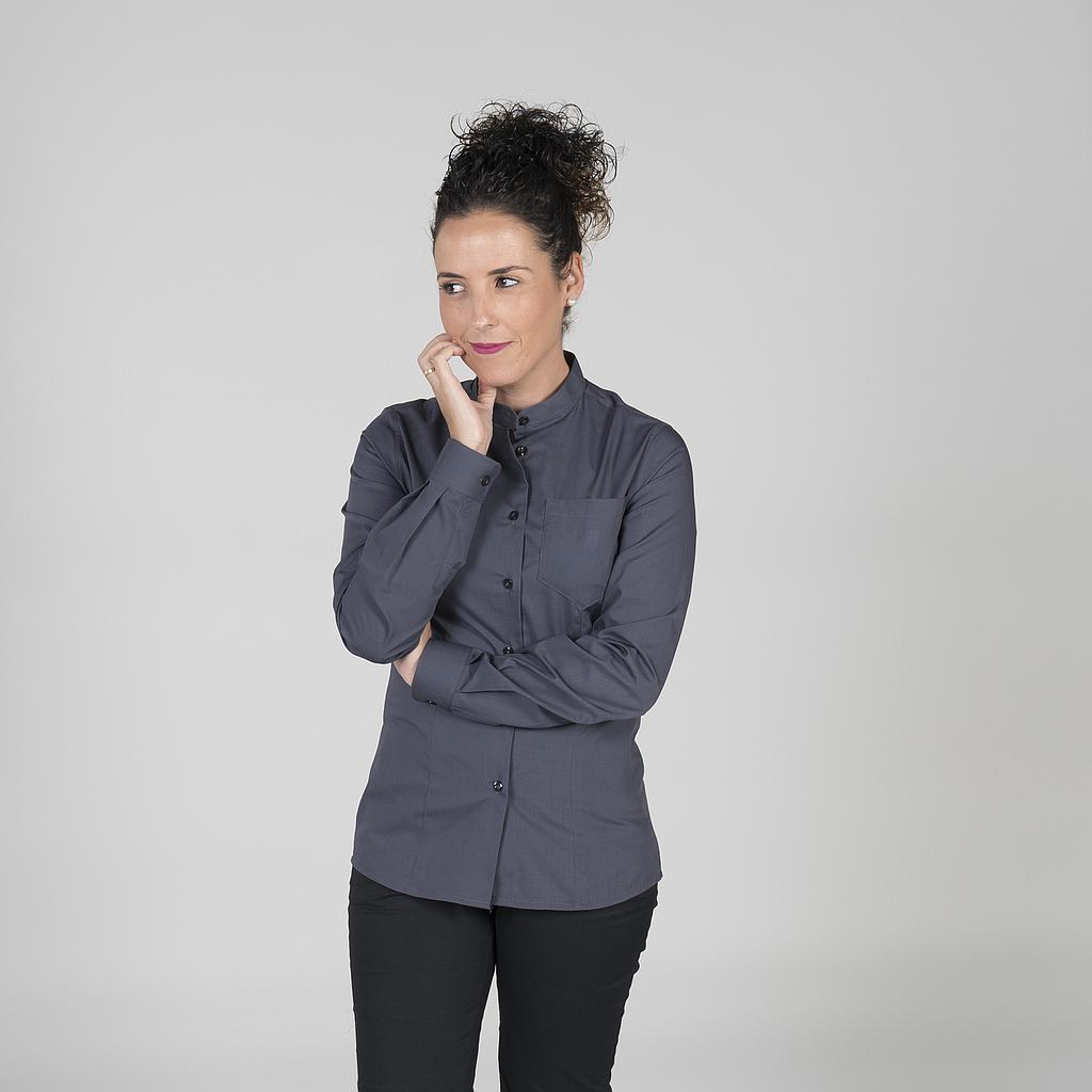 Camisa de mujer en manga larga con cuello mao. Dispone de un bolsillo en el pecho izquierdo, puños abotonados y pinzas en costados, delantero y espalda.
