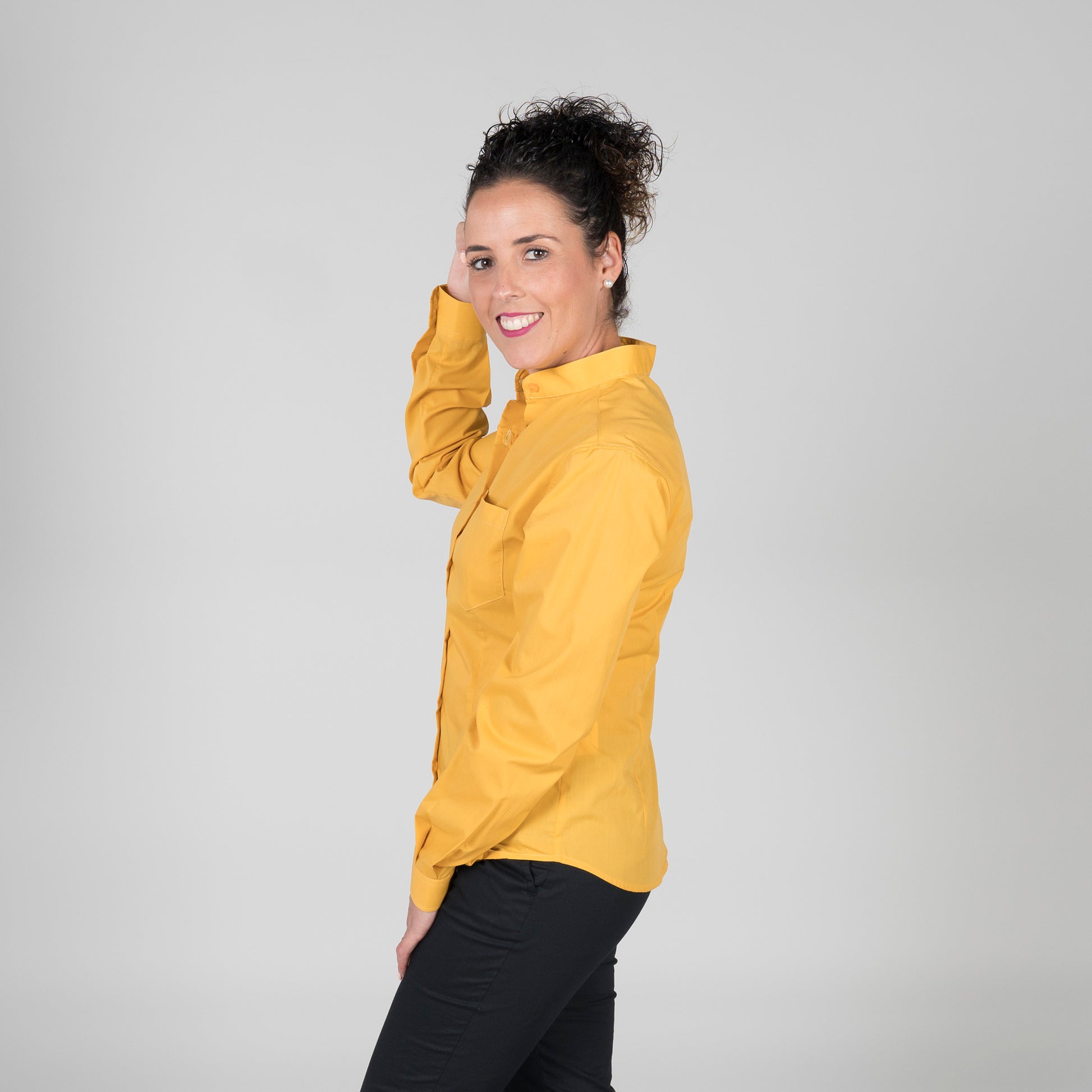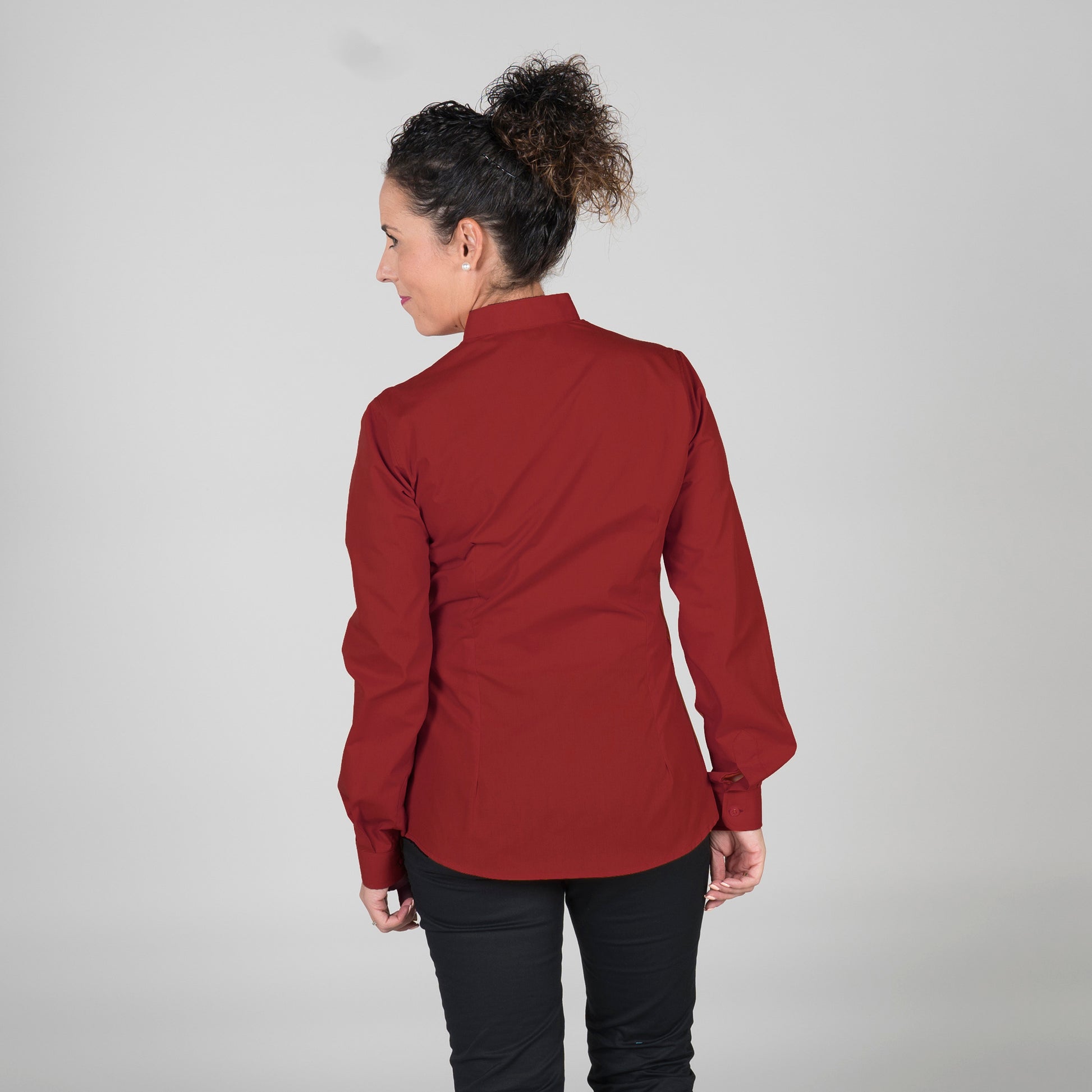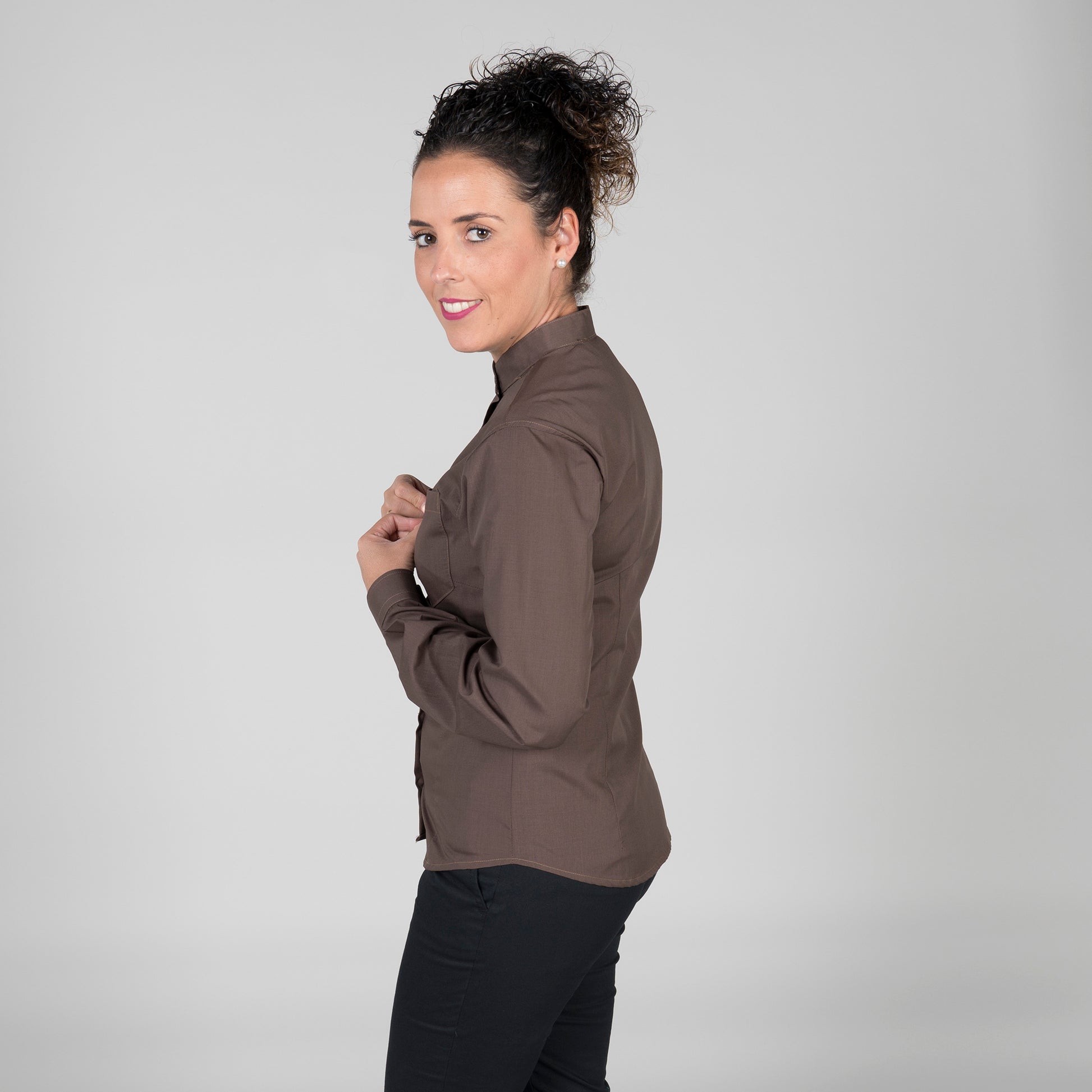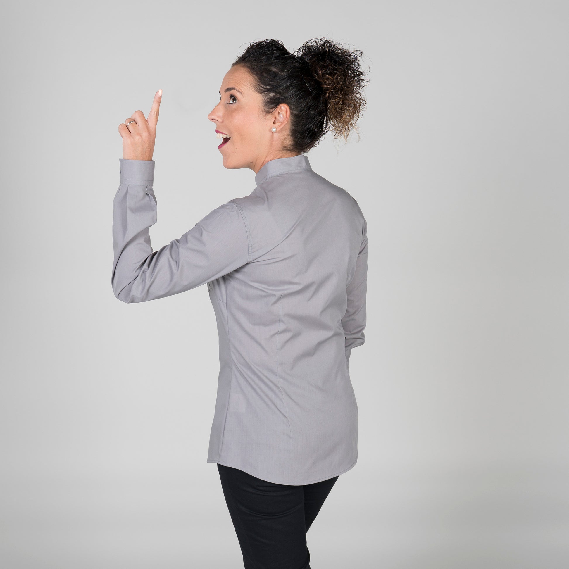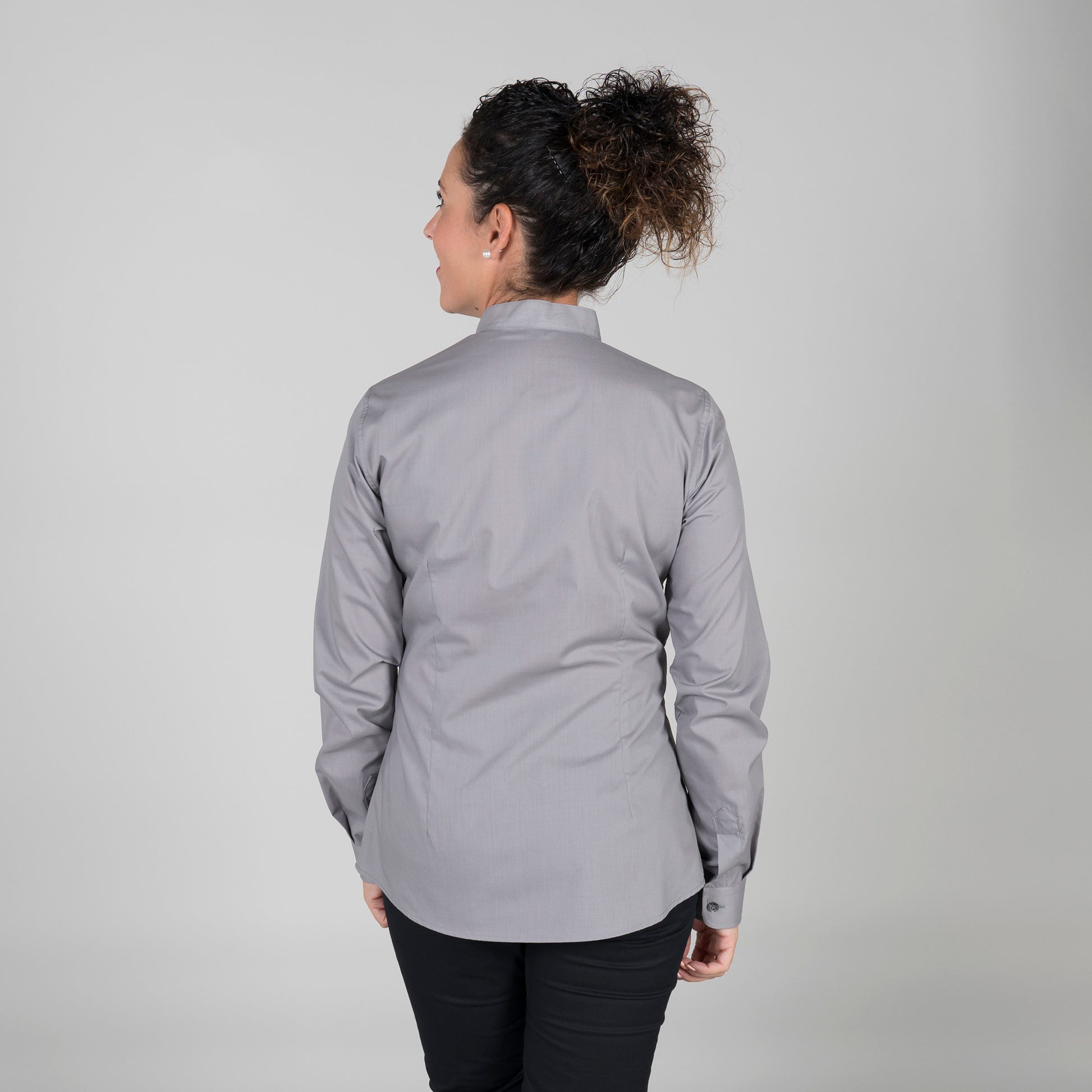 Camisa de mujer en manga larga con cuello mao. Dispone de un bolsillo en el pecho izquierdo, puños abotonados y pinzas en costados, delantero y espalda.
