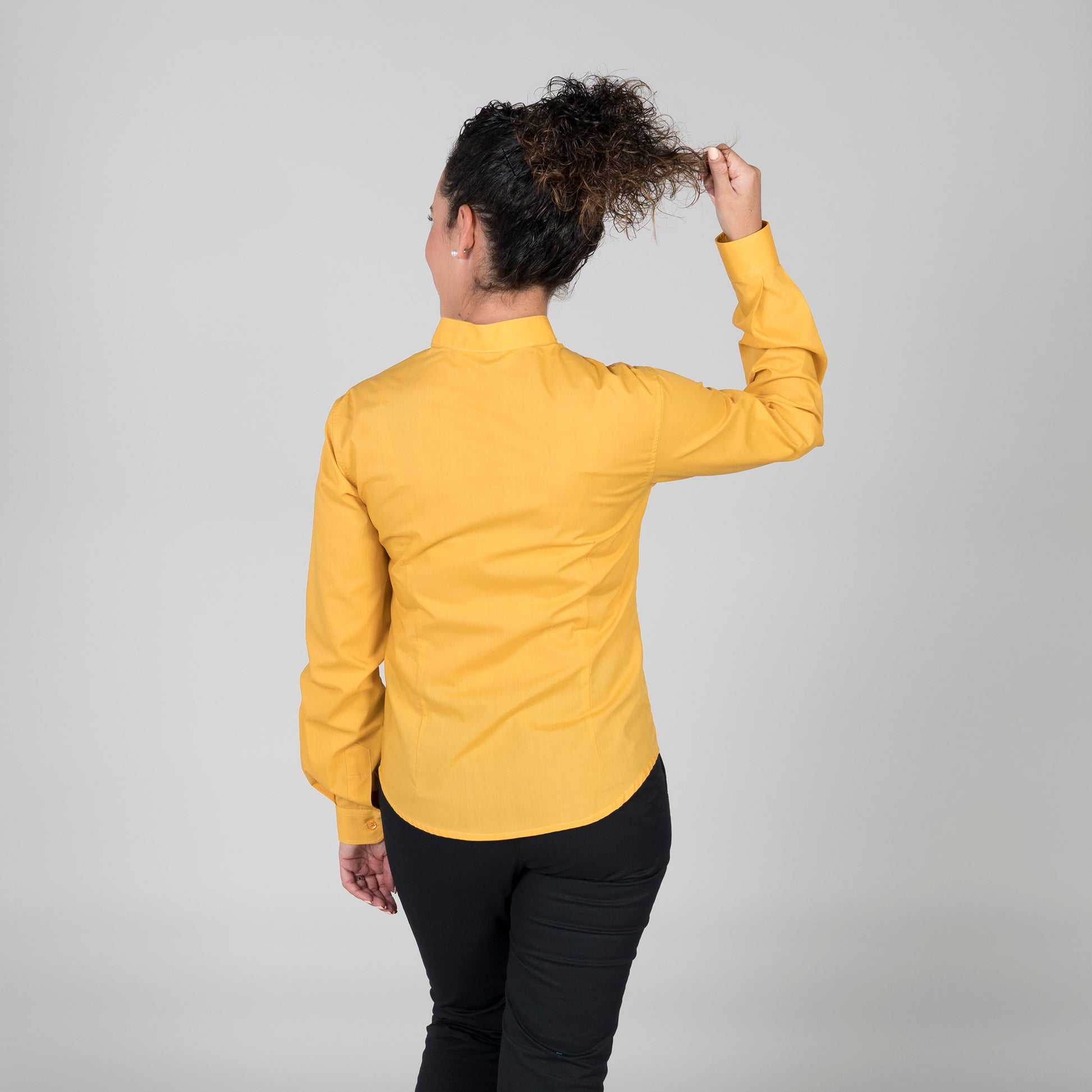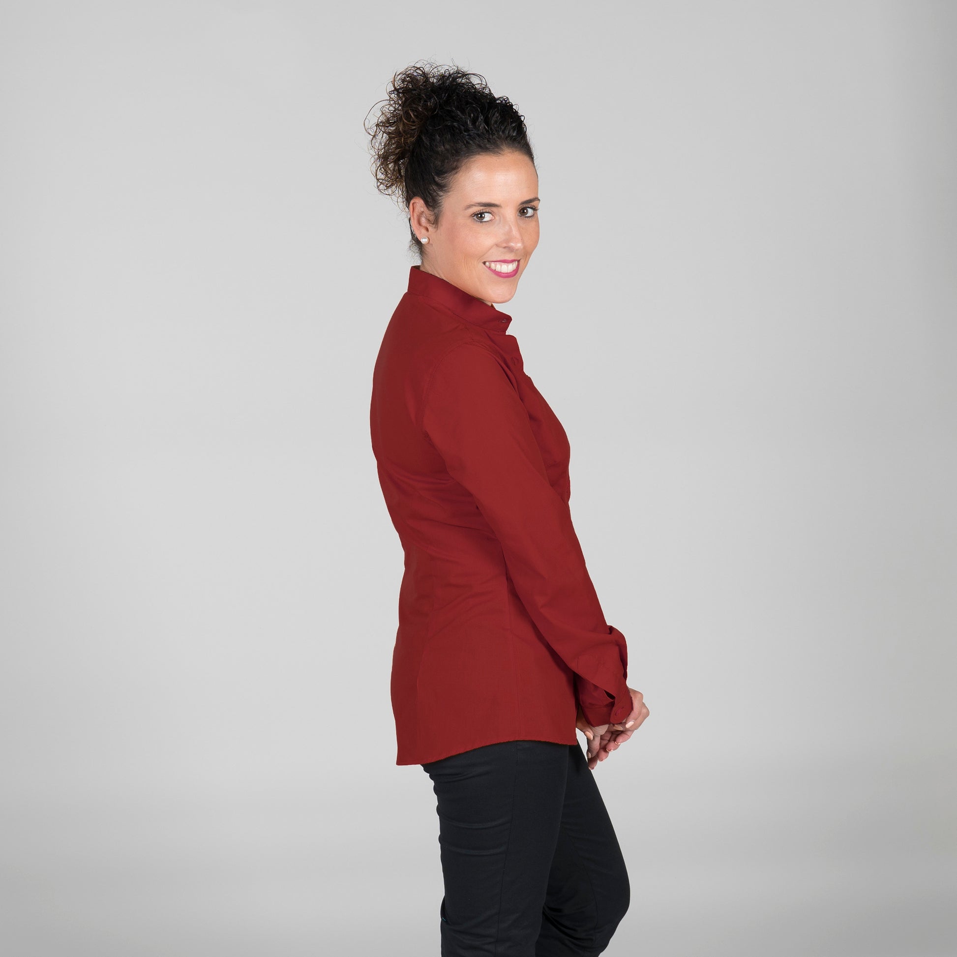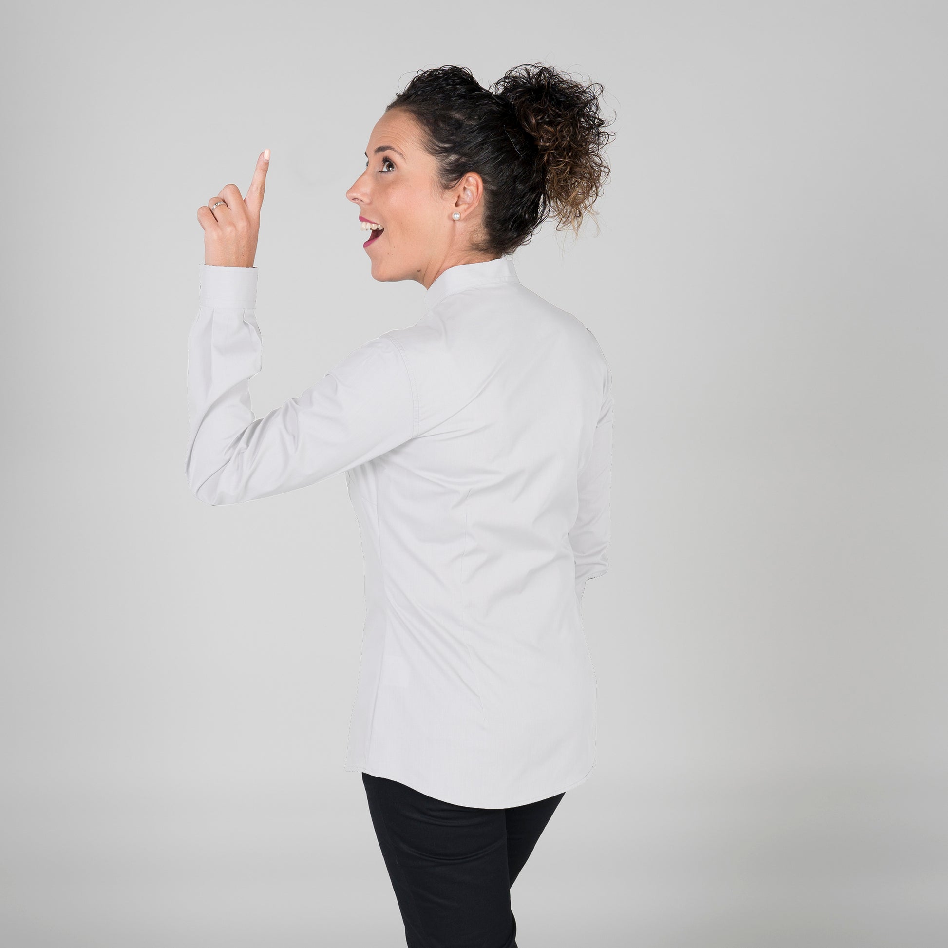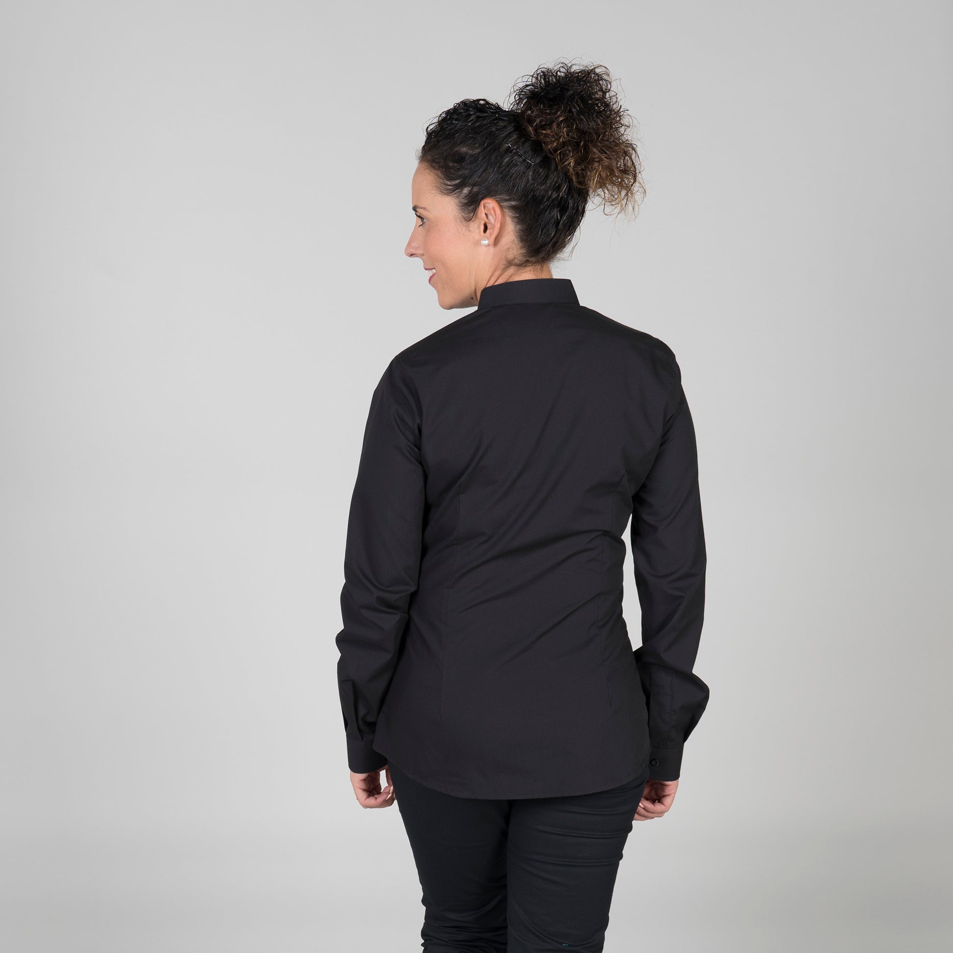 Camisa de mujer en manga larga con cuello mao. Dispone de un bolsillo en el pecho izquierdo, puños abotonados y pinzas en costados, delantero y espalda.