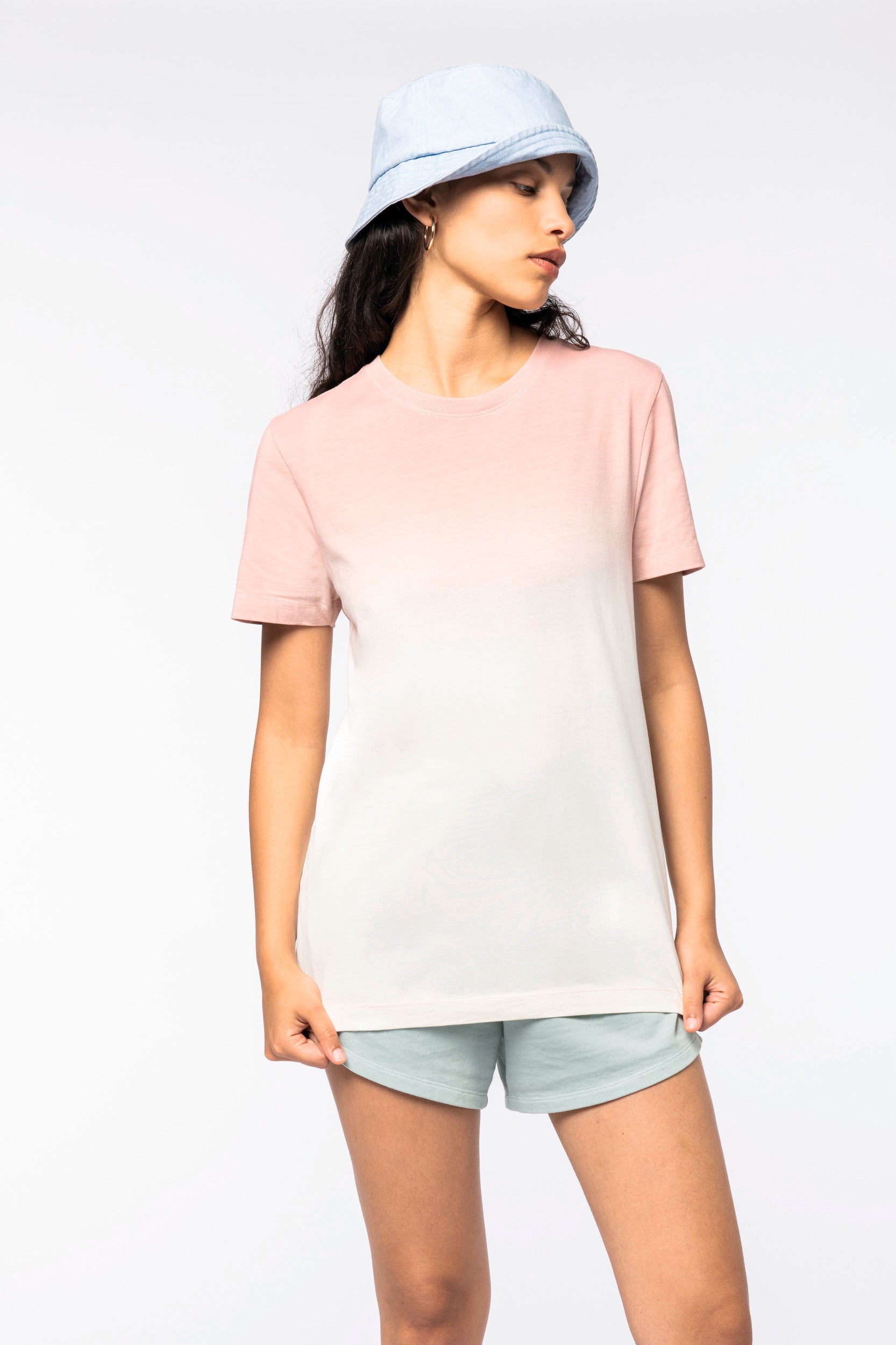 100% algodón orgánico. Algodón peinado Ringspun. Corte ajustado. Costuras laterales. Lavado con enzimas. Canalé 1 x 1 en el cuello. Tira cubrecosturas del material principal en la parte interior del cuello. Dobladillo con doble pespunte en el bajo de las mangas y el bajo de la prenda. Prenda teñida con efecto Dip-Dye tras el montaje: los colores podrían variar ligeramente.
