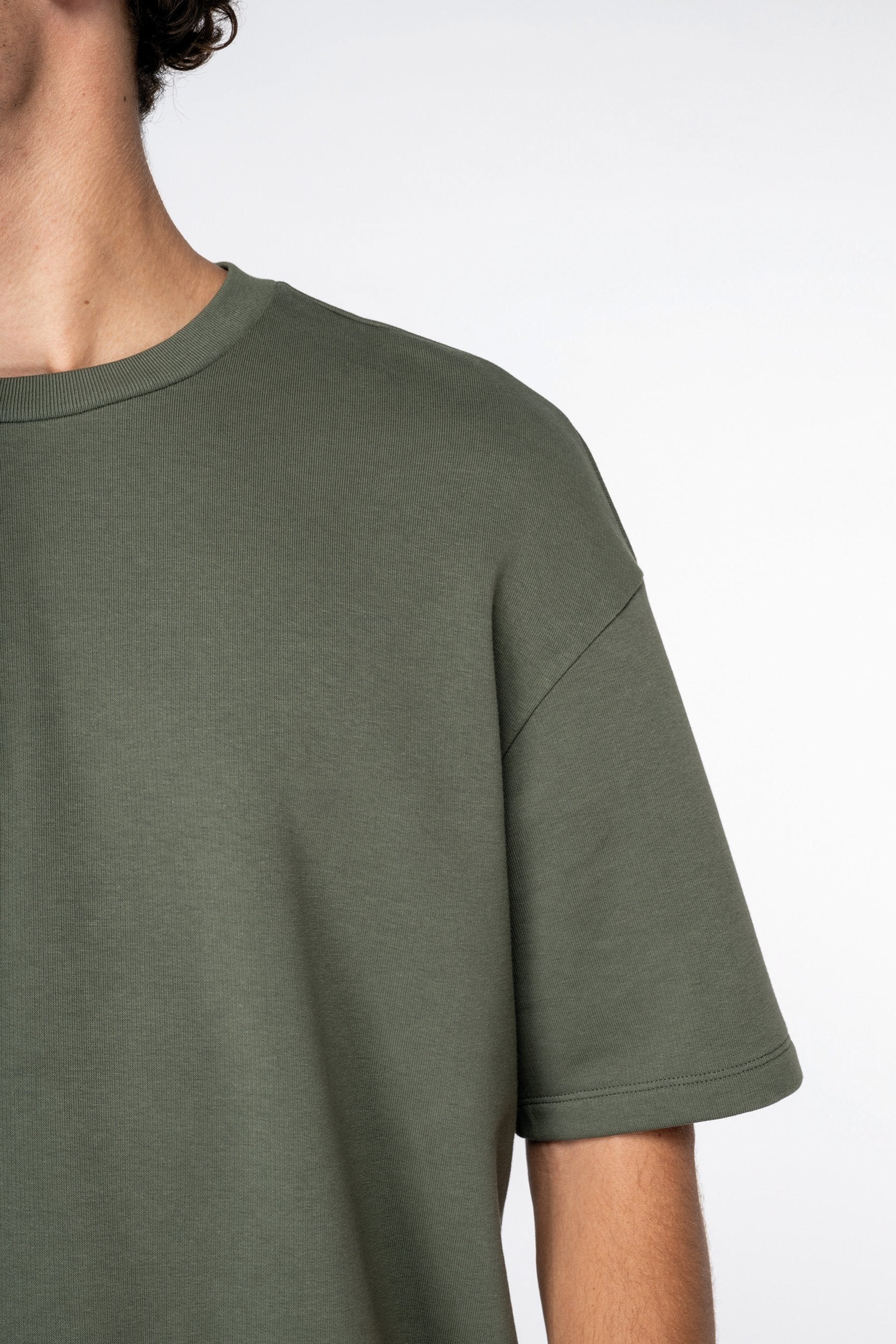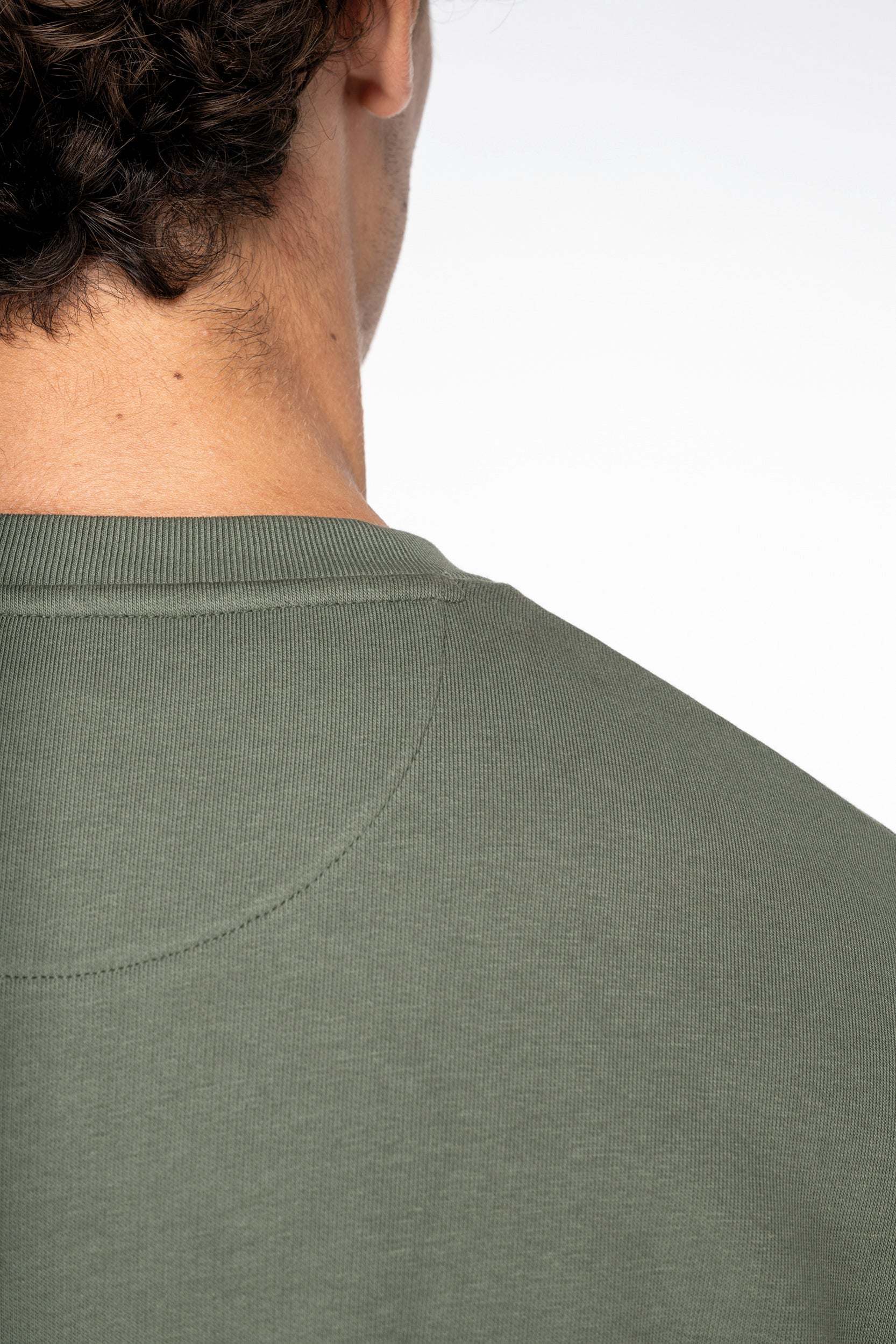 85% algodón orgánico / 15% poliéster reciclado posconsumo. Algodón peinado. Corte oversize. Producto híbrido que combina sudadera y camiseta. Felpa no perchada de 3 hilos LST (Low Shrinkage Terry). 1/2 luna en la espalda. Lavado con enzimas. Cuello de canalé 1x1. Acabado de doble pespunte en la parte inferior de las mangas y de la prenda.