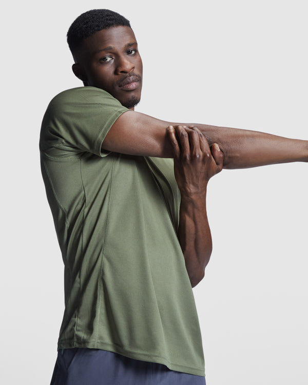 Camiseta técnica de manga corta ranglán. Escote redondeado con cubrecosturas. Cortes laterales con remallado al tono.