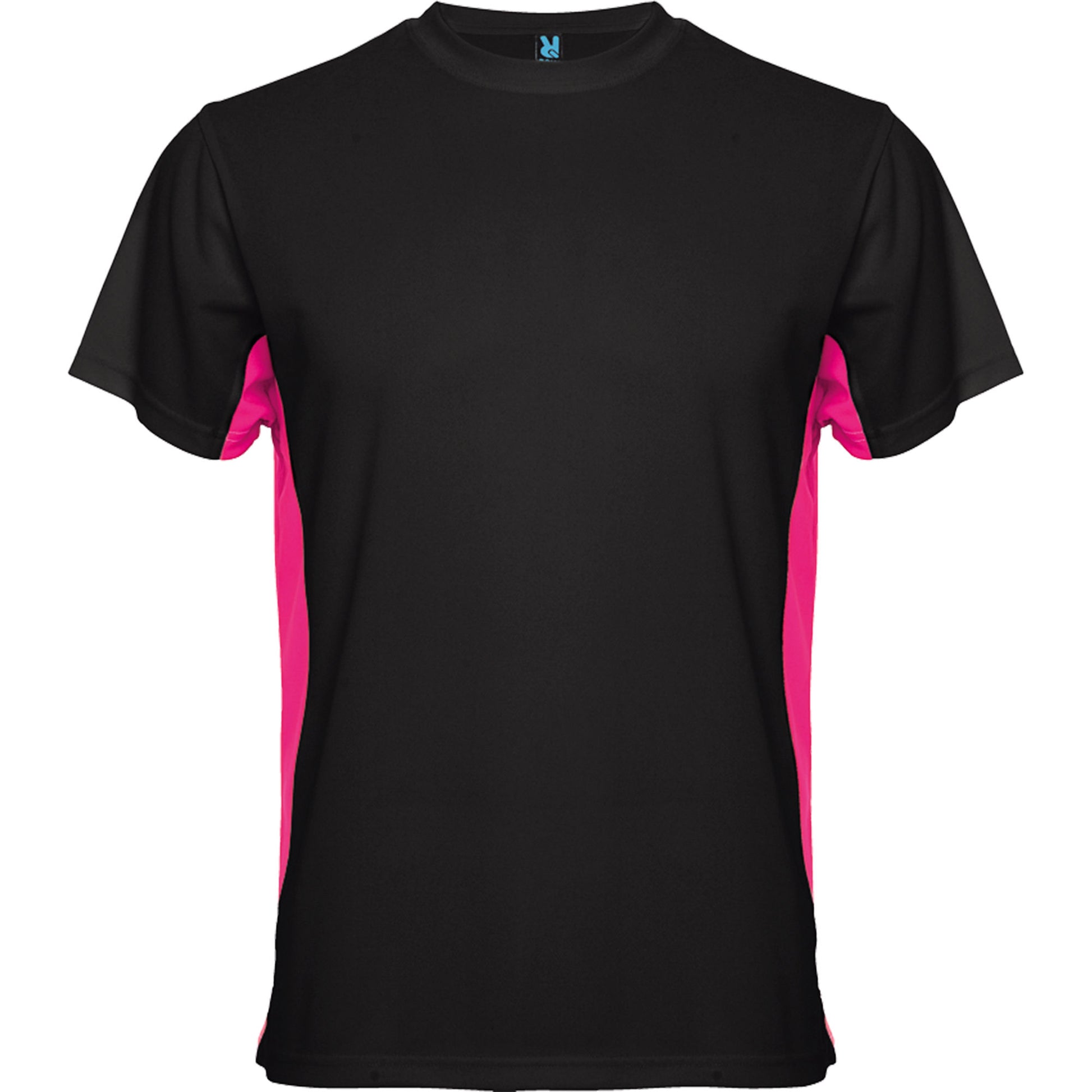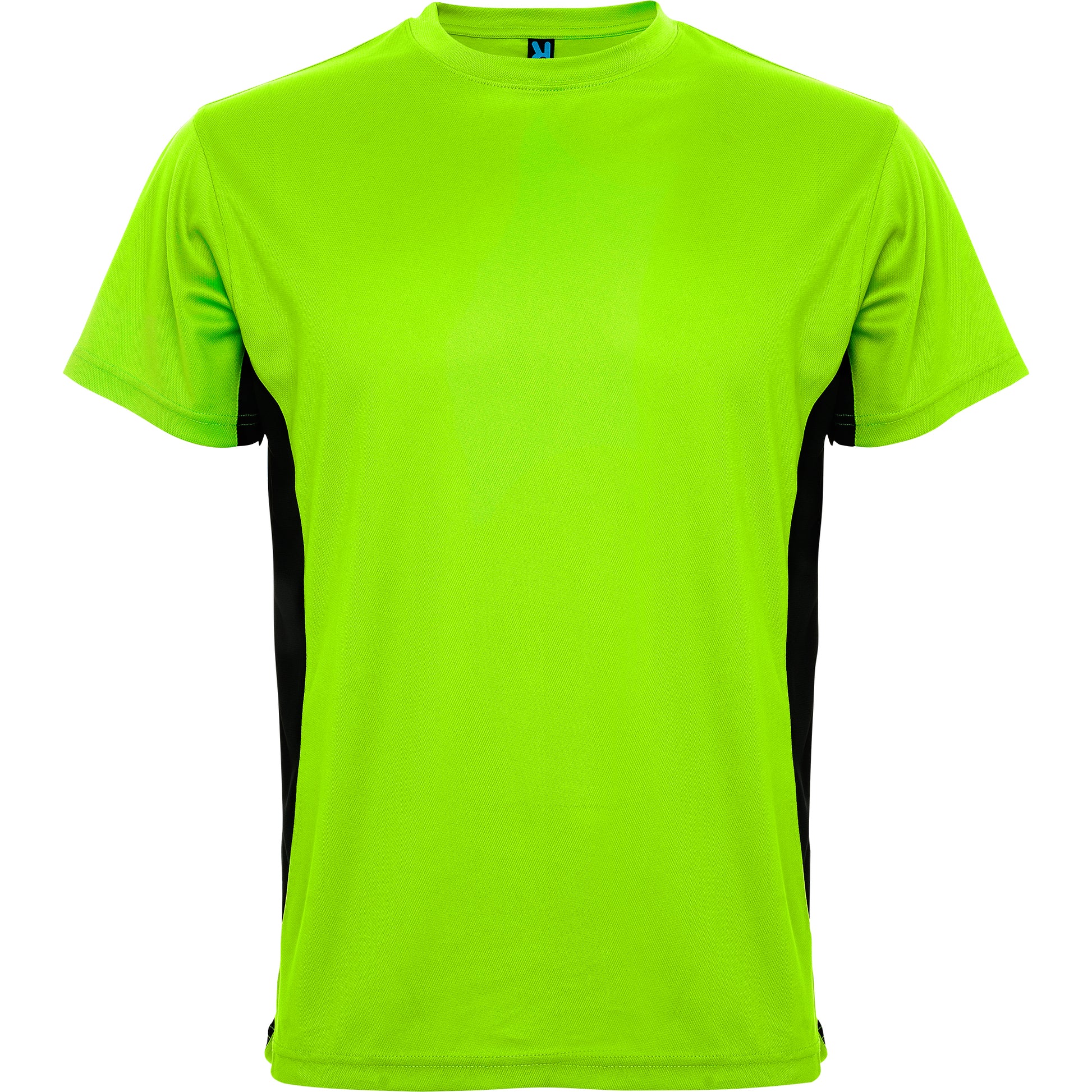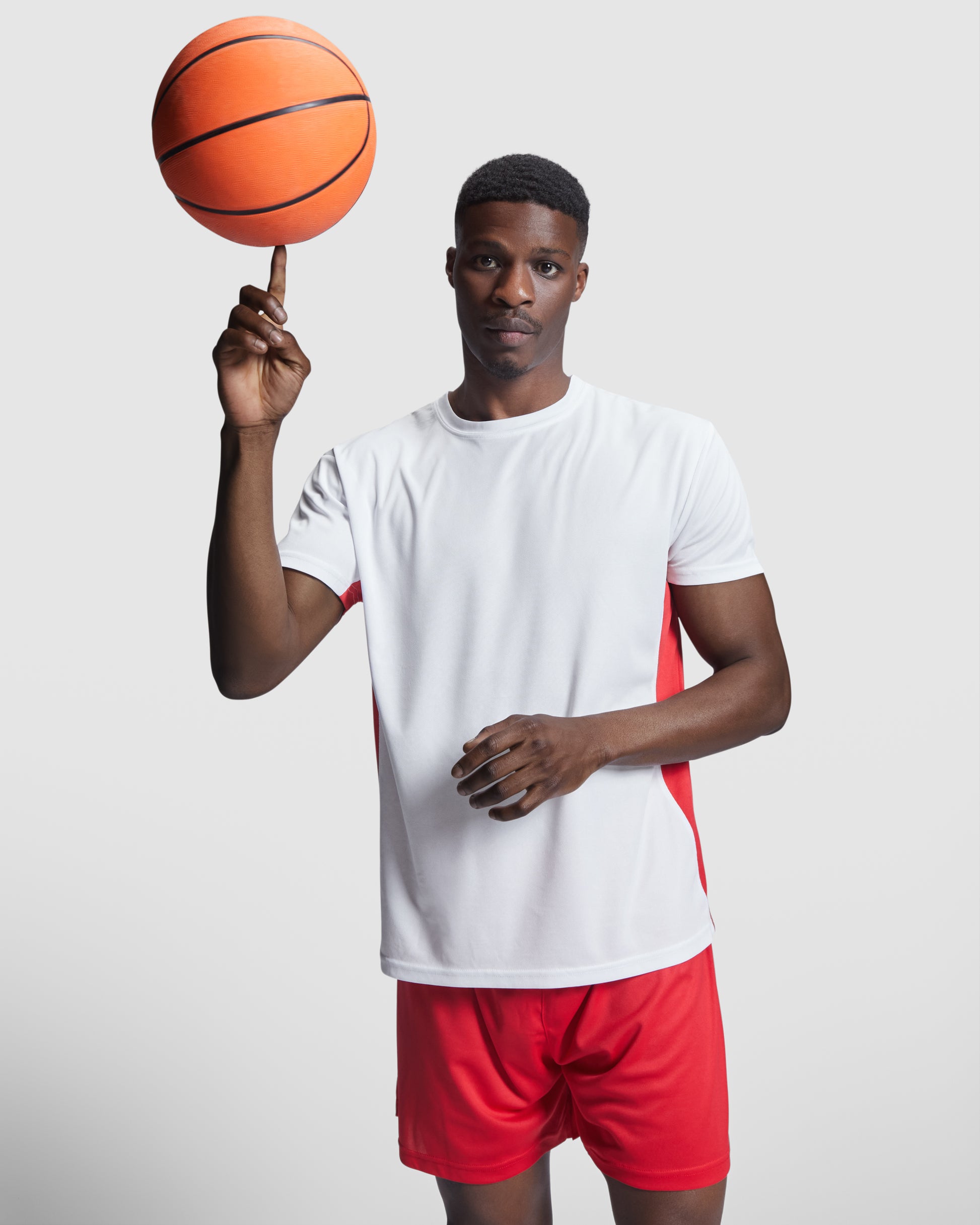 Camiseta técnica de manga corta transpirable. Cuello redondo con cubre costuras a tono. Tejido de fácil secado. Combinación de colores, paneles laterales a contraste.