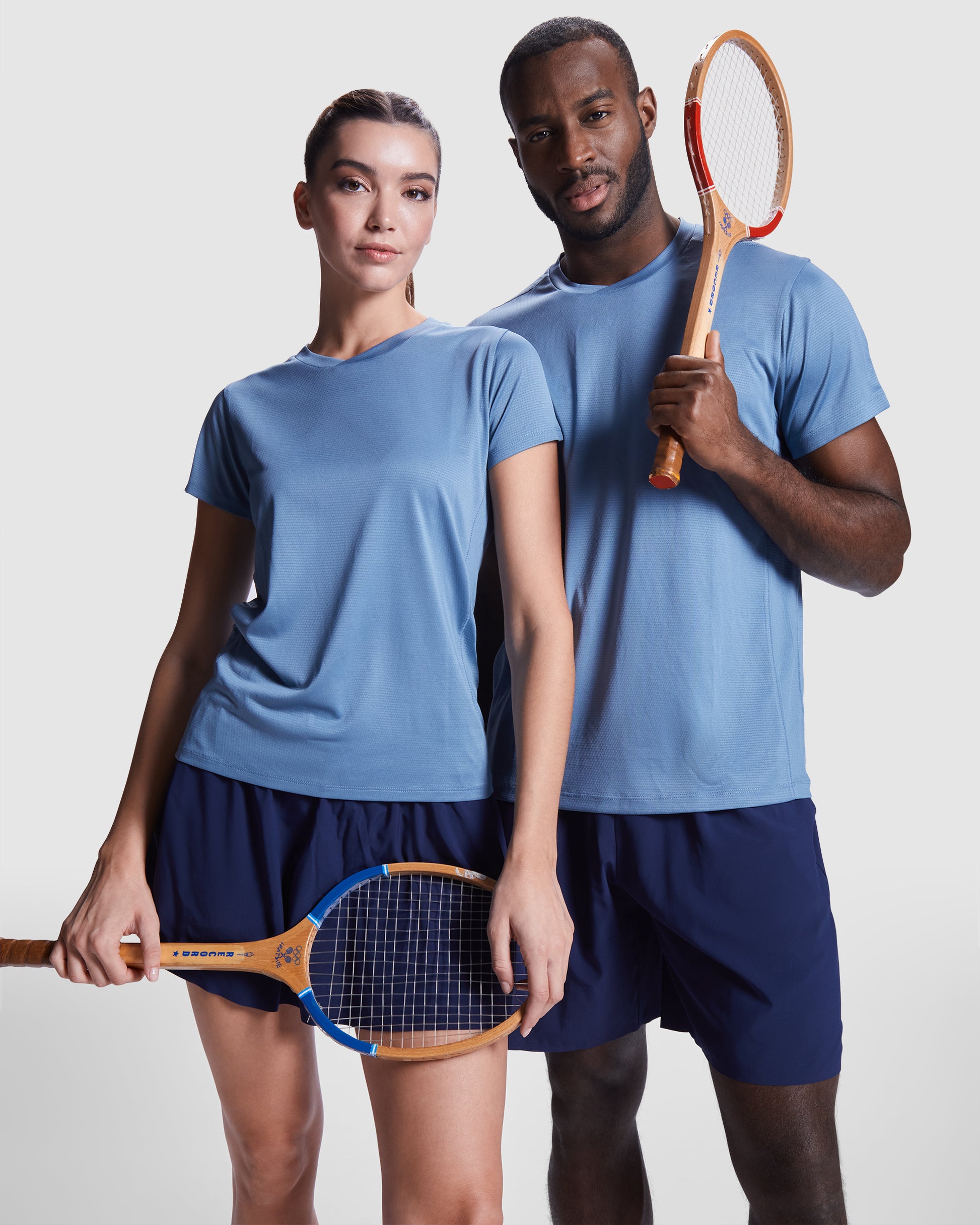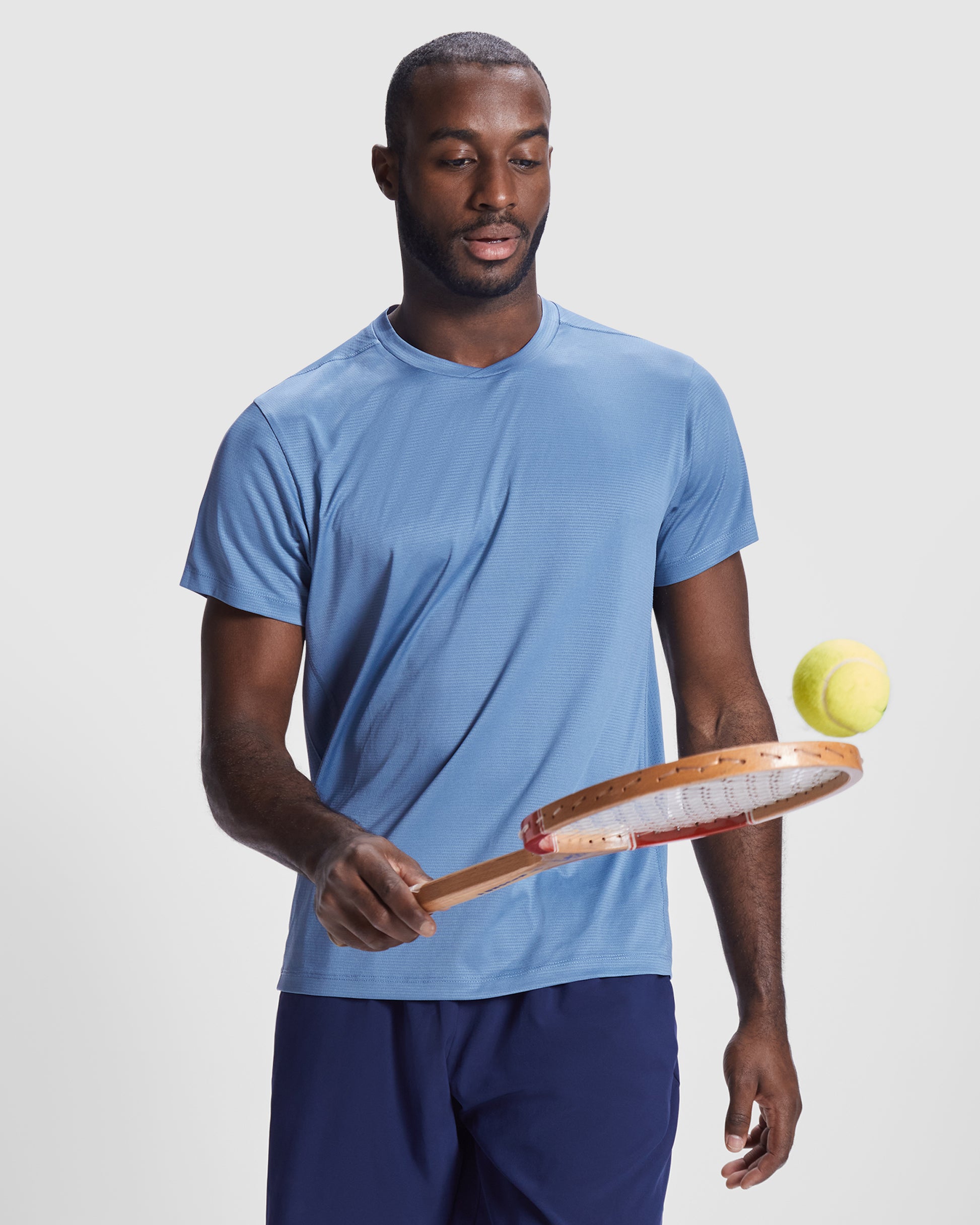 Camiseta técnica de manga corta para hombre. Tejido ligero realizado en poliéster reciclado. · Cuello con detalle cruzado y cubrecosturas. · Canesú en espalda y piezas en mangas en tejido transpirable. · Costuras adelantadas e inclinadas en laterales y hombros. · Combinada en tejidos transpirables y elásticos.