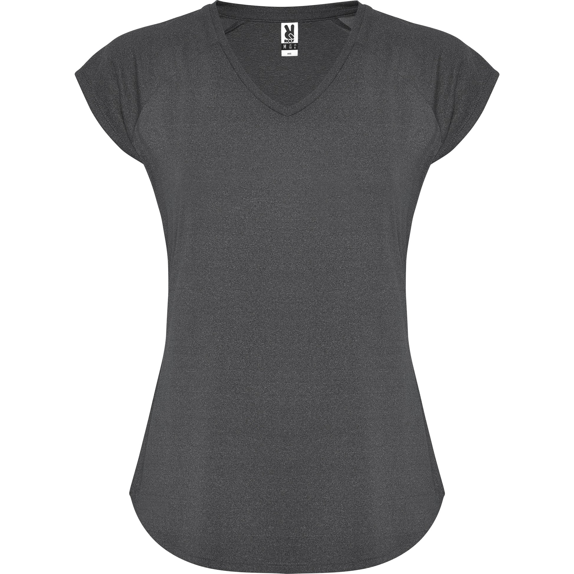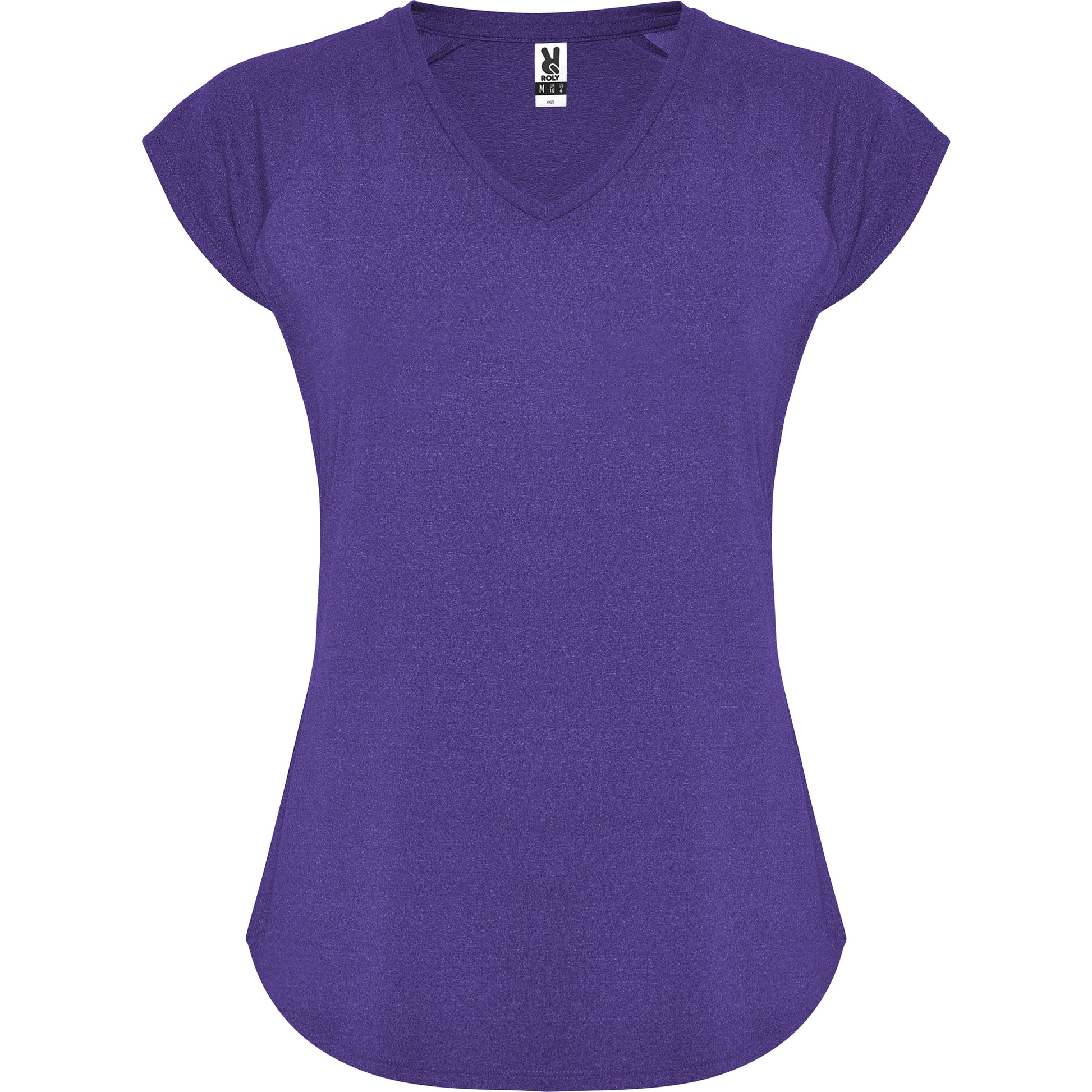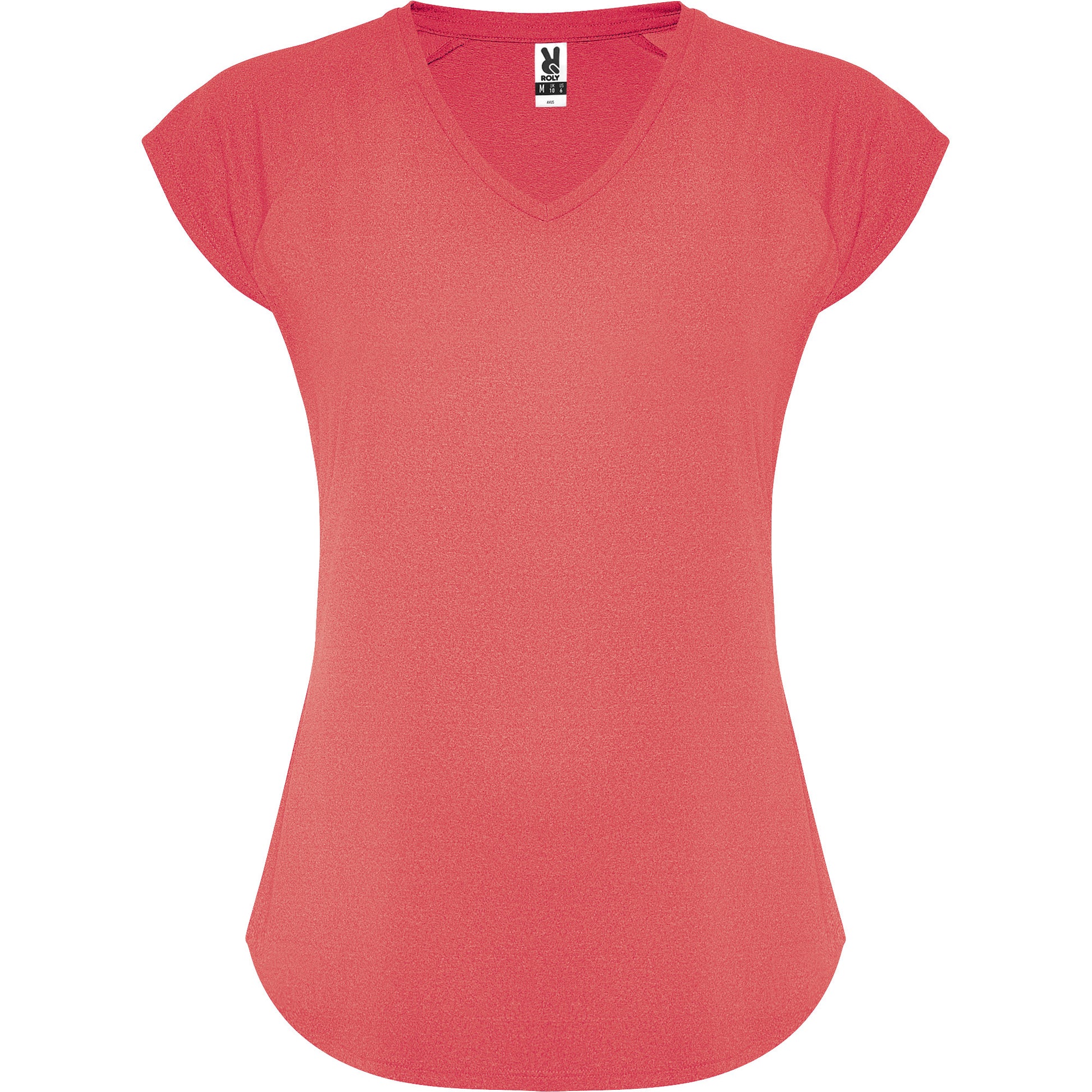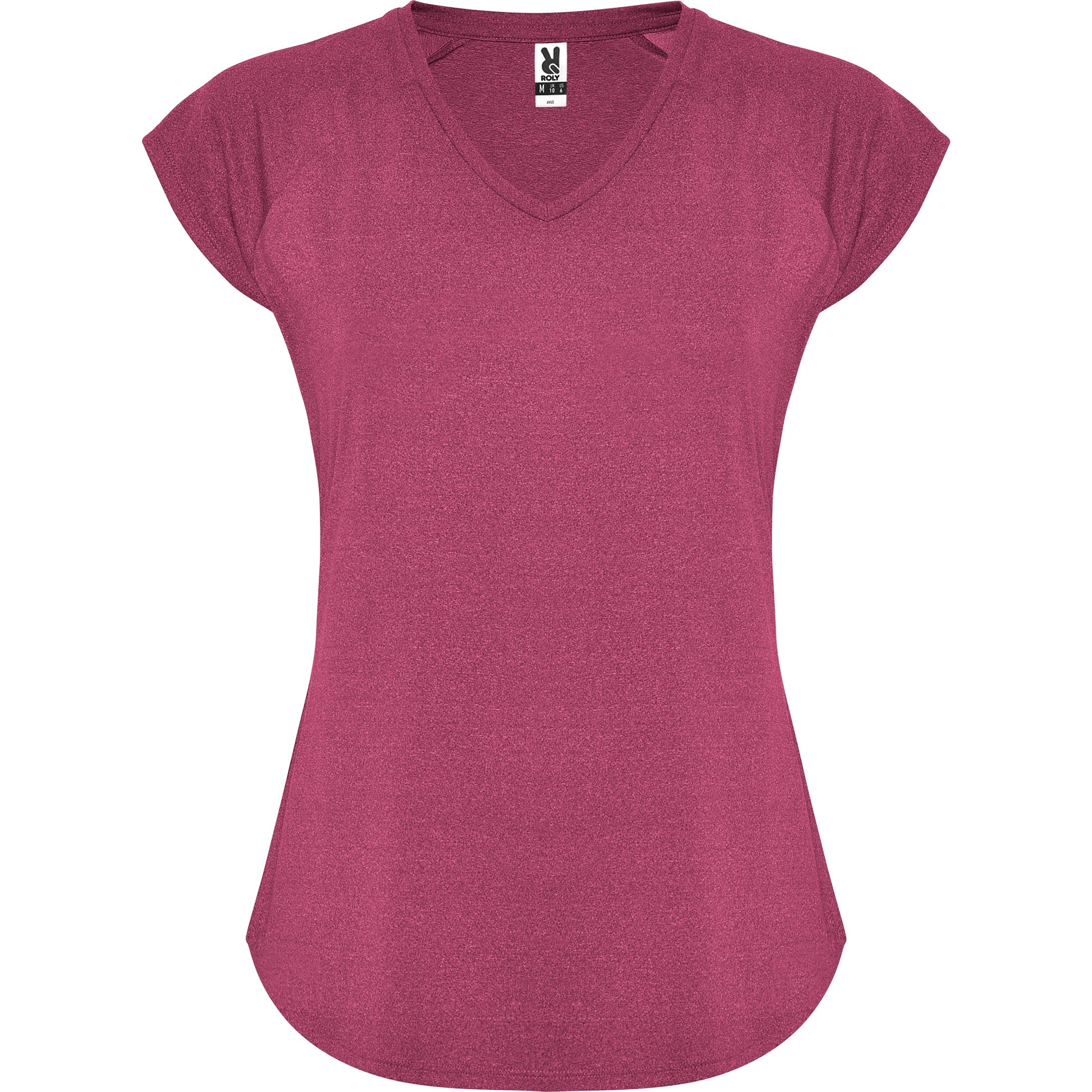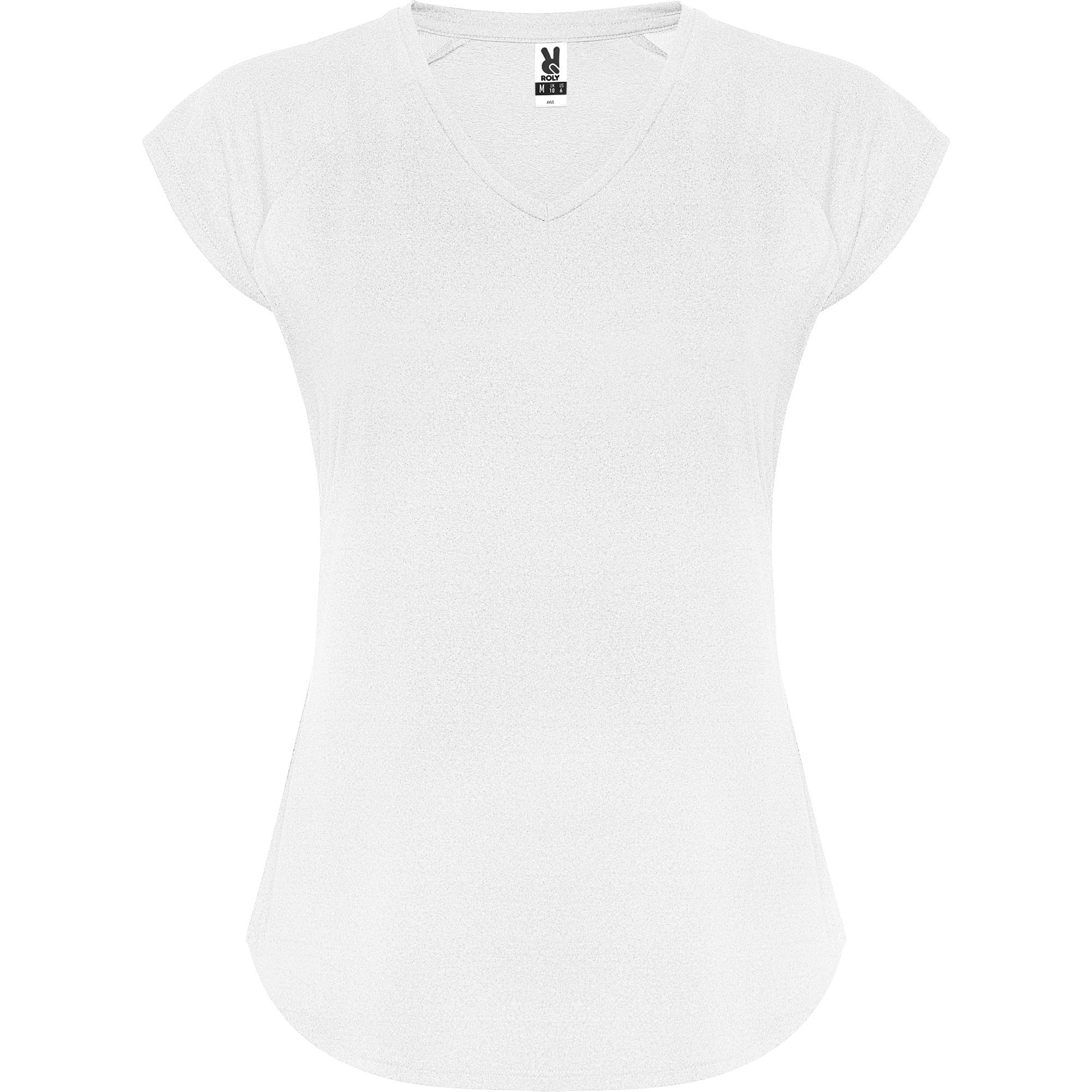Camiseta técnica multi-deporte de mujer manga corta estilo manga ranglan. Cuello pico. Tejido poliéster con tacto algodón. Corte entallado.