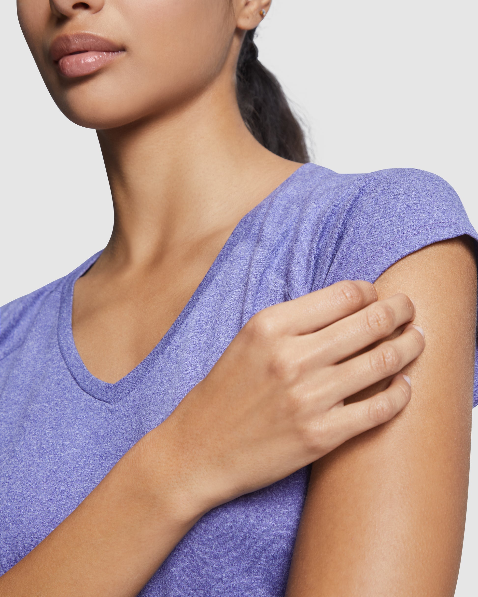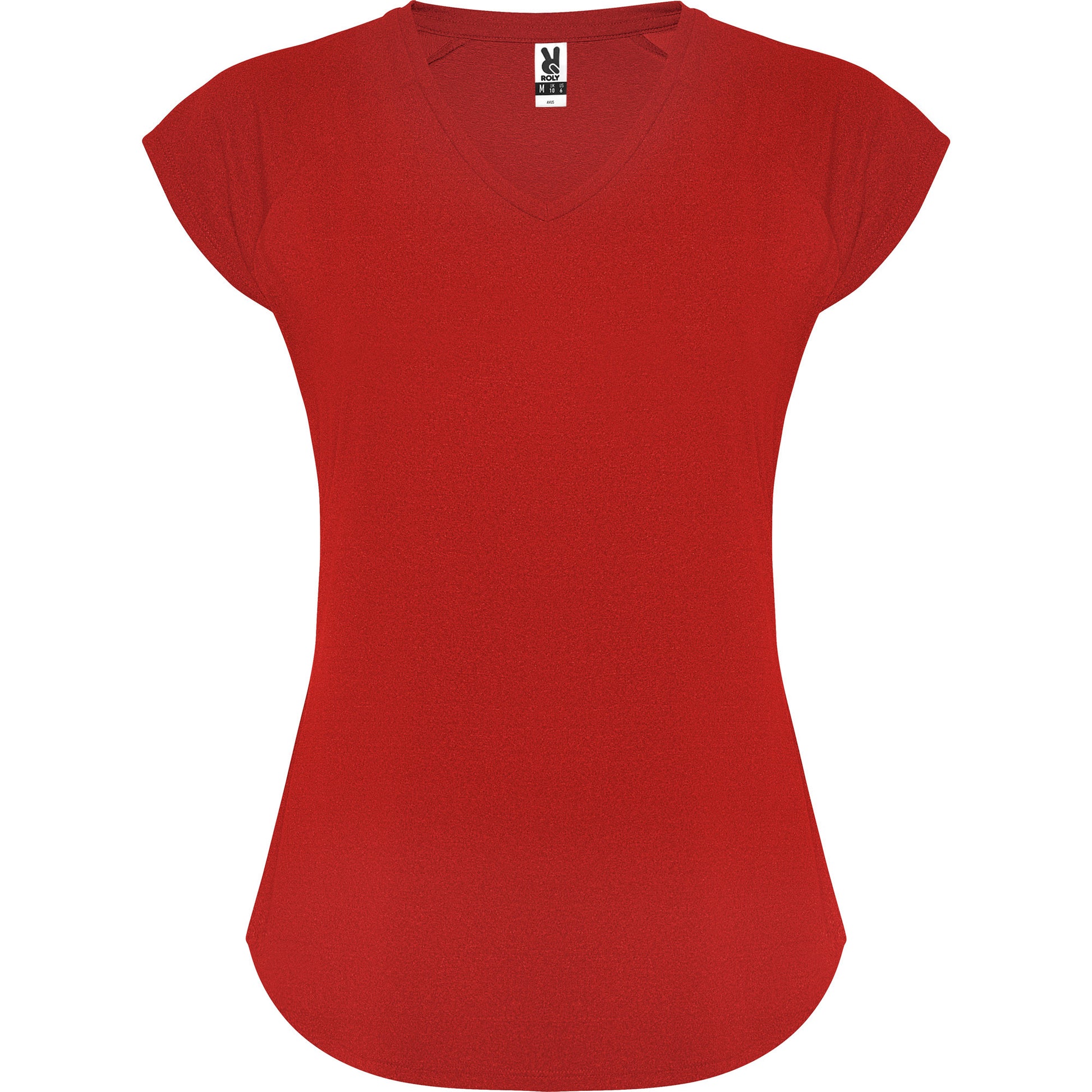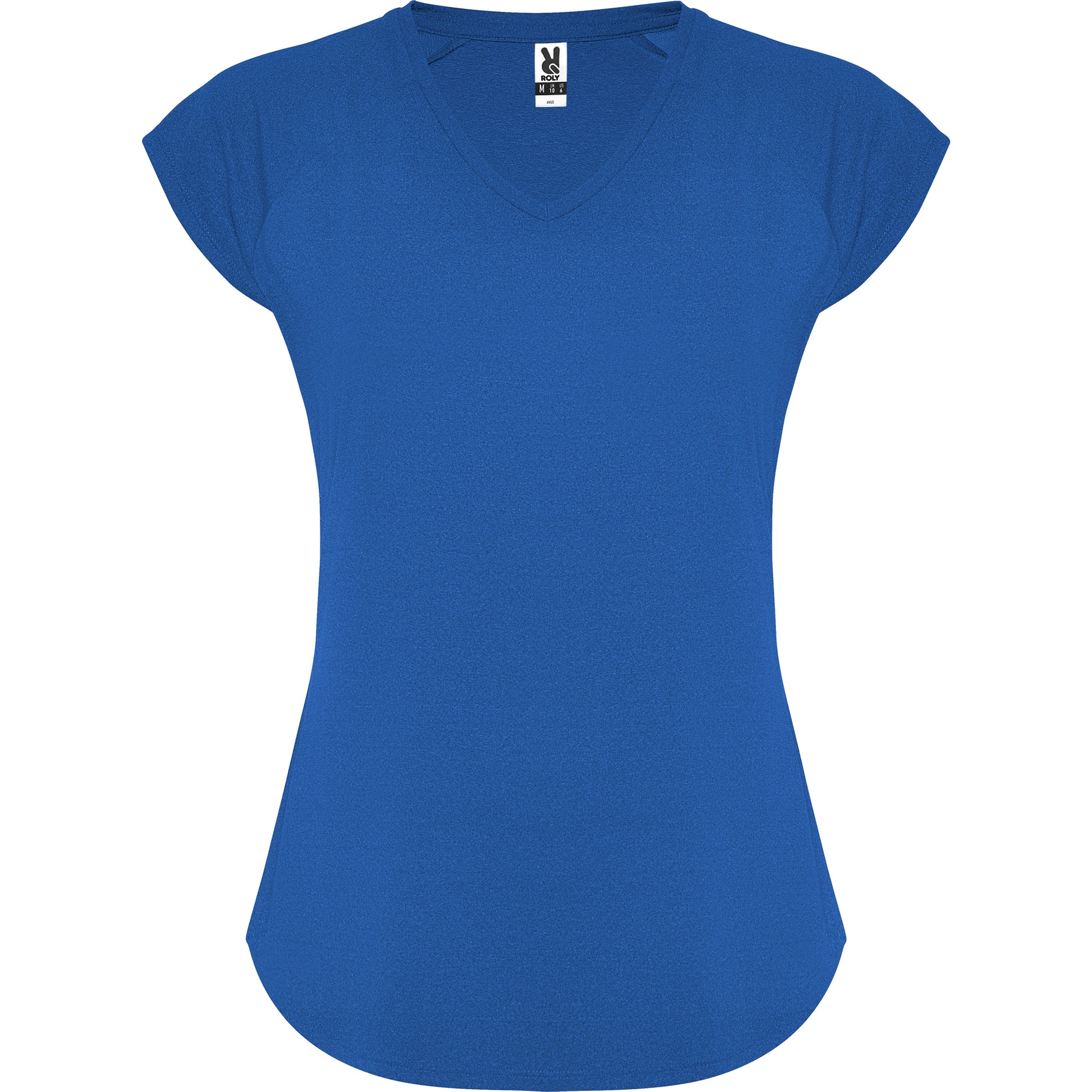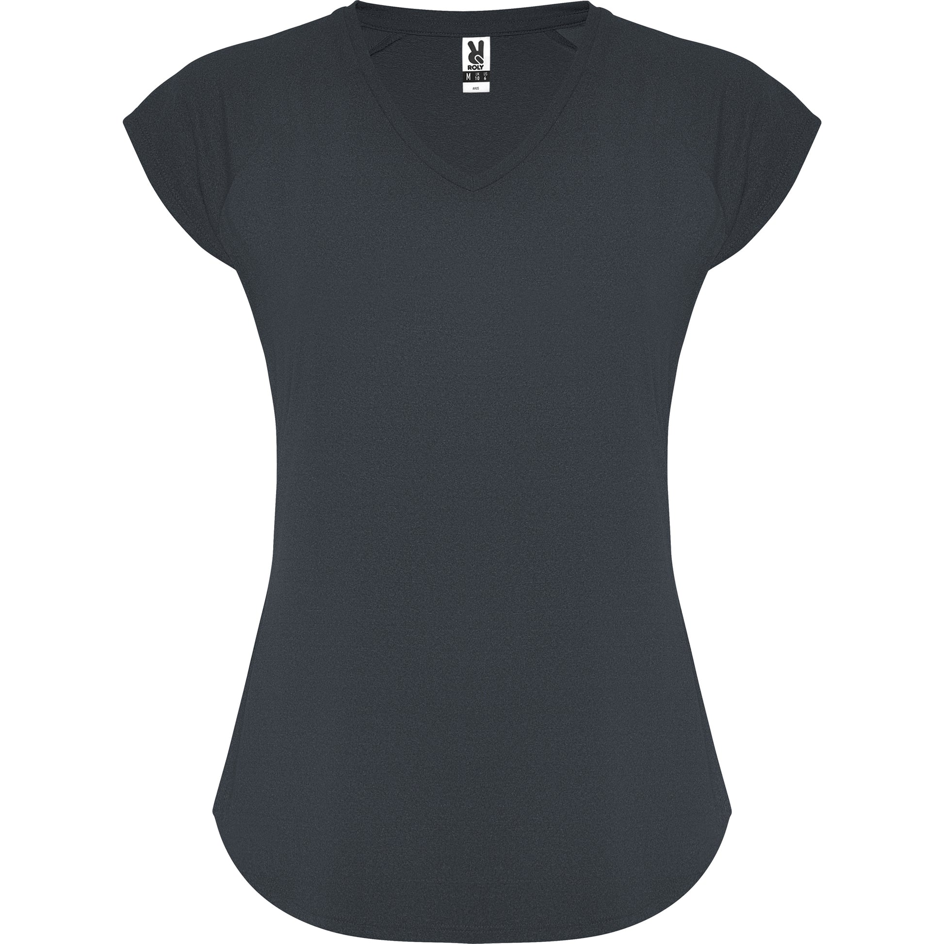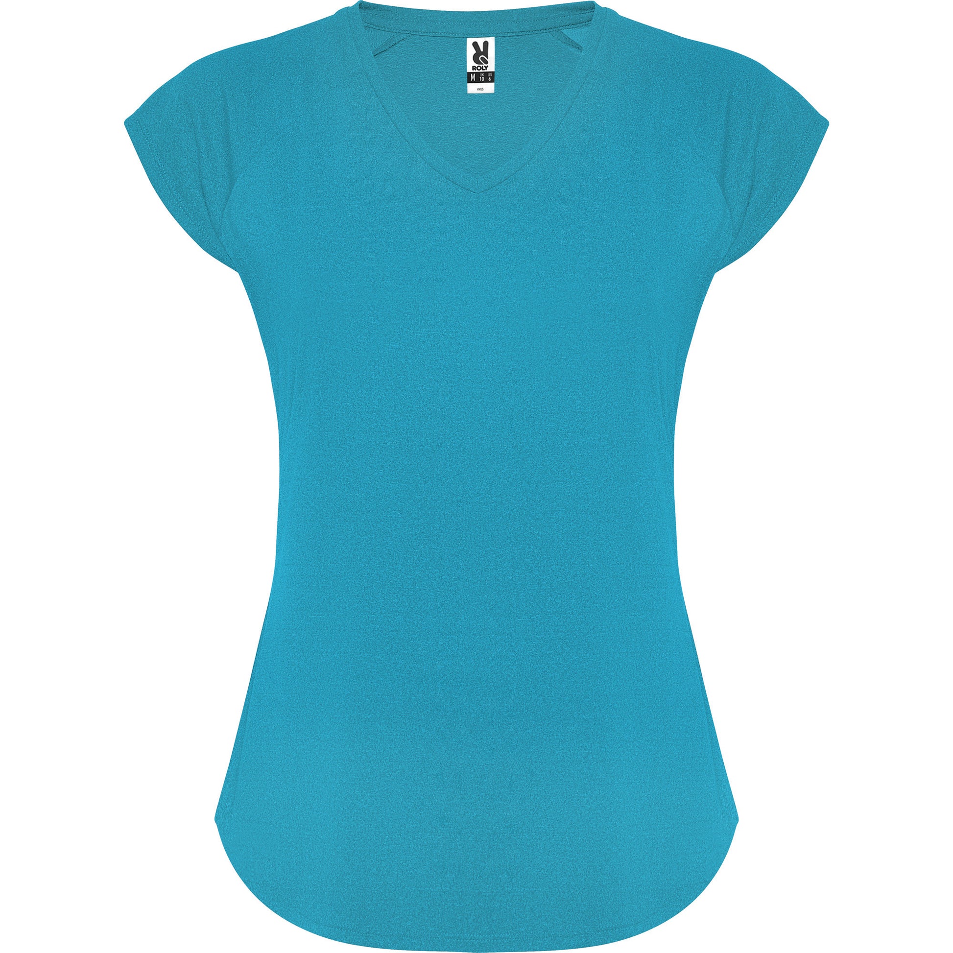 Camiseta técnica multi-deporte de mujer manga corta estilo manga ranglan. Cuello pico. Tejido poliéster con tacto algodón. Corte entallado.