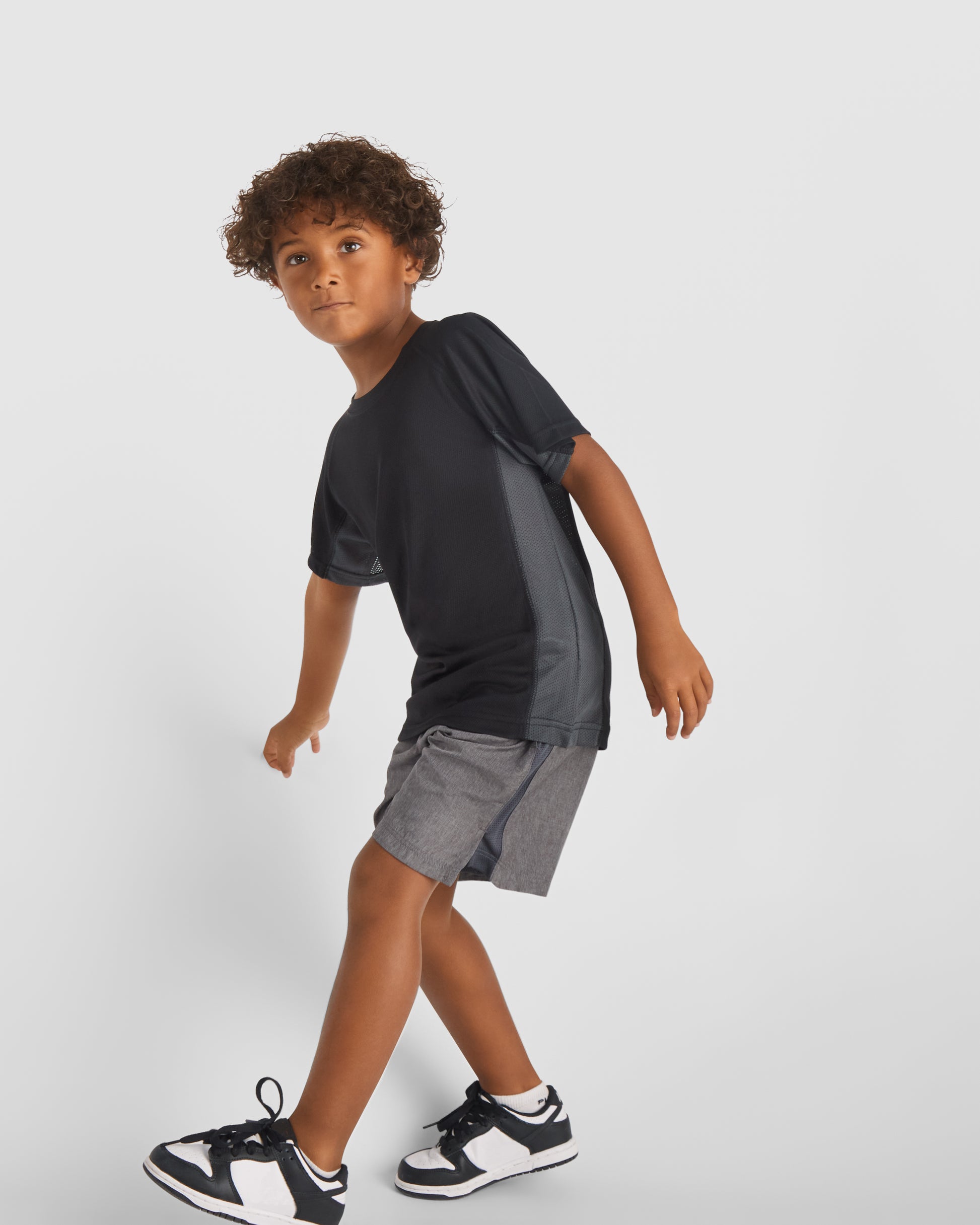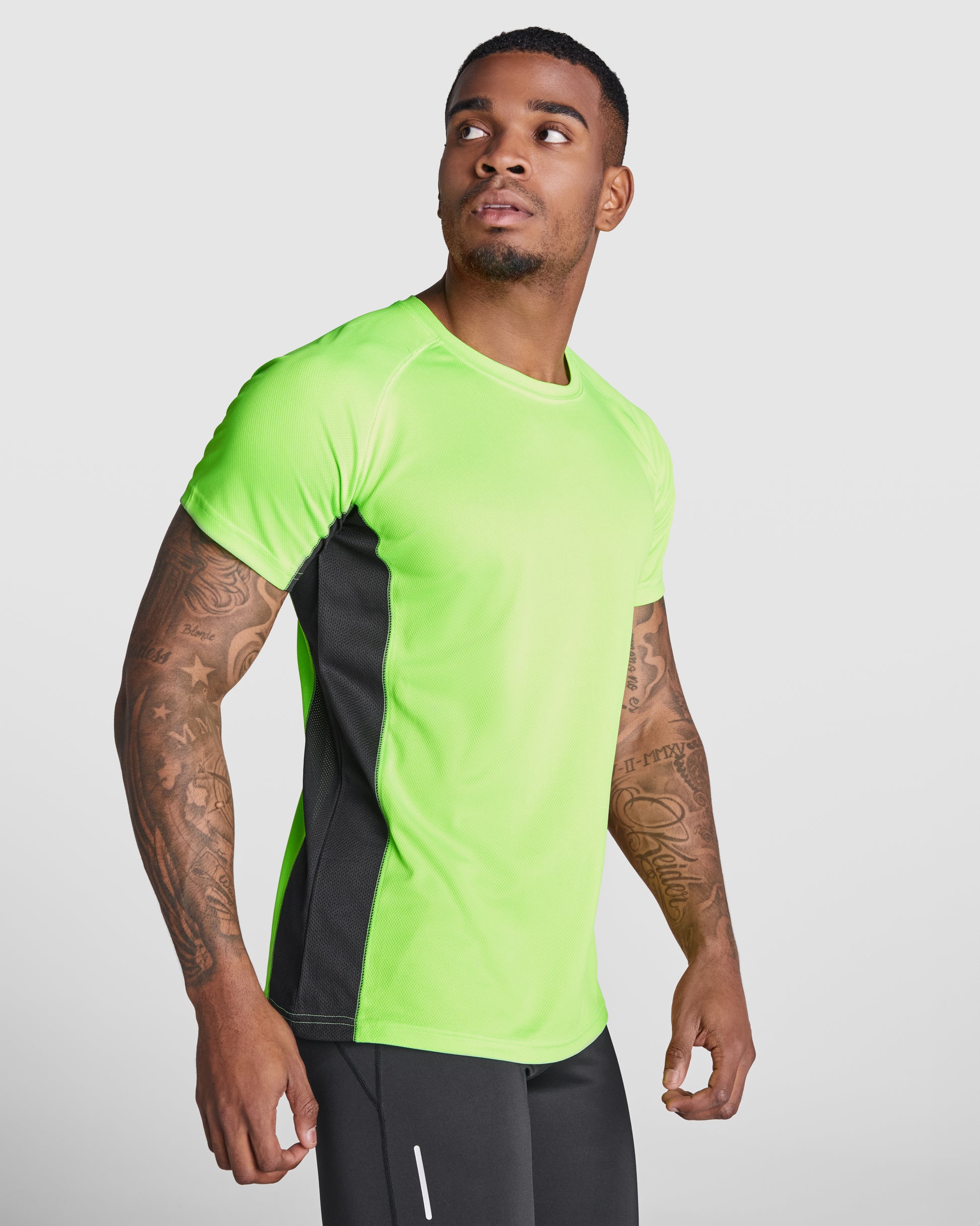 Camiseta técnica combinada con dos tejidos de poliéster, manga corta de estilo ranglán. Tejido principal bird's eye y paneles laterales e interior de la manga con tejido micro perforado. Cuello redondo con cubrecosturas de refuerzo en su interior. Camiseta de tejido confortable y fácilmente adaptable al cuerpo.