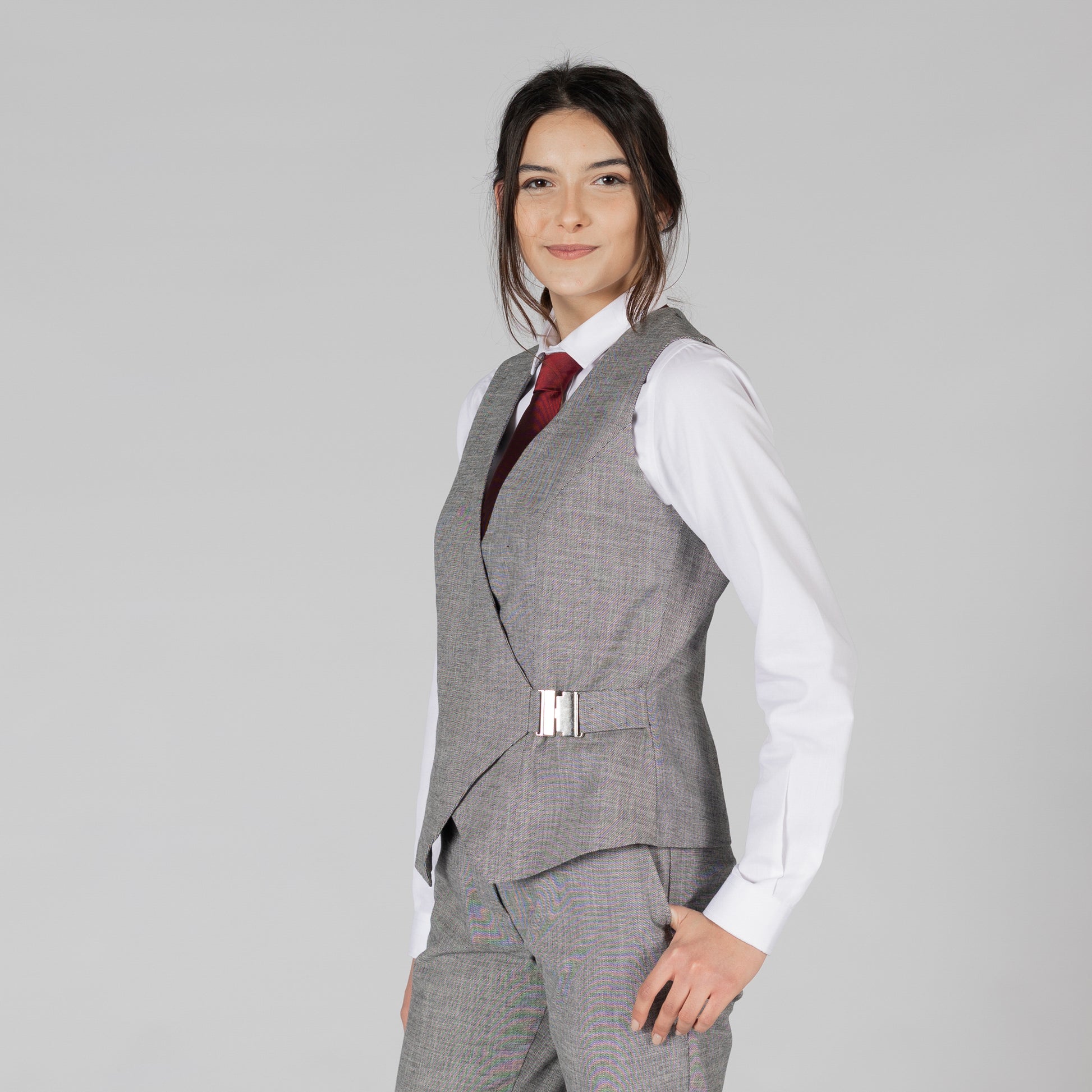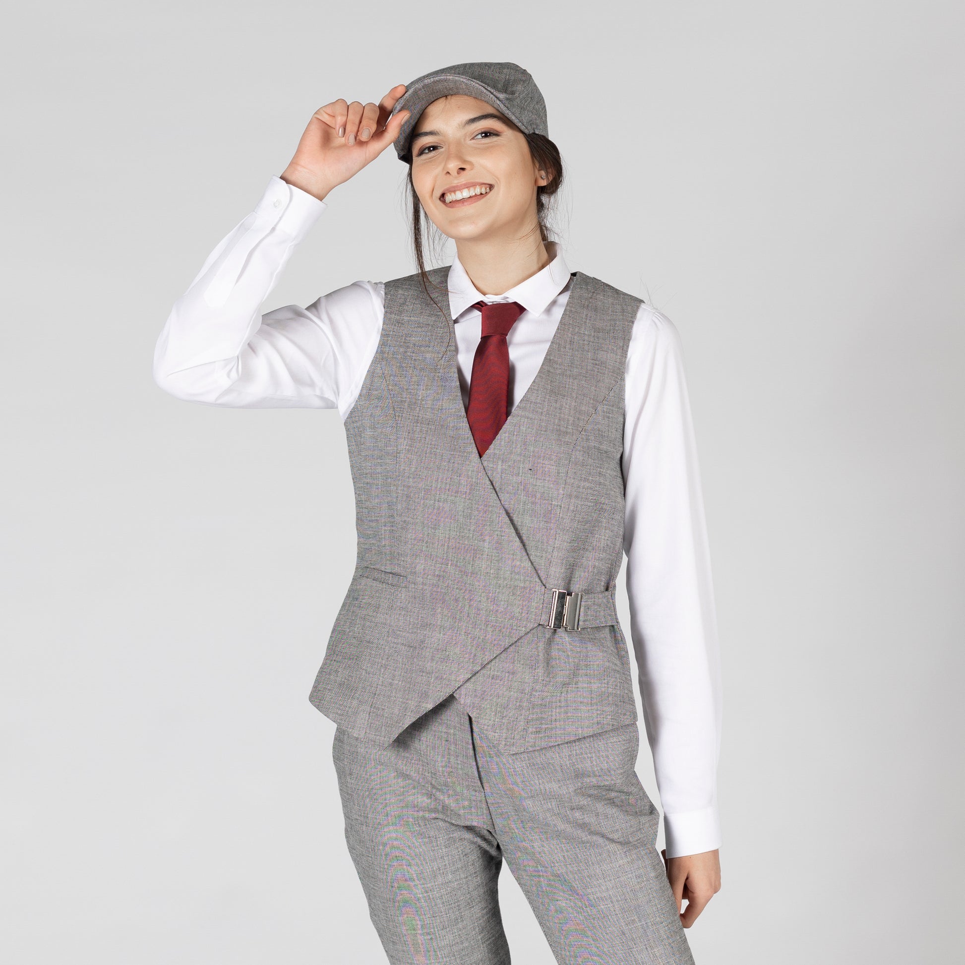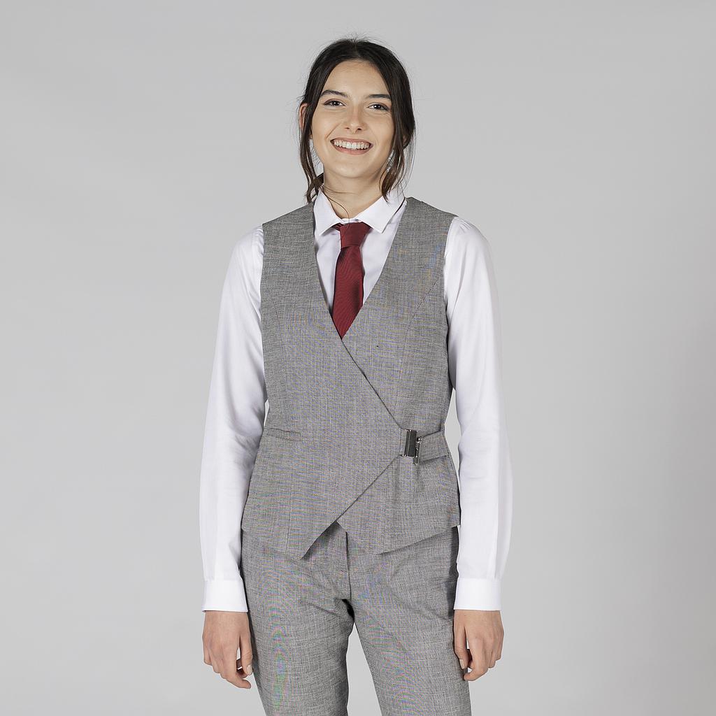 El chaleco presenta un diseño cruzado elegante que se cierra con una hebilla. Esta característica no solo agrega estilo, sino que también permite un ajuste personalizado para mayor comodidad.