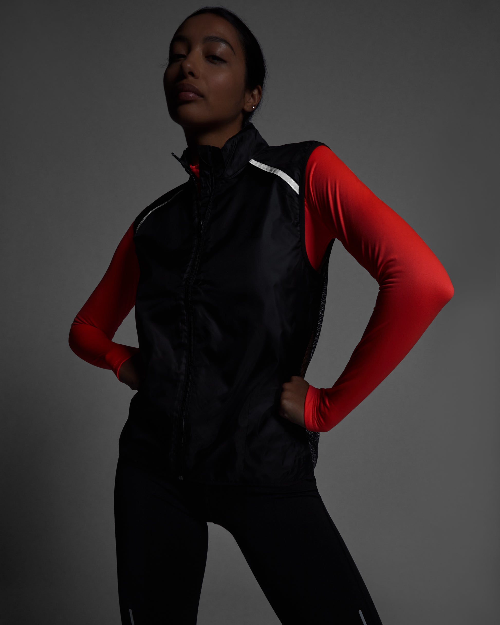 Chaleco técnico ligero de running, con cremallera frontal a tono con protector de barbilla. Ribete elástico en sisa y bajo. Parte inferior de la espalda en tejido micro perforado. Detalles reflectantes en la parte superior, delantera y trasera. Bolsillo con elástico para guardar el chaleco y llevarlo en la muñeca.
