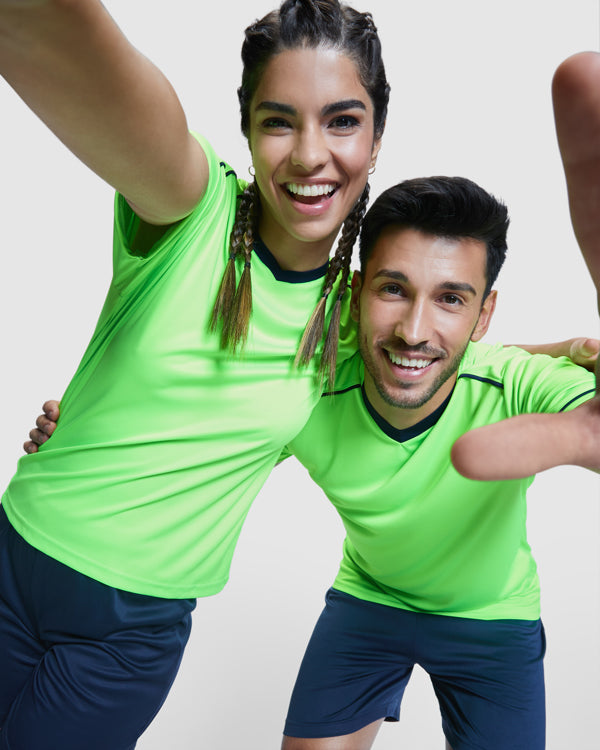 Conjunto deportivo de camiseta y pantalón. ·Camiseta con doble cuello de fantasía con acabado en pico con cubrecosturas reforzado en el interior. ·Hombro con adorno de ribete en contraste. ·Manga corta con apertura acabada en vivo y con ribete de adorno en contraste. ·Pantalón corto con cintura elástica con ajuste de cordón en su interior y pespunte de seguridad.