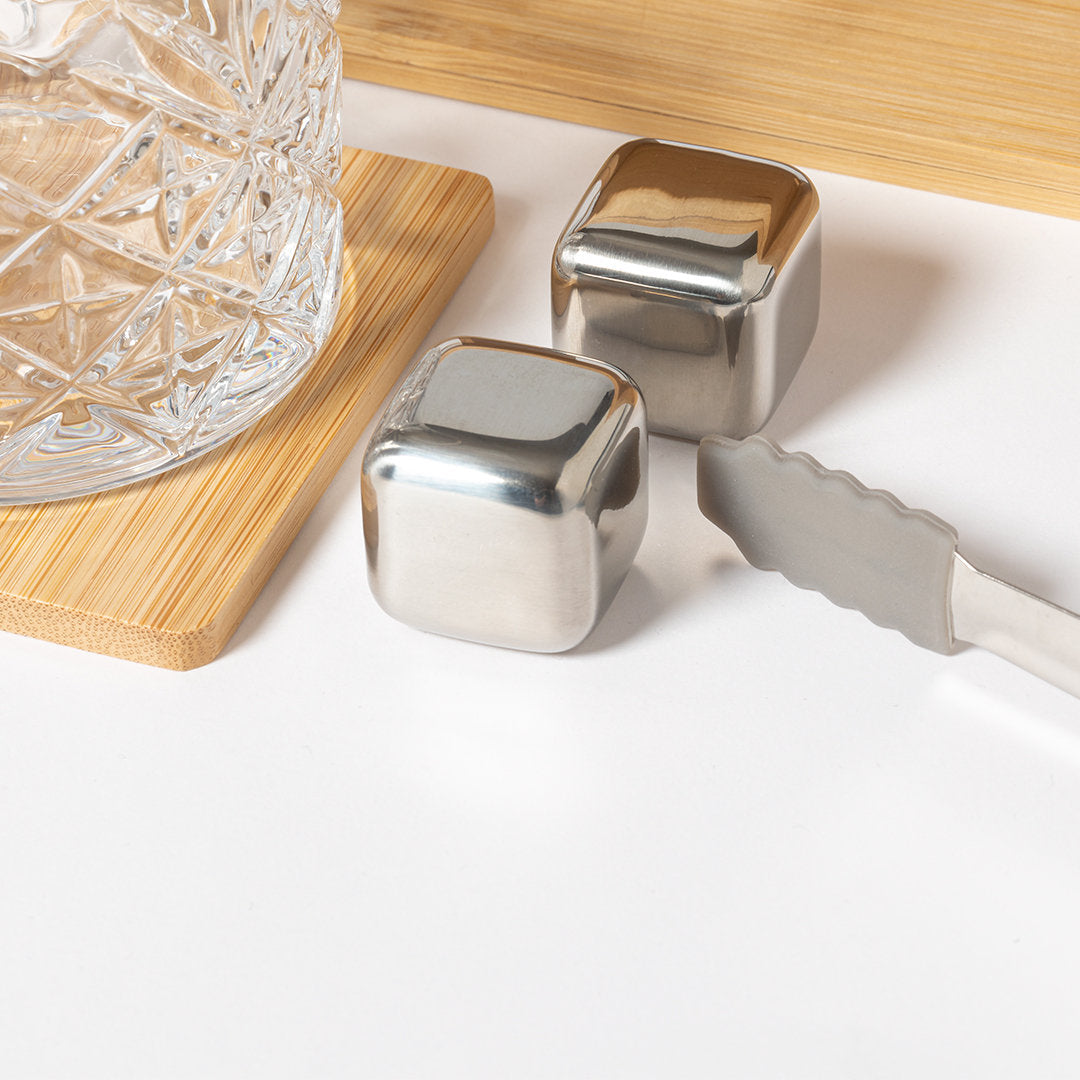 Vaso Cristal 350 ml. 2 Cubitos Acero Inox Reutilizables. Pinza Acero Inox. Posavasos Bambú
