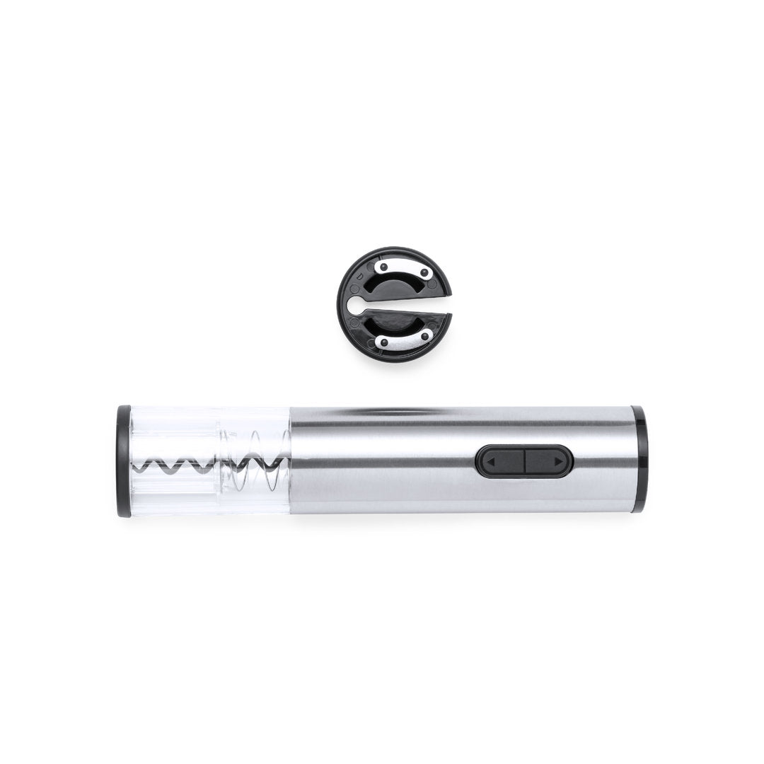 Sacacorchos eléctrico fabricado en acero inox y resistente ABS, con cortacápsulas incluido. Presentado en caja individual de diseño, con manual de instrucciones en español e inglés. Alimentación a pilas (4xAA no incluidas).