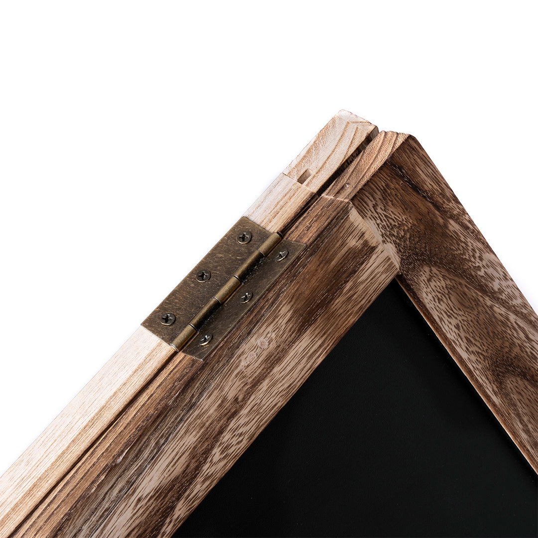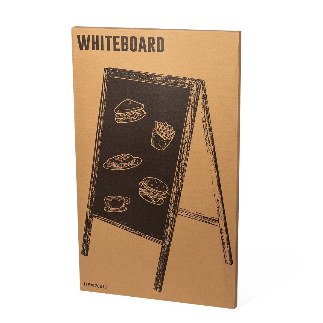 Versátil pizarra fabricada en madera. Diseñada para adaptarse a cualquier entorno y fácil de transportar gracias a su forma plegable. Amplia superficie para la escritura en ambas caras, con un tamaño total de 106 cm de alto y 59 cm de ancho. Presentada en caja de diseño kraft.