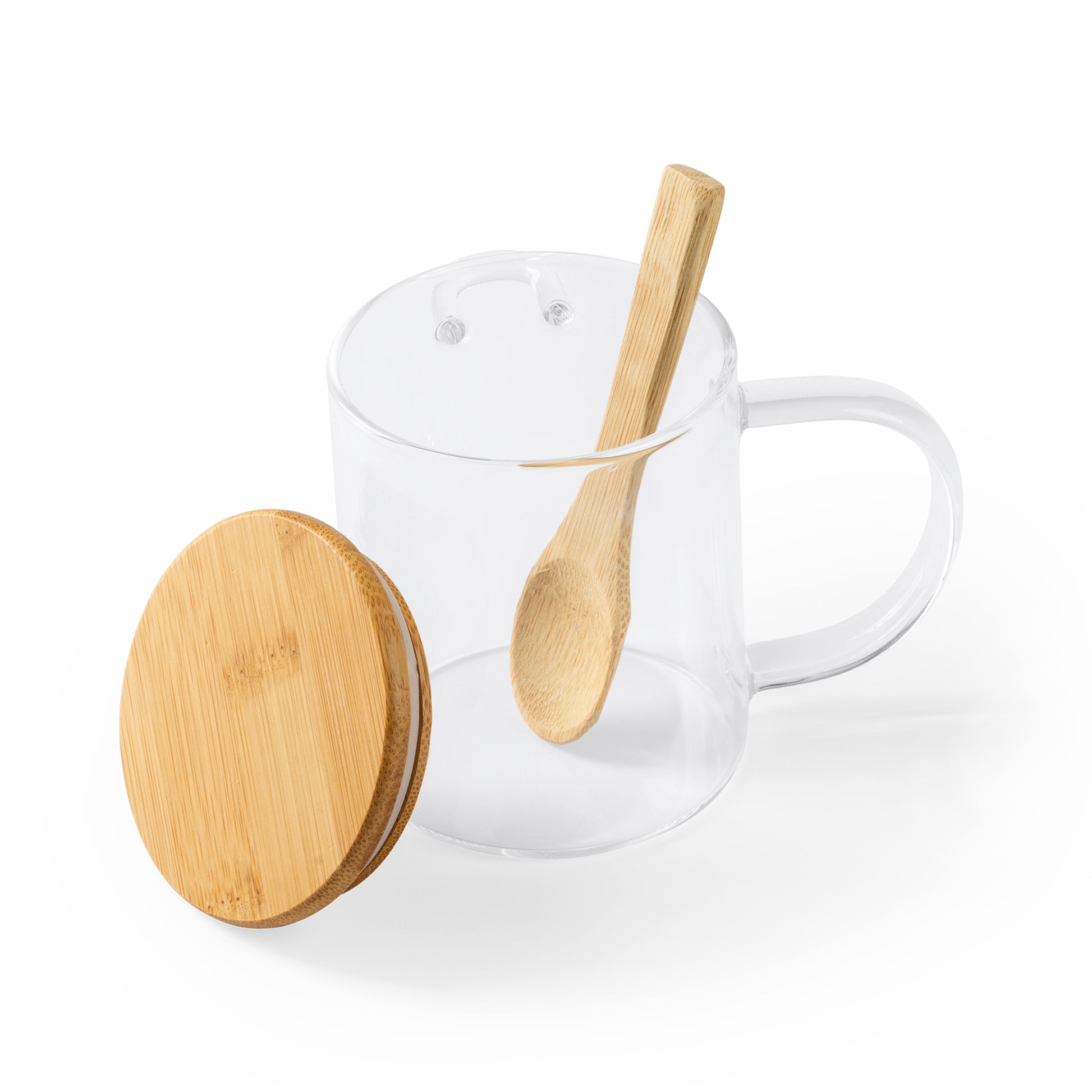 Fantástica taza de cristal borosilicato con tapa y cuchara de bambú a juego. Capacidad de 420 ml. 40-81R.