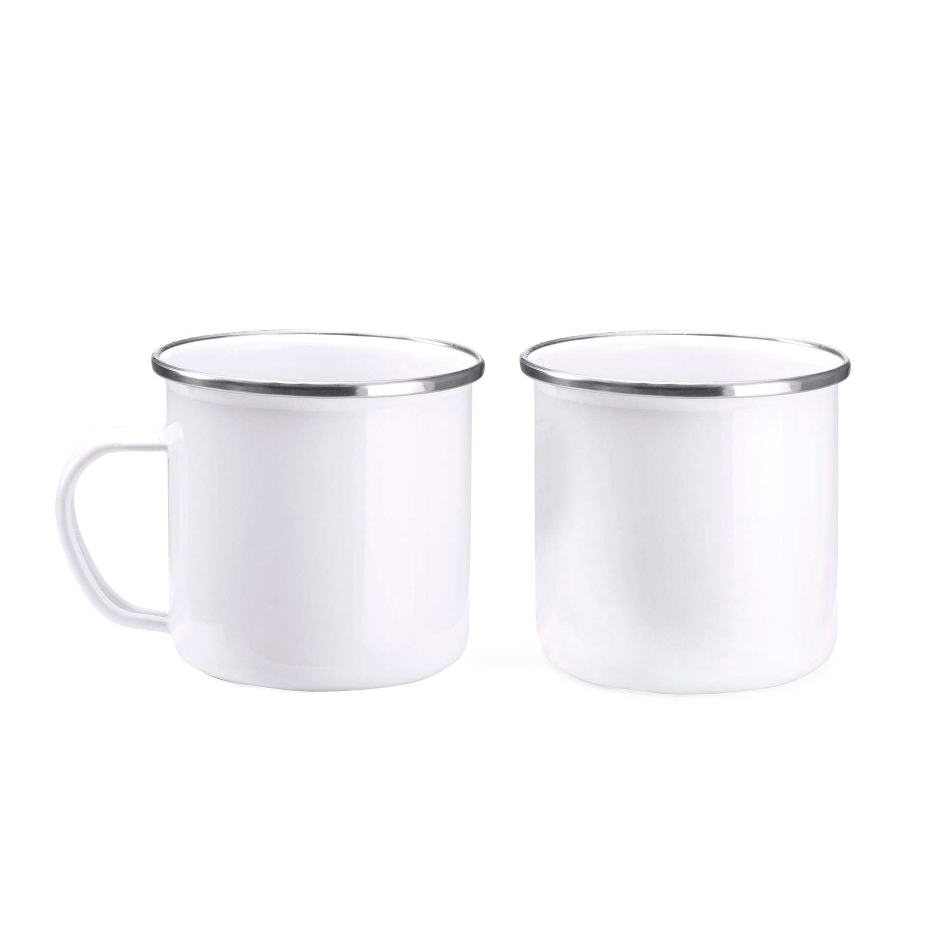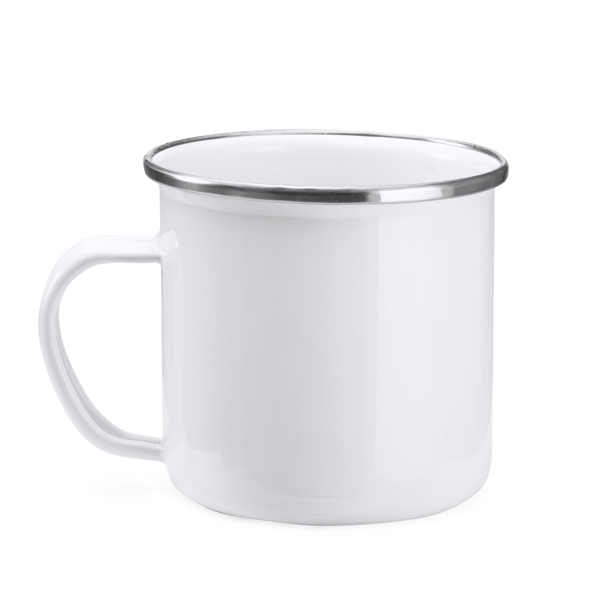 Fantástica taza metálica esmaltada con borde plateado, con capacidad de 380 ml y recubrimiento especial para sublimación, de estilo retro. 40-14R.