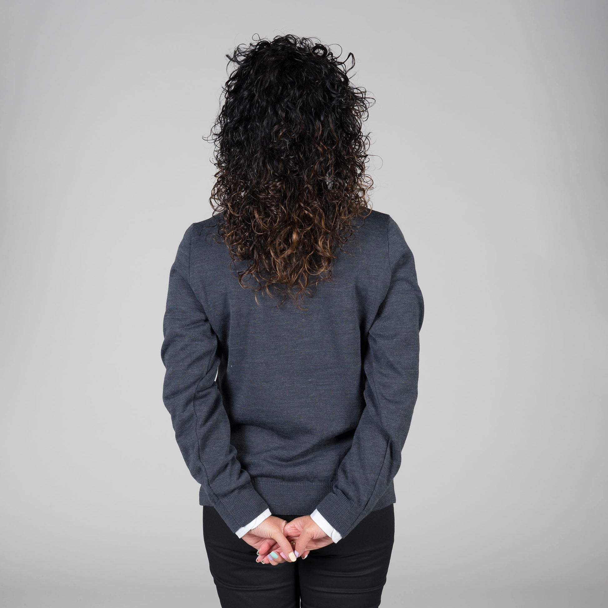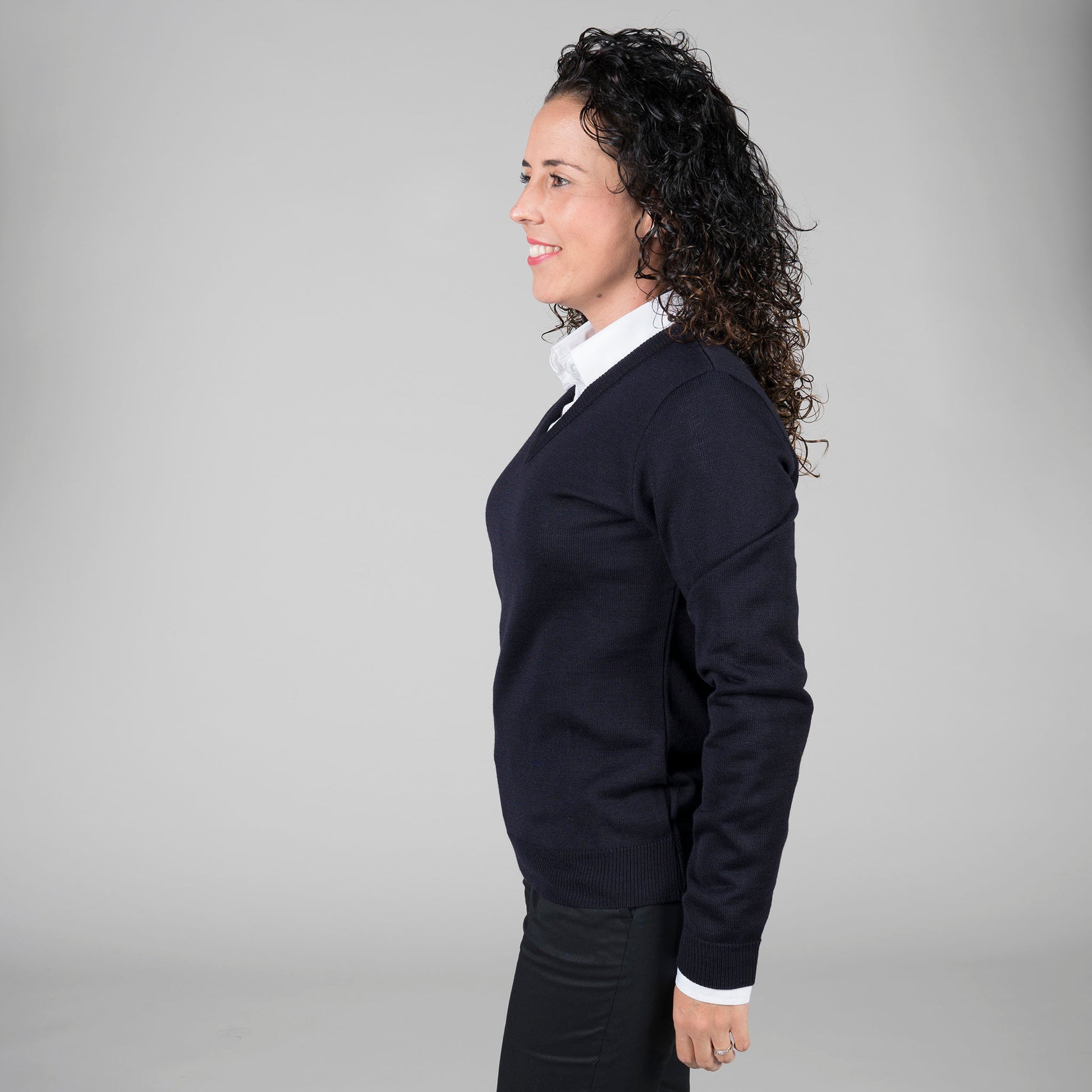 Este jersey ha sido diseñado pensando en la estética femenina clásica. Su cuello en pico añade un toque de elegancia sin excesos, lo que le permite lucir impecable en cualquier ocasión laboral.