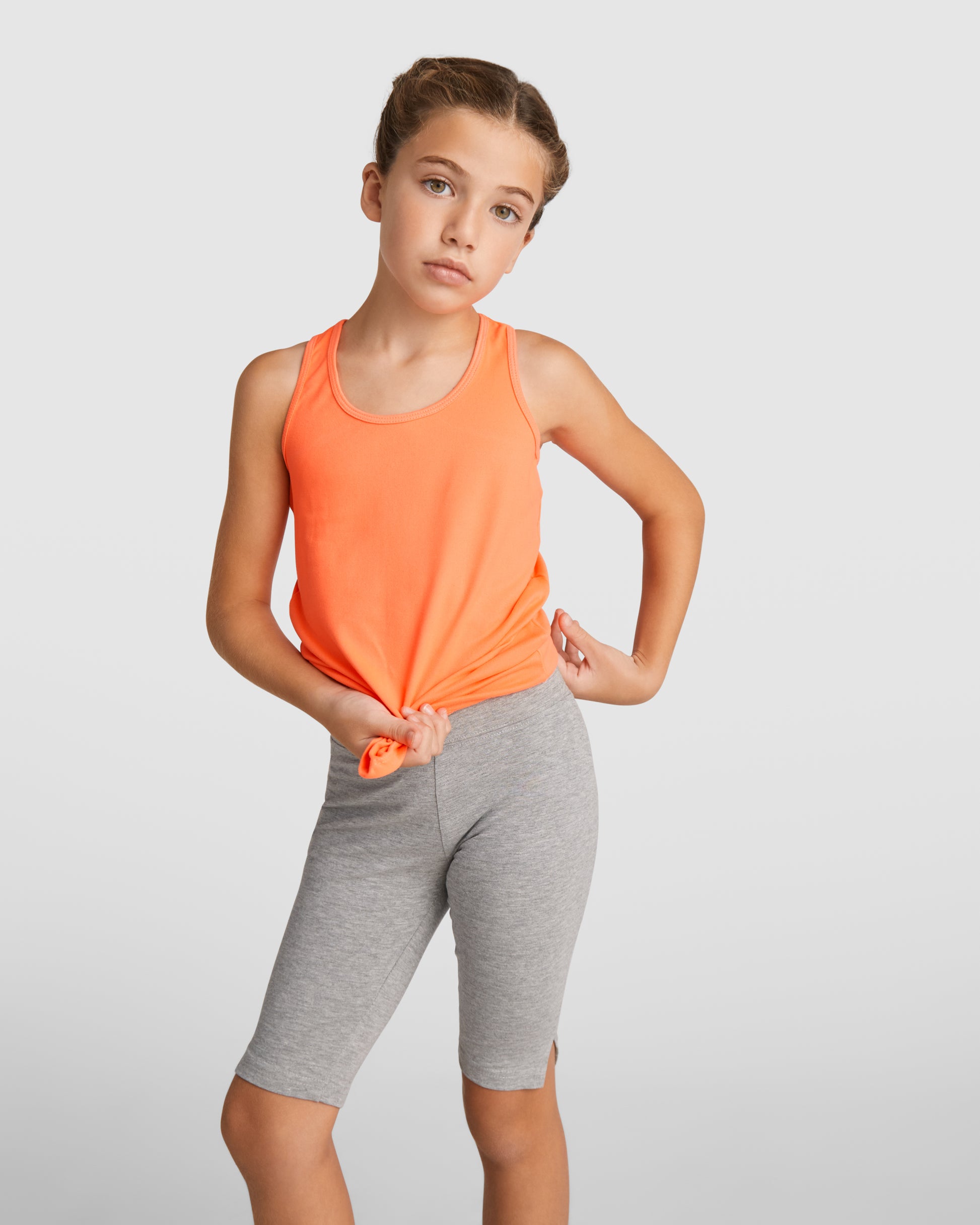 Material: 94% algodón / 6% elastano, punto liso, 270 g/m². Tallas para niñas, 210 g/m². Color gris vigoré 58: 81% algodón / 13% viscosa / 6% elastano.