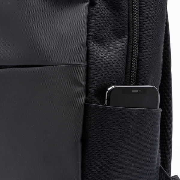 Mochila elaborada en PU Leather y políester reciclado RPET 600D. Compartimento principal con bolsillo acolchado de 15". Bolsillo frontal. Espalada y asas de hombro acolchadas.