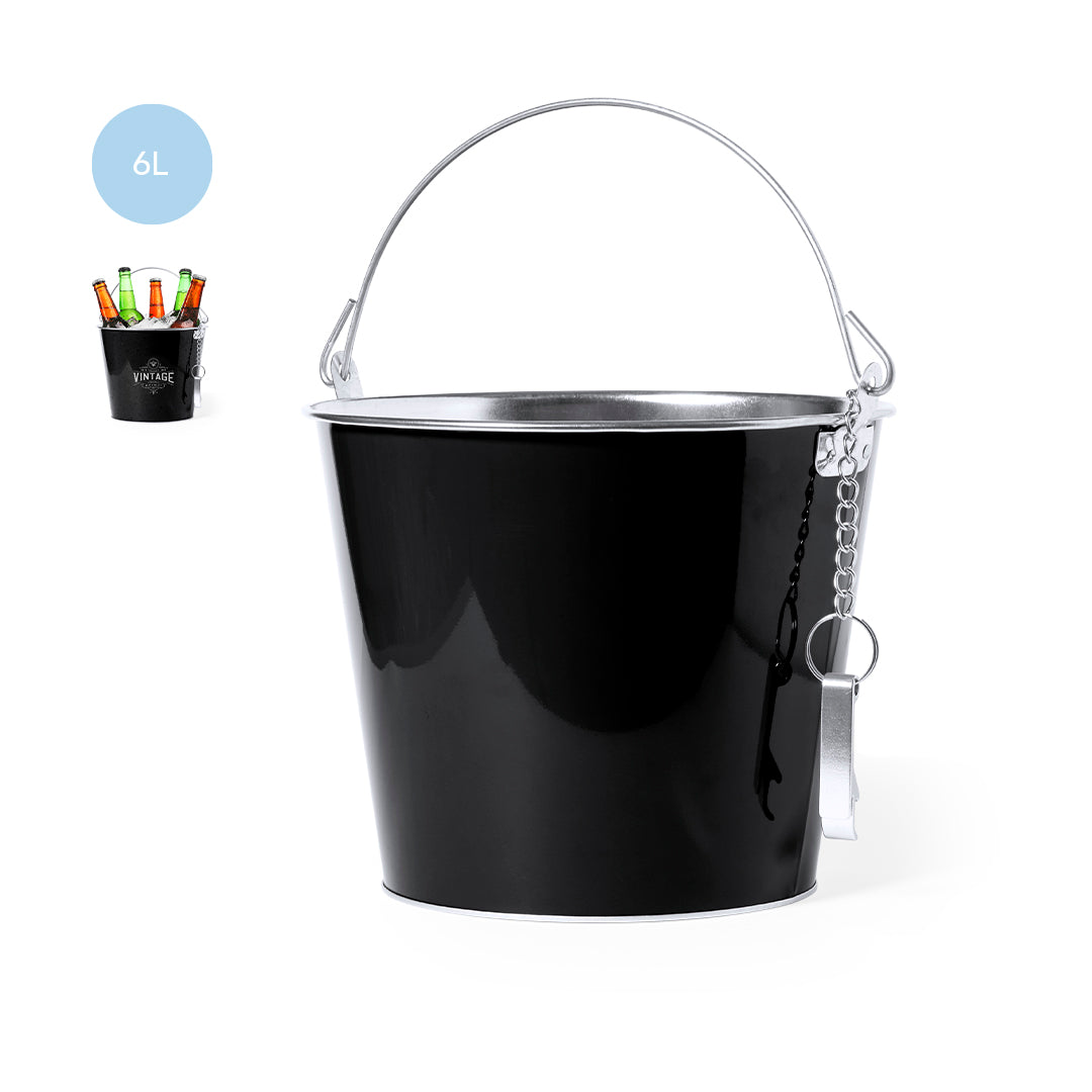 Cubo metálico de 6l de capacidad, con interior galvanizado y exterior disponible en variada gama de colores. Con asa, incluido abridor de aluminio y cadena en color plata.
