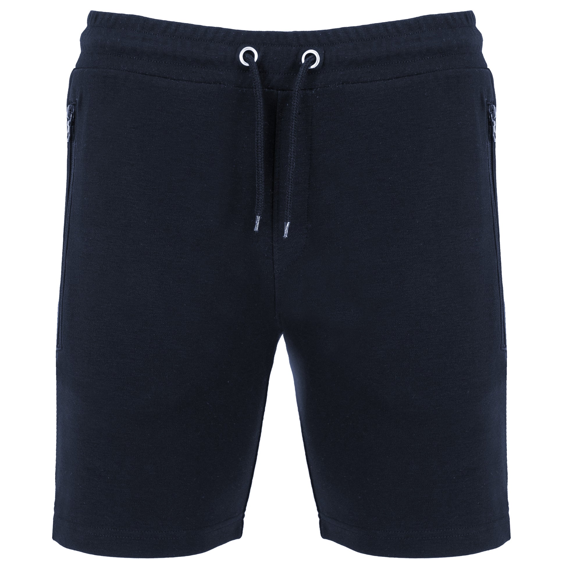 Pantalón corto con cinturilla elástica y cordón con ojales metálicos. Dos bolsillos laterales con cremalleras invertida a tono y tirador. Banda lateral a tono. Adorno de bragueta cosida. Un bolsillo trasero con broche de presión.