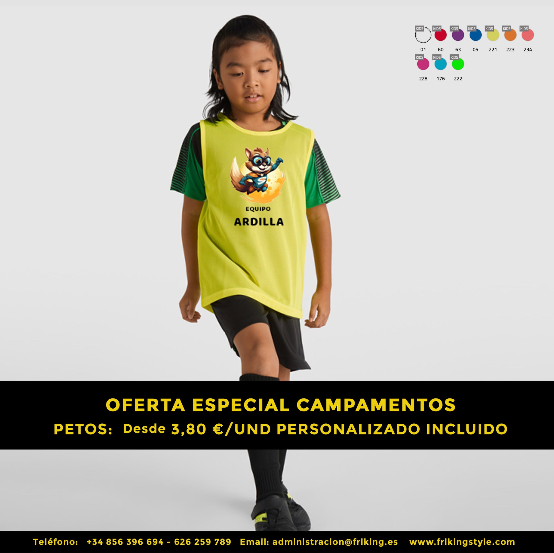 En Friking Style, entendemos la importancia de que cada campamento de verano tenga su propia identidad. Por eso, te ofrecemos petos personalizadas de alta calidad, perfectas para tus actividades y eventos. ¡Y lo mejor de todo es que no necesitas pedir grandes cantidades! ¡Puedes pedir desde una sola unidad!