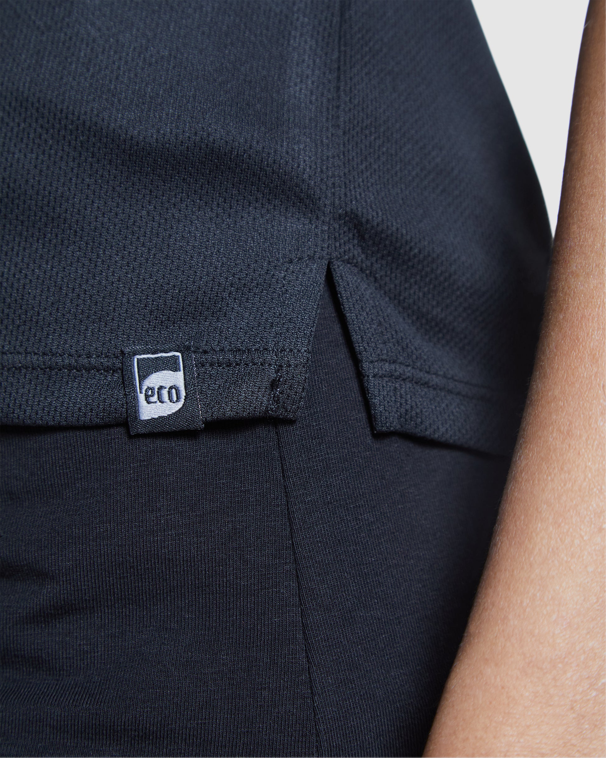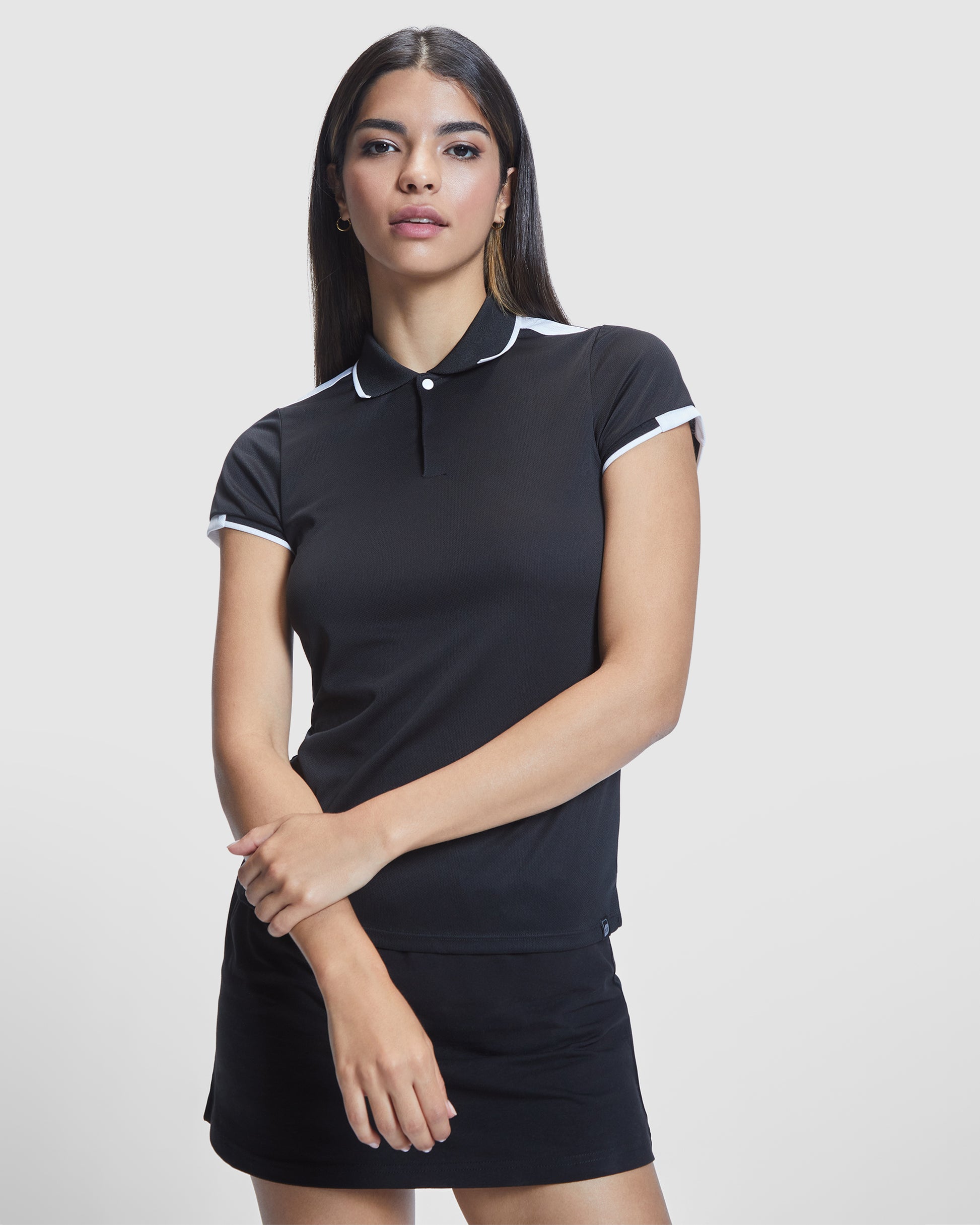 Polo técnico de mujer entallado de manga corta en poliéster reciclado antibacteriano. Cuello y detalle ribete de mangas en canalé 1x1. Cubrecosturas reforzado en cuello. Tapeta con 2 botones automáticos. Piezas de hombros y detalles a contraste. Aperturas laterales en el bajo.